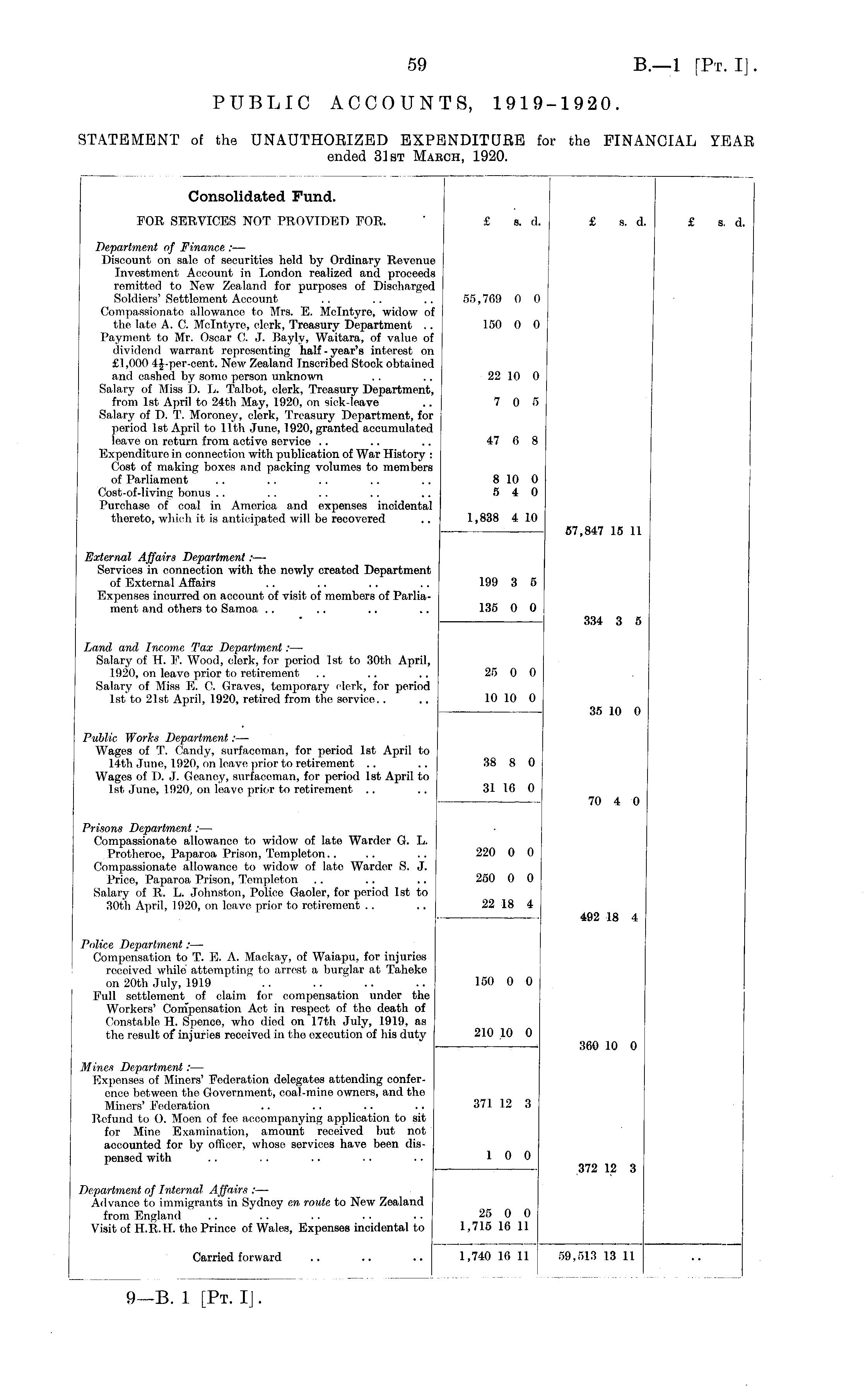 Consolidated Fund. FOR SERVICES NOT PROVIDED FOR. £ s. d. £ s. d. £ s. d. Department of Finance : — Discount on sale of securities held by Ordinary Revenue Investment Account in London realized and proceeds remitted to New Zealand for purposes of Discharged Soldiers' Settlement Account Compassionate allowance to Mrs. E. Mclntyre, widow of the late A. C. Mclntyre, clerk, Treasury Department .. Payment to Mr. Oscar C. J. Bayly, Waitara, of value of dividend warrant representing half - year's interest on £1,000 4J-per-cent. New Zealand Inscribed Stock obtained and cashed by some person unknown Salary of Miss D. L. Talbot, clerk, Treasury Department, from 1st April to 24th May, 1920, on sick-leave Salary of D. T. Moroney, clerk, Treasury Department, for period 1st April to 11th June, 1920, granted accumulated leave on. return from active service Expenditure in connection with publication of War History : Cost of making boxes and packing volumes to members of Parliament Cost-of-living bonus Purchase of coal in America and expenses incidental thereto, which it is anticipated will be recovered 55,769 0 0 150 0 0 22 10 0 7 0 5 47 6 8 8 10 0 5 4 0 1,838 4 10 External Affairs Department: — Services in connection with tho nowly created Department of External Affairs Expenses incurred on account of visit of members of Parliament and others to Samoa 57,847 15 11 199 3 5 135 0 0 334 3 5 Land and Income Tax Department: — Salary of H. F. Wood, clerk, for poriod 1st to 30th April, 1920, on leave prior to retirement Salary of Miss E. C. Graves, temporary clerk, for period 1st to 21st April, 1920, retired from the service.. 25 0 0 10 10 0 35 10 0 Public Worlcs Department: — Wages of T. Candy, surfaceman, for period 1st April to 14th June, 1920, on leave prior to retirement Wages of D. J. Geaney, surfaceman, for period 1st April to 1st June, 1920, on leave prior to retirement 38 8 0 70 4 0 31 16 0 Prisons Department: — Compassionate allowance to widow of late Warder G. L. Protheroe, Paparoa Prison, Templeton Compassionate allowance to widow of late Warder S. J. Price, Paparoa Prison, Templeton Salary of R. L. Johnston, Police Gaoler, for period 1st to 30th April, 1920, on leave prior to retirement 220 0 0 250 0 0 22 18 4 492 18 4 Police Department: — Compensation to T. E. A. Mackay, of Waiapu, for injuries received while attempting to arrest a burglar at Taheko on 20th July, 1919 Full settlement of claim for compensation under the Workers' Compensation Act in respect of the death of Constable H. Spence, who died on 17th July, 1919, as the result of injuries received in tho oxecution of his duty 150 0 0 210 10 0 360 10 0 Mines Department: — Expenses of Miners' Federation delegatos attending conference betwoen the Government, coal-mine owners, and the Miners' Federation Refund to O. Moon of fee accompanying application to sit for Mine Examination, amount received but not accounted for by officer, whose services have been dispensed with 371 12 3 1 0 0 372 12 3 Department of Internal Affairs : — Advance to immigrants in Sydney en route to New Zealand from England Visit of H.R.H. the Prince of Wales, Expenses incidental to 25 0 0 1,715 16 11 Carried forward 1,740 16 11 59,513 13 11