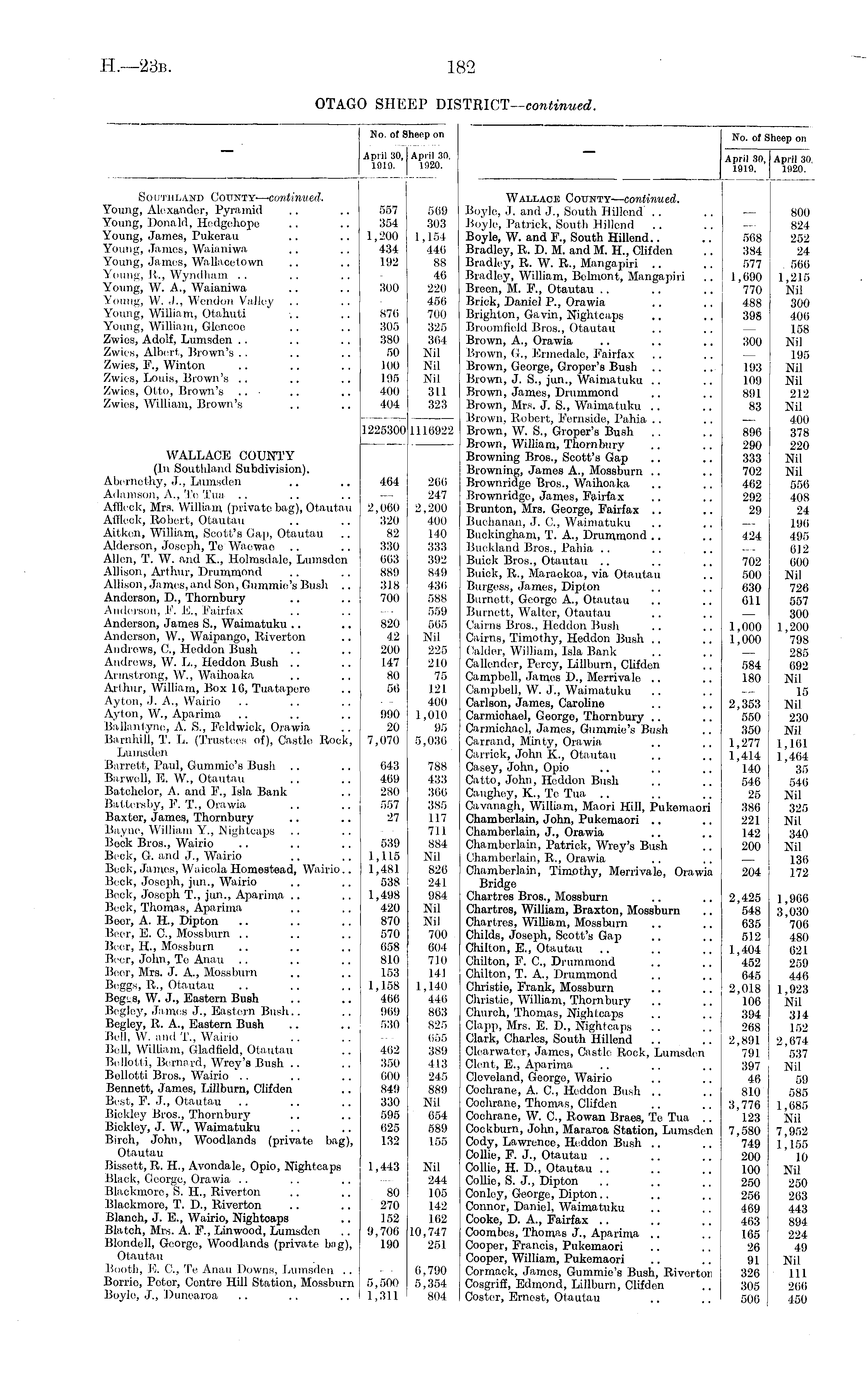 No. of S Iheep on April 30, 1919. I April 30, 1920. Southland County— continued. Young, Alexander, Pyramid Young, Donald, Hedgehope Young, James, Pukerau Young, Jamos, Waianiwa Young, Jamos, Wallacetown Young, P., Wyndham Young, W. A., Waianiwa Young, W. J., Wendon Valley Young, William, Otahuti Young, William, Glencoe Zwies, Adolf, Lumsden Zwles, Albert, Brown's Zwies, F., Winton Zwics, Louis, Brown's .. Zwies, Otto, Brown's .. ■ Zwies, William, Brown's 557 354 1,200 434 192 300 870 305 380 50 100 195 400 404 509 303 1,154 440 88 4.6 220 456 700 325 364 Nil Nil Nil 311 323 1225300 1116922 WALLACE COUNTY (In Southland Subdivision). Aberncthy, J., Lumsden Adamson, A., Te Tua Affleck, Mrs. William (private bag), Otautau Affleck, Robert, Otautau Aitken, William, Scott's Gap, Otautau Aldorson, Joseph, Te Waewa.e Allen, T. W. and K., Holmsdalc, Lumsden Allison, Arthur, Drummond Allison, James,and Son, Gummic's Bush .. Anderson, D., Thornbury Anderson, .P. K.. Fairfax Anderson, James S., Waimatuku Anderson, W., Waipango, Riverton Andrews, G, Heddon Bush Andrews, W. L., Heddon Bush Armstrong, W., Waihoaka Arthur, William, Box 16, Tuataperc Ay ton, J. A., Wairio Ayton, W., Aparima Ballantyne, A. S., Fcldwick, Orawia Barnhill, T. L. (Trustees of), Castle Rook, Lumsden Barrett, Paul, Gummic's Bush Barwell, E. W., Otautau Batchelor, A. and F., Isla Bank Battersby, F. T., Orawia Baxter, James, Thornbury Bayne, William Y., Nightcaps Bock Bros., Wairio Beck, G. and J., Wairio Beck, James, Waieola Homestead, Wairio.. Beck, Joseph, jun., Wairio Beck, Joseph T., jun., Aparima Beck, Thomas, Aparima Boor, A. H., Dipton Boor, E. G, Mossburn Beer, H., Mossburn Beer, John, To Anau Boor, Mrs. J. A., Mossburn Bcggs, R., Otautau BegLS, W. J., Eastern Bush Begley, James J., Eastern Bush.. Begley, R. A., Eastern Bush Bell, W. and T, Wairio Bell, William, Gladfield, Otautau Bellottl, Bernard, Wroy's Bush Bollotti Bros., Wairio Bennett, James, Lillburn, Clifden Best, F. J., Otautau Biekley Bros., Thornbury Bickley, J. W., Waimatuku Birch, John, Woodlands (private bag), Otautau Bissett, R. H., Avondale, Opio, Nightcaps Black, George, Orawia Blackmore, S. IL, Riverton Blackmore, T. D., Riverton Blanch, J. E., Wairio, Nightcaps Blatch, Mrs. A. F., Linwood, Lumsden Blondell, George, Woodlands (private bag), Otautau 1'icKith, E. G, Te Anau Downs, Lumsden .. Borrio, Peter, Contre Hill Station, Mossburn Boyle, J., Dunearoa 464 2,060 320 82 330 663 889 318 700 820 42 200 147 80 56 990 20 7,070 043 469 280 557 27 539 1,115 1,481 538 1,498 420 870 570 658 810 153 1,158 466 969 530 200 247 2,200 400 140 333 392 849 436 588 559 565 Nil 225 210 75 121 400 1,010 95 5,030 788 433 366 385 117 711 884 Nil 826 241 984 Nil Nil 700 004 710 141 1,140 446 863 825 655 389 413 245 889 Nil 654 589 155 402 350 000 849 330 595 625 132 1,443 80 270 152 9,706 190 Nil 244 105 142 162 10,747 251 5,500 1,311 6.790 5,354 804