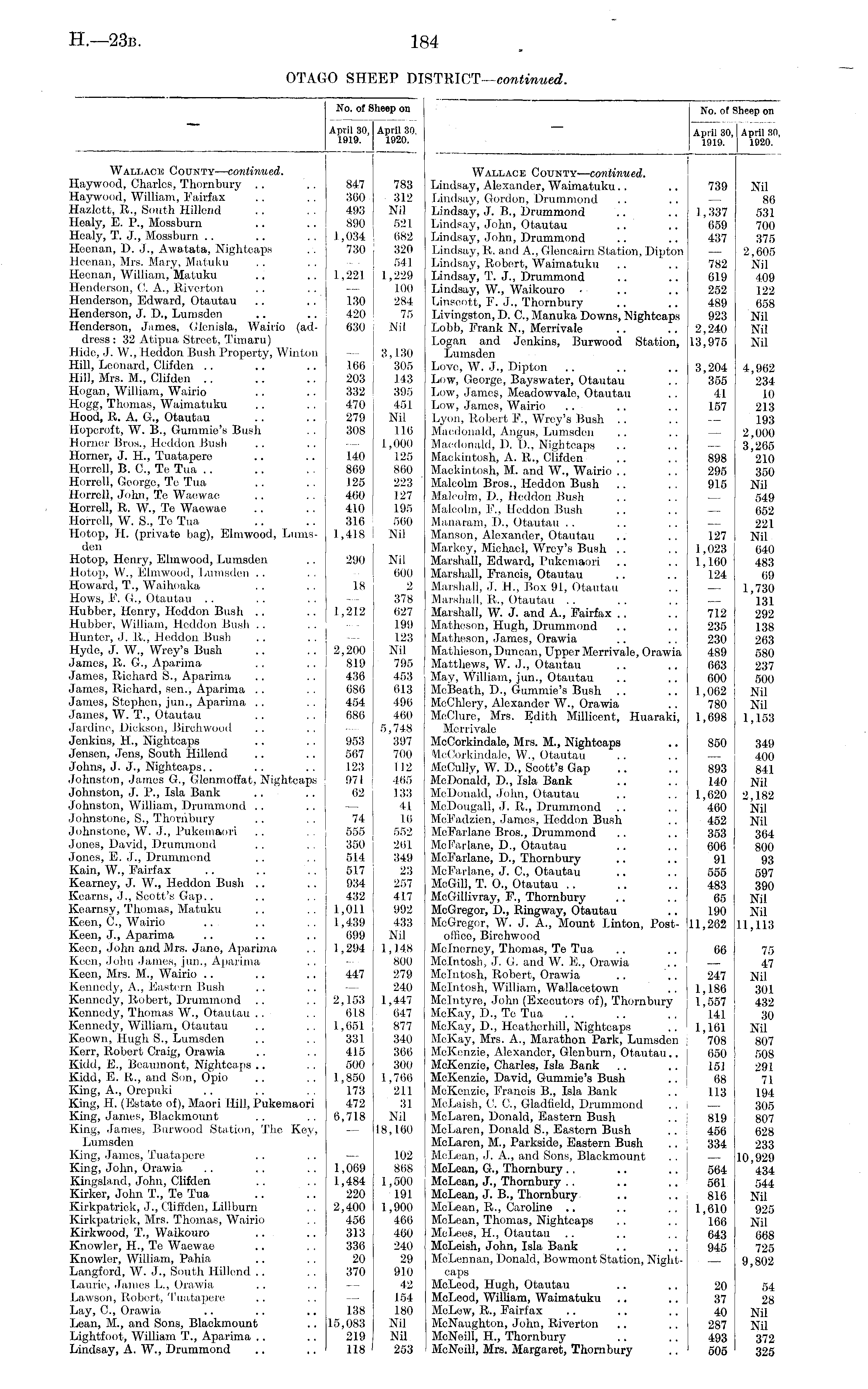 No. of f April 30, 1919. Sheep on I April 30, 1920. Wallach County— continued. Haywood, Charles, Thornbury .. Haywood, William, Fairfax Hazlctt, R., South Hillend Healy, E. P., Mossburn Healy, T. J., Mossburn Heenan, D. J., Awatata, Nightcaps Heenan, Mrs. Mary, Matuku Heenan, William, Matuku Henderson, C. A., Riverton Honderson, Edward, Otautau Henderson, J. D., Lumsden Henderson, James, Glenisla, Wairio (address : 32 Atipua Street, Timaru) Hide, J. W., Heddon Bush Property, Winton Hill, Leonard, Clifden Hill, Mrs. M., Clifden .. Hogan, William, Wairio Hogg, Thomas, Waimatuku Hood, It. A. G., Otautau Hopcroft, W. B., Gummie's Bush Horner Bros., Heddon Bush Horner, J. H., Tuatapere Horrell, B. C, Te Tua .. Horrell, George, Te, Tua Horrell, John, Te Waewae Horrell, R. W., To Waewae Horrell, W. S., To Tua Hotop, H. (private bag), Elmwood, Lumsden Hotop, Henry, Elmwood, Lumsden Hotop, W., Elmwood, Lumsden Howard, T., Waihoaka Hows, F. G, Otautau Hubber, Henry, Heddon Bush Hubbcr, William, Heddon Bush Hunter, J. It., Heddon Bush Hyde, J. W., Wrey's Bush James, R. G., Aparima James, Richard S., Aparima James, Richard, sen., Aparima James, Stephen, jun., Aparima James, W. T., Otautau Jardine, Dickson, Birch wood Jenkins, H., Nightcaps Jensen, Jens, South Hillend Johns, J. J., Nightcaps.. Johnston, James G., Glenmoffat, Nightcaps Johnston, J. P., Isla Bank Johnston, William, Drummond Johnstone, S., Thornbury Johnstone, W. J., Pukemaori Jones, David, Drummond Jones, E. J., Drummond Kain, W., P'airfax Kearney, J. W., Heddon Bush Kearns, J., Scott's Gap.. Kcarnsy, Thomas, Matuku Keen, G, Wairio Keen, J., Aparima Keen, John and Mrs. Jane, Aparima Keen, John James, jun., Aparima Keen, Mrs. M., Wairio Kennedy, A., Eastern Bush Kennedy, Robert, Drummond Kennedy, Thomas W., Otautau Kennedy, William, Otautau Keown, Hugh S., Lumsden Kerr, Robert Craig, Orawia Kidd, E., Beaumont, Nightcaps Kidd, E. R., and Son, Opio King, A., Orepuki King, II. (Estate of), Maori Hill, Pukemaori King, James, Blaekmount King, James, Burwood Station, The Key, Lumsden King, James, Tuatapere .. King, John, Orawia Kingsland, John, Clifden Kirker, John T., Te Tua Kirkpatrick, J., Clifiden, Lillburn Kirkpatrick, Mrs. Thomas, Wairio Kirkwood, T., Waikouro Knowlcr, II., Te Waewae Knowler, William, Pahia Langford, W. J., South Hillend Laurie, James L., Orawia Lawson, Robert, Tuatapere Lay, G, Orawia Loan, M., and Sons, Blaekmount Lightfoot, William T., Aparima Lindsay, A. W., Drummond 847 360 493 890 1,034 730 1,221 130 420 630 166 203 332 470 279 308 140 869 125 460 410 316 1,418 290 18 1,212 2,200 819 436 686 454 686 953 567 123 971 62 783 312 Nil 521 082 320 541 1,229 100 284 75 Nil 3,130 305 143 395 451 Nil 110 1,000 125 860 223 127 195 560 Nil Nil 600 2 378 627 199 123 Nil 795 453 613 496 460 5,748 397 700 112 465 133 41 16 552 261 349 23 257 417 992 433 Nil 1,148 800 279 240 1,447 647 877 340 366 300 1,766 211 31 Nil 18,160 74 555 350 514 517 934 432 1,011 1,439 699 1,294 447 2,153 618 1,651 331 415 500 1,850 173 472 6,718 1,069 1,484 220 2,400 456 313 336 20 370 102 868 1,500 191 1,900 466 460 240 29 910 42 154 180 Nil Nil 253 138 15,083 219 118