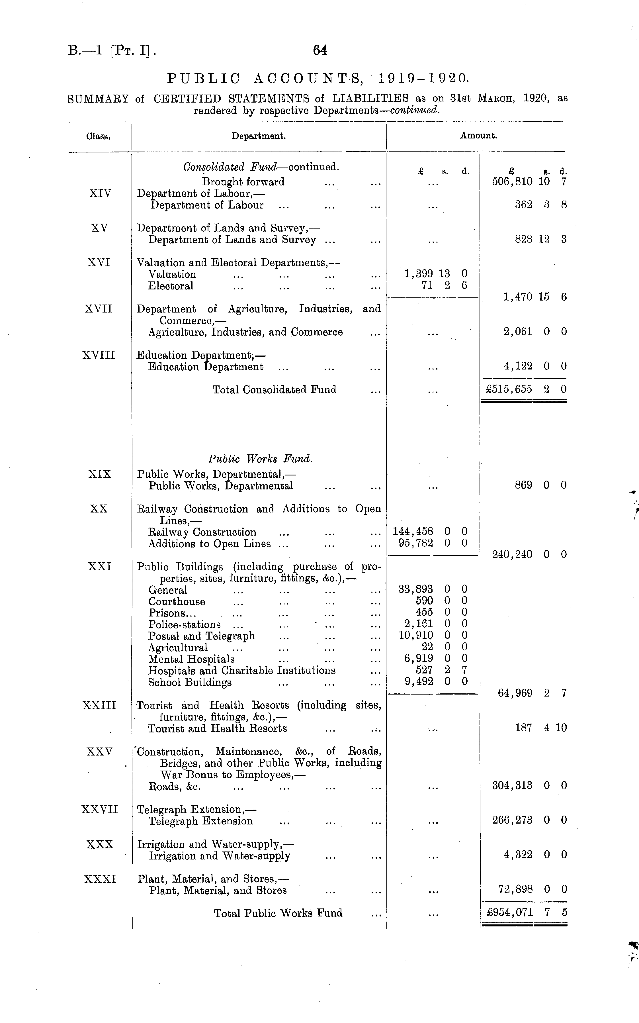 Class. Department. Ami mnt. XIV Consolidated Fund —continued. Brought forward Department of Labour, — Department of Labour £ s. d. £ s. d. 506,810 10 7 362 3 8 XV Department of Lands and Survey,— Department of Lands and Survey ... 828 12 3 XVI Valuation and Electoral Departments, — Valuation Electoral 1,399 13 71 2 0 6 XVII 1,470 15 6 Department of Agriculture, Industries, and Commerce, — Agriculture, Industries, and Commerce 2,061 0 0 XVIII Education Department,— Education Department 4,122 0 0 Total Consolidated Fund £515,655 2 0 Public Works Fund. XIX Public Works, Departmental,— Public Works, Departmental 869 0 0 XX Eailway Construction and Additions to Open Lines, — Eailway Construction Additions to Open Lines ... XXI Public Buildings (including purchase of properties, sites, furniture, fittings, &c), — General Courthouse Prisons... Police-stations ... .... ' ... Postal and Telegraph ... Agricultural Mental Hospitals Hospitals and Charitable Institutions School Buildings 144,458 95,782 0 0 0 0 240,240 0 0 33,893 590 455 2,161 10,910 22 6,919 527 9,492 0 0 0 0 0 0 0 2 0 0 0 0 0 0 0 0 7 0 64,969 2 7 XXIII Tourist and Health Eesorts (including sites, furniture, fittings, &c), — Tourist and Health Eesorts 187 4 10 XXV "Construction, Maintenance, &c, of Eoads, Bridges, and other Public Works, including War Bonus to Employees, — Eoads, &c. 304,313 0 0 XXVII Telegraph Extension, — Telegraph Extension 266,273 0 0 XXX Irrigation and Water-supply,— Irrigation and Water-supply 4,322 0 0 XXXI Plant, Material, and Stores, — Plant, Material, and Stores 72,898 0 0 Total Public Works Fund £954,071 7 5