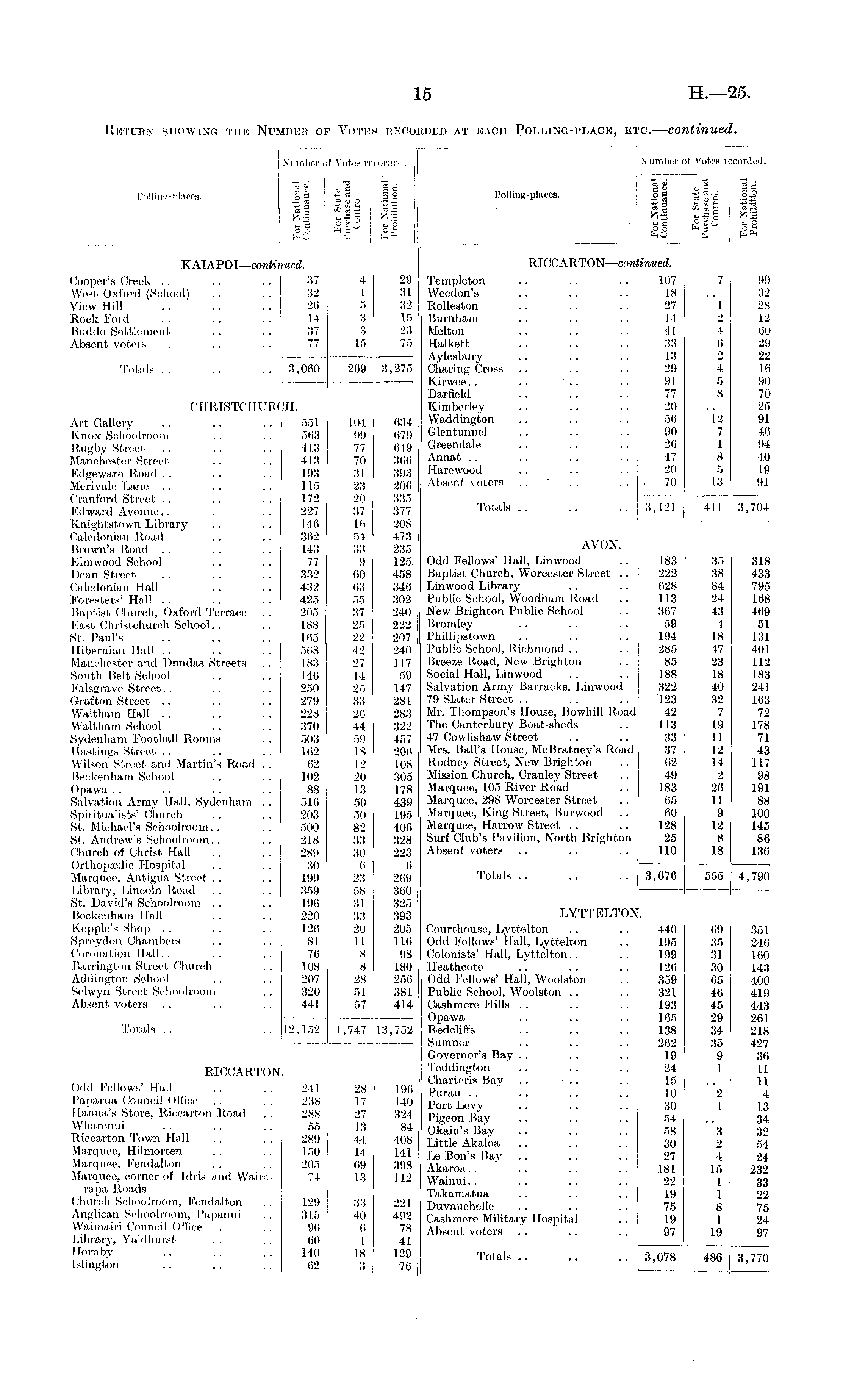 I'nllin^-pl.iees. Number oi Votes recorded. li a,1 I a a a m a _■ go .a a S « c ■- ._ I| fll II II *£ : ft£ Polling-places. Number of Votes recorded. !§ ilil si ll S |S : ll »3 a, -8 o -a mo Pm o m a a o ftp' of fto £ I h« KAIAPOI— conti, Hnued. lued. RI00ARTON— cont Cooper's Creek West Oxford (School) View Hill Rock Ford Buddo Settlement Absent voters 37 4 29 32 1 31 26 5 32 14 3 15 37 3 23 77 15 75 3,000 269 3,275 1H. 551 104 034 563 99 079 413 77 049 443 70 300 193 31 393 I 15 23 200 172 20 335 227 37 377 140 16 208 302 54 473 143 33 235 77 9 125 332 00 4 58 432 03 340 425 55 302 205 37 210 188 25 222 165 22 207 568 42 240 I S3 27 117 146 14 59 250 25 147 279 33 281 228 20 2S3 370 44 322 503 59 457 102 18 200 02 12 108 102 20 305 88 13 178 510 50 439 203 50 195 500 82 400 218 33 328 289 30 223 30 6 0 199 23 209 359 58 300 196 31 325 220 33 393 126 20 205 81 11 110 76 8 98 108 8 180 207 28 250 320 51 381 441 57 414 12,152 1,747 13,752 24 1 28 190 238 17 140 28S 27 324 55 13 84 289 44 408 150 14 141 205 : 09 398 74 13 112 129 33 221 315 40 492 90 0 78 60 I. 41 140 18 129 62 3 76 29 31 32 15 23 75 Tcmpleton Weedon's Rolleston Burtiham Melton Halkett Aylesbury Charing Cross Kirwee.. .. Darfield Kimberley Waddington Glentunnel Greciulale Annat Harewood Absent voters Totals AVON. Odd Fellows' Hall, Linwood Baptist Church, Worcester Street .. Linwood Library Public School, Woodham Road New Brighton Public School Bromley Phillipstown Public School, Richmond Breeze Road, New Brighton Social Hall, Linwood Salvation Army Barracks, Linwood 79 Slater Street Mr. Thompson's House, Bowhill Bond The Canterbury Boat-sheds 47 Cowlishaw Street Mrs. Ball's House, McBratney's Bond Rodney Street, New Brighton Mission Church, (Vanley Street Marquee, 105 River Road Marquee, 298 Worcester Street Marquee, King Street, Burwood Marquee, Harrow Street .. Surf Club's Pavilion, North Brighton Absent voters Totals LYTTELTON Courthouse, Lyttelton Odd Fellows' Hall, Lyttelton Colonists' Hall, Lyttelton. . Heathcote Odd Fellows' Hall. Woolston Public School, Woolston Cashmere Hills Opawa Rodcliffs Sumner Governor's Bay Teddington Charteris Bay Puraii Port Levy Pigeon Bay Okain's Bay Little Akalon, Le Bon's Bay Akaroa.. Wainui.. Takamatua Duvauchelle Cashmere Military Hospital Absent voters Totals .. 107 7 99 18 . . 32 27 1 28 14 2 12 41 I 00 33 0 29 13 2 22 29 4 10 91 5 90 77 S 70 20 .. 25 56 12 91 90 7 40 20 1 94 47 8 40 20 5 19 70 13 91 Totals .. 3,275 CHRISTCHURt 034 079 049 300 393 206 335 377 208 473 235 125 ■158 340 302 210 222 207 240 117 59 147 281. 283 322 457 200 I OS 305 178 439 195 400 328 223 0 209 300 325 393 205 110 98 180 250 381 414 Art Gallery Knox Schoolroom Rugby Street Manchester Street Edgeware Road . . Merivale Lane Cranford Street Edward Avenue. . Knightstown Library Caledonian Road Brown's Road Flinwood School Dean Street Caledonian Hall Foresters' Hall Baptist Church, Oxford Terrace East Christehurch School.. St. Paul's Hibernian Hall Manchester and Dundas Streets South Belt School Palsgrave Street.. G rafton Street Waltham Hall Waltham School Sydenham Football Rooms Hastings Street Wilson Street and Martin's Road . . Beckenham School Opawa Salvation Army Hall, Sydenham . . Spiritualists' Church St. Michael's Schoolroom.. St. Andrew's Schoolroom Church of Christ Hall Orthopedic Hospital Marquee, Antigua Street Library, Lincoln Road St. David's Schoolroom Beckenham Hall Kepple's Shop S prey don Chambers ('oronation Hall Barrington Street Church Addington School Selwyn Street Schoolroom Absent voters 3,121 411 3,704 183 35 318 222 38 433 628 84 795 113 24 108 367 43 409 59 4 51 194 18 131 285 47 401 85 23 112 188 18 183 322 40 241 123 32 103 42 7 72 113 19 178 33 11 71 37 12 43 02 14 117 49 2 98 183 20 191 05 11 88 00 9 100 128 12 145 25 8 86 110 18 130 3,070 555 4,790 . Totals .. RICCARTOr, 13,752 190 140 324 84 408 III 398 112 440 195 199 126 359 321 193 165 138 202 19 24 15 10 30 54 58 30 27 181 22 19 75 19 97 09 35 31 30 05 46 45 29 34 35 9 I 2 I 351 240 100 143 400 419 443 201 218 427 36 11 11 4 13 34 32 54 24 232 33 22 75 24 97 Odd Fellows' Hall Paparua Council Office Hanna's Store, Riecarton Road Wharonui Riecarton Town Hall Marquee, Hilmorten Marquee, Fendalton Marquee, corner of Idris and Wairarapa Roads Church Schoolroom, Fendalton Anglican Schoolroom, Papanui Waimairi Council Office Library, Yaldhurst Hornby Islington 3 2 4 15 I 1 8 1 19 221 492 78 41 129 76 3,078 ISO 3,770
