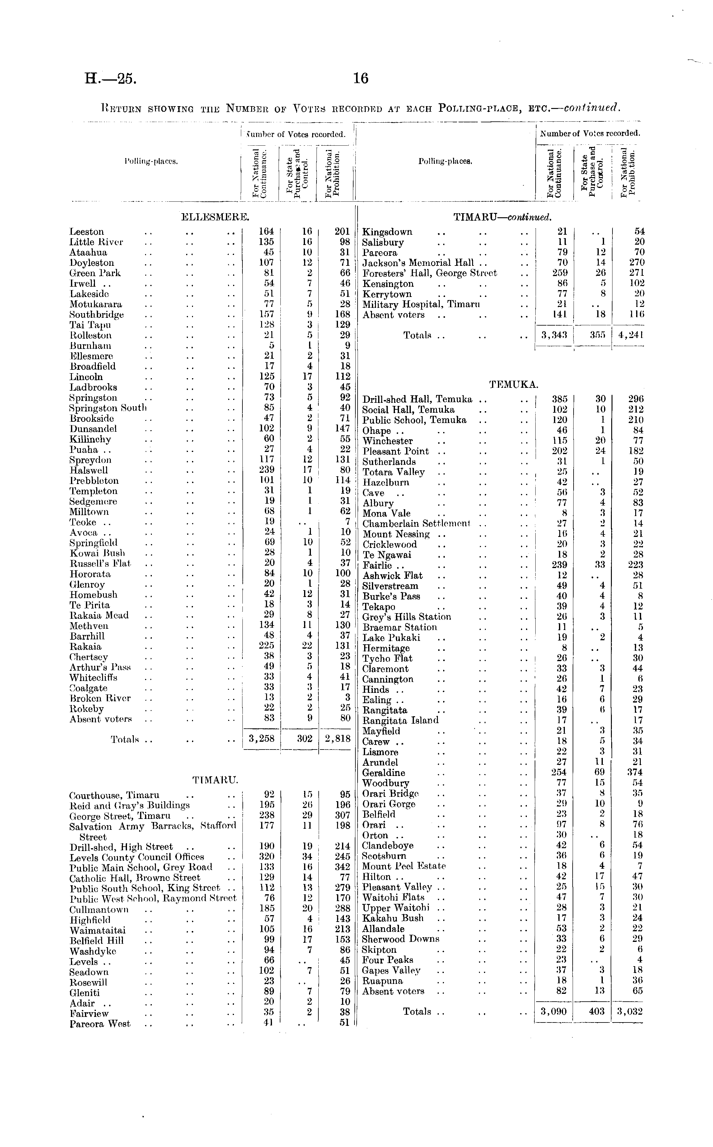 dumber of Votes re icorded. N umber i of Votes re eeorded. Polling-places. § a -Saga S || r * m fc-t: o M c O hU O O ft 3 ftO ft - 1 1 a || aS 'AS m e "a a Polling-places. II A§ M B O o ftO "o (I . sss Sis ft a^ Jj ee.d i fca r S ft ELLESMERE. TIMARU — continued. 1 12 14 20 5 8 54 20 70 270 271 102 20 12 llli Leeston .. .. .. 164 16 Little River .. .. .. 135 16 Ataahua .. .. .. 45 10 Doyleston . . .. .. 107 12 Green Park . . .. . . 81 2 Irwell .. .. .. . . 54 7 Lakeside .. .. • . 51 7 Motukarara .. .. .. 77 5 Southbridge . . .. 157 9 Tai Tapu .. .. . . 128 3 Rolleston .. .. .. 21 5 Burnham . . .. .. 5 1 Ellesmere .. . . .. 21 2 Broadfield . . .. .. 17 4 Lincoln .. .. .. 125 17 Ladbrooks .. .. .. 70 3 Springston .. .. .. 73 5 Springston South .. .. 85 4 Brookside . . .. .. 47 2 Dunsandel .. .. . . 102 9 Killinchy . . .. .. 60 2 Puaha .. .. .. .. 27 4 Spreydon .. .. .. 117 12 Halswell .. .. .. 239 17 Prebbleton .. .. . . 101 10 Templeton .. .. .. 31 1 Sedgemere .. .. .. 19 1 Milltown .. .. .. 68 1 Teoke .. .. .. . • 19 Avoea .. .. .. .. 24 J Springfield . . . . . . 69 10 Kowai Bush . . . . . . 28 1 Russell's Flat .. .. .. 20 4 Hororata .. .. . . 84 10 Glenroy .. . . • • 20 I Homebush . . .. .. 42 12 TePirita .. .. .. 18 3 Rakaia Mead .. .. .. 29 8 Methven .. .. .. 134 II Barrhill .. .. .. 48 4 Rakaia .. .. . . 225 22 Chertsey .. .. • • 38 3 Arthur's Pass . . .. .. -19 5 Whitecliffs .. .. .. 33 4 Goalgate .. .. .. 33 3 Broken River .. .. .. 13 2 Rokeby . • • • • • 22 2 Absent voters .. .. .. 83 9 16 10 10 12 2 7 7 5 9 3 5 1 2 4 17 3 5 4 2 j 9 2 4 12 17 10 1 j I 1 "] 10 1 4 10 I 12 3 8 11 4 22 3 5 4 3 2 2 9 201 98 31 71 66 ' 40 51 28 | 168 201 98 31 71 66 [ 40 51 28 | 168 129 29 9 31 18 112 45 92 40 71 147 55 22 131 j 80 114 19 31 62 7 10 52 10 37 100 28 31 I 14 27 130 37 131 23 18 41 17 3 25 80 Kingsdown .. .. .. 21 Salisbury .. .. .. 11 Pareora .. .. .. 79 Jackson's Memorial Hall .. .. 70 Foresters' Hall, George Street .. 259 Kensington . . .. .. 80 Kerrytown .. .. .. 77 Military Hospital, Timaru .. 21 Absent voters .. .. .. 141 18 129 29 Totals .. .. .. 3,343 355 4,241 9 31 18 112 45 TEMUKA. 30 10 I I 20 24 I 290 212 210 84 77 182 50 19 27 52 83 17 14 21 22 28 223 28 51 8 12 11 5 4 13 30 44 6 23 29 17 17 35 34 31 21 374 54 35 9 18 70 IS 54 19 7 47 30 30 21 24 22 29 0 4 18 30 65 92 40 71 147 55 22 131 j 80 | 114 19 31 j 62 i 7 10 52 10 37 100 28 31 14 27 130 37 131 23 18 41 17 3 25 80 2,818 95 196 307 198 214 245 342 77 279 170 288 143 213 153 86 I 45 51 26 79 in Drill-shed Hall, Temuka .. .. 385 Social Hall, Temuka .. .. 102 Public School, Temuka . . .. 120 Ohape .. .. .. .. 40 Winchester .. .. .. 115 Pleasant Point .. .. .. 202 Suthorlands .. . . .. 31 • Totara Valley .. .. .. i 25 Hazelburn ' .. . . .. ! 42 1 Cave .. .. . . .. 50 Albury .. .. .. 77 Mona Vale .. . . .. 8 Chamberlain Settlemenl . . .. 27 Mount Nessing .. . . .. 10 Cricklewood .. . . .. 20 Te Ngawai .. . . .. 18 Fairlie .. .. .. .. 239 Ashwick Flat .. .. .. 12 Silverstream .. .. .. 49 Burke's Pass .. .. .. 40 | Tekapo .. . . .. 39 Grey's Hills Station .. .. 20 Braemar Station .. .. 11 LakePukaki .. .. .. 19 Hermitage .. .. .. 8 Tyeho Flat .. .. .. 26 Claremont .. . . .. 33 Cannington .. .. .. 26 Hinds .. .. . . .. 42 Ealing .. .. . . .. 10 Rangitata .. . . .. 39 Rangitata Island .. .. 17 Mayfield .. .. .. 21 Carew .. .. .. . . IS Lismore • • •. •. 22 Arundel • ■ ■ • .. 27 Geraldine . . . . . . 254 Woodbury .. . . . . 77 Orari Bridge .. .. .. 37 Orari Gorge .. .. .. 29 Belfield .. . . .. 23 Orari .. .. .. .. 97 Orton .. .. .. .. 30 Clandeboye .. .. .. 42 Scotsliurn .. .. .. 30 Mount Peel Estate . . . . 18 Hilton .. .. . . .. 42 Pleasant Valley .. . . .. 25 Waitohi Flats' .. . . . . 47 Upper Waitohi . . . . . . 28 Kaka.hu Bush . . .. . . 17 Allandale .. .. .. 53 Sherwood Downs .. .. 33 I Skipton .. . . .. 22 Four Peaks .. .. .. 23 Gapes Valley .. .. .. 37 Ruapuna .. . . .. 18 Absent voters .. . . . . 82 3 I 3 -) 4 3 2 33 4 4 4 3 ■2 3 I 7 0 0 Totals .. .. .. 3,258 302 TIMARU. 302 15 20 29 II 2,818 95 196 307 198 3 5 3 11 09 15 8 10 2 8 Courthouse, Timaru .. .. 92 15 Reid and Gray's Buildings .. 195 20 George Street, Timaru .. .. 238 29 Salvation Army Barracks, Stafford 177 I I Street Drill-shed, High Street .. .. 190 19 Levels County Council Offices .. 320 34 Public Main School, Grey Road .. 133 10 Catholic Hall, Browne Street .. 129 14 Public South School, King Street .. 112 13 Public West School, Raymond Street 76 12 Cullmantown .. .. .. 185 20 Highfield .. •• •• 57 4 Waimataitai .. .. • • 105 10 Belfield Hill .. .. •• 99 17 Washdyke .. .. •■ 94 7 Levels .. .. • • • • 66 Seadown .. .. •• 102 7 Rosewill .. • • • • 23 Gleniti .. •• •■ 89 7 Adair .. . . • • • • 20 F'airview .. • • • • 35 Pareora West ., .. •. 41 19 | 34 16 I 14 13 12 20 4 10 17 7 *7 7 2 2 214 245 342 77 279 170 288 143 213 153 86 45 51 26 79 10 38 51 6 6 4 17 15 7 3 3 2 6 2 3 1 13 10 38 Totals .. ., .. 3,090 3,090 403 3,032