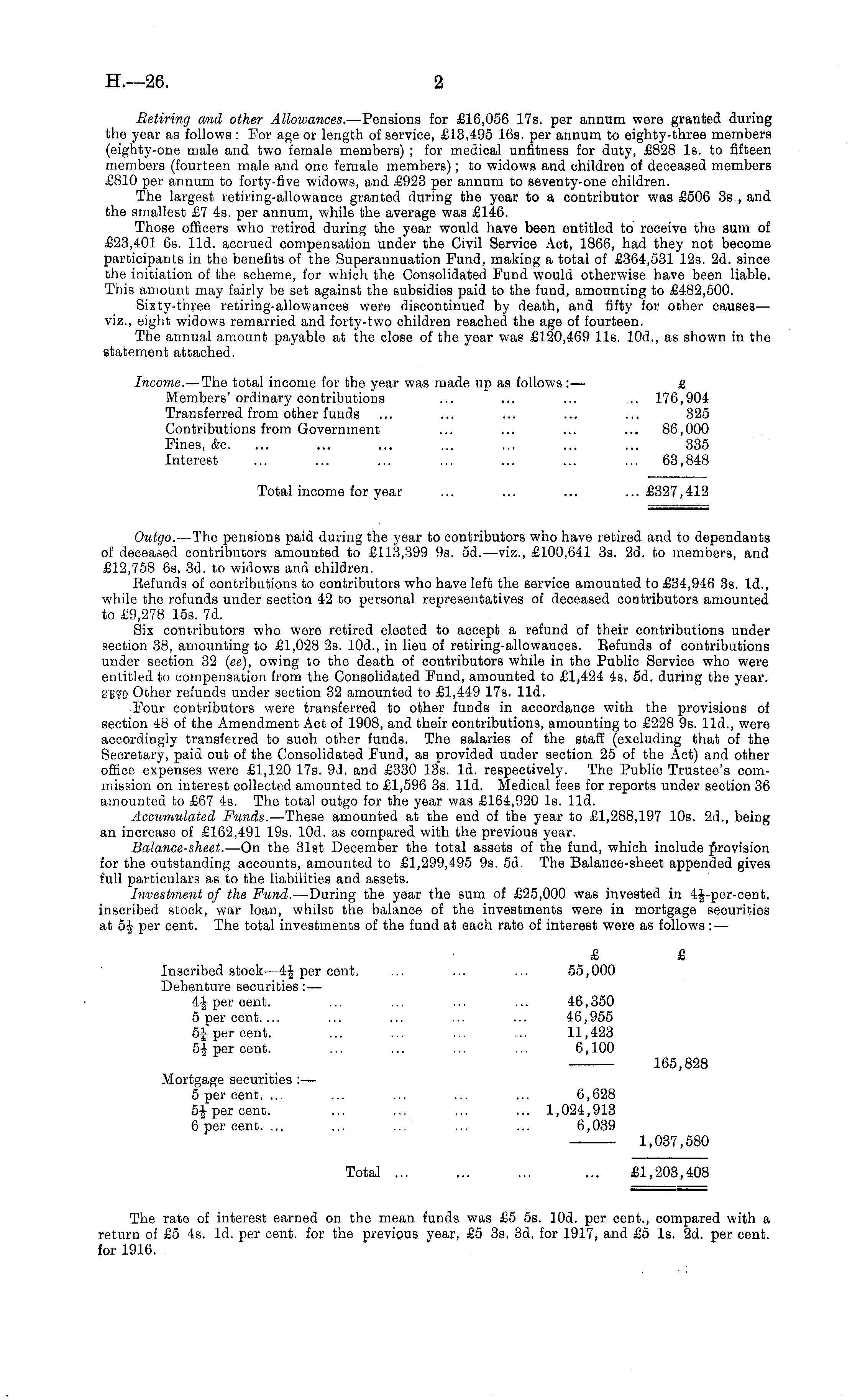 Retiring and other Allowances. —Pensions for £16,056 17s. per annum were granted during the year as follows : For age or length of service, £13,495 16s. per annum to eighty-three members (eighty-one male and two female members) ; for medical unfitness for duty, £828 Is. to fifteen members (fourteen male and one female members); to widows and children of deceased members £810 per annum to forty-five widows, and £923 per annum to seventy-one children. The largest retiring-allowance granted during the year to a contributor was £506 35., and the smallest £7 4s. per annum, while the average was £146. Those officers who retired during the year would have been entitled to receive the sum of £23,401 6s. lid. accrued compensation under the Civil Service Act, 1866, had they not become participants in the benefits of the Superannuation Fund, making a total of £364,531 12s. 2d. since the initiation of the scheme, for which the Consolidated Fund would otherwise have been liable. This amount may fairly be set against the subsidies paid to the fund, amounting to £482,500. Sixty-three retiring-allowances were discontinued by death, and fifty for other causes— viz., eight widows remarried and forty-two children reached the age of fourteen. The annual amount payable at the close of the year was £120,469 lis. 10d., as shown in the statement attached. Income. — The total income for the year was made up as follows :— £ Members'ordinary contributions ... ... ... ... 176,904 Transferred from other funds ... ... ... ... ... 325 Contributions from Government ... ... ... ... 86,000 Fines, &c. ... ... ... ... ... ... ... 335 Interest ... ... ... ... ... ... ... 63,848 Total income for year ... ... ... ...£327,412 Outgo. —The pensions paid during the year to contributors who have retired and to dependants of deceased contributors amounted to £113,399 9s. sd.—viz., £100,641 3s. 2d. to members, and £12,758 6s. 3d. to widows and children. Refunds of contributions to contributors who have left the service amounted to £34,946 3s. Id., while the refunds under section 42 to personal representatives of deceased contributors amounted to £9,278 15s. 7d. Six contributors who were retired elected to accept a refund of their contributions under section 38, amounting to £1,028 2s. 10d., in lieu of retiring-allowances. Refunds of contributions under section 32 (cc), owing to the death of contributors while in the Public Service who were entitled to compensation from the Consolidated Fund, amounted to £1,424 4s. sd. during the year. S'BTO Other refunds under section 32 amounted to £1,449 17s. lid. Four contributors were transferred to other funds in accordance with the provisions of section 48 of the Amendment Act of 1908, and their contributions, amounting to £228 9s. lid., were accordingly transferred to such other funds. The salaries of the staff (excluding that of the Secretary, paid out of the Consolidated Fund, as provided under section 25 of the Act) and other office expenses were £1,120 17s. 9d. and £330 13s. Id. respectively. The Public Trustee's commission on interest collected amounted to £1,596 3s. lid. Medical fees for reports under section 36 amounted to £67 4s. The total outgo for the year was £164,920 is. lid. Accumulated Funds. —These amounted at the end of the year to £1,288,197 10s. 2d., being an increase of £162,491 19s. lOd. as compared with the previous year. Balance-sheet. —On the 31st December the total assets of the fund, which include provision for the outstanding accounts, amounted to £1,299,495 9s. sd. The Balance-sheet appended gives full particulars as to the liabilities and assets. Investment of the Fund. —During the year the sum of £25,000 was invested in 4J-per-cent. inscribed stock, war loan, whilst the balance of the investments were in mortgage securities at 5f per cent. The total investments of the fund at each rate of interest were as follows : — £ £ Inscribed stock—4f per cent, ... ... ... 55,000 Debenture securities :— 4$ per cent. ... ... ... ... 46,350 5 per cent.... ... ... ... ... 46,955 5£ per cent. ... ... ... ... 11,423 per cent. ... ... ... ... 6,100 165,828 Mortgage securities : — 5 per cent. ... ... ... ... ... 6,628 5| per cent. ... ... ... ... 1,024,913 6 per cent. ... ... ... ... ... 6,039 1,037,580 Total ... ... ... ... £1,203,408 The rate of interest earned on the mean funds was £5 ss. lOd. per cent., compared with a return of £5 4s. Id. per cent, for the previous year, £5 3s, 3d. for 1917, and £5 Is. 2d. per cent. for 1916.