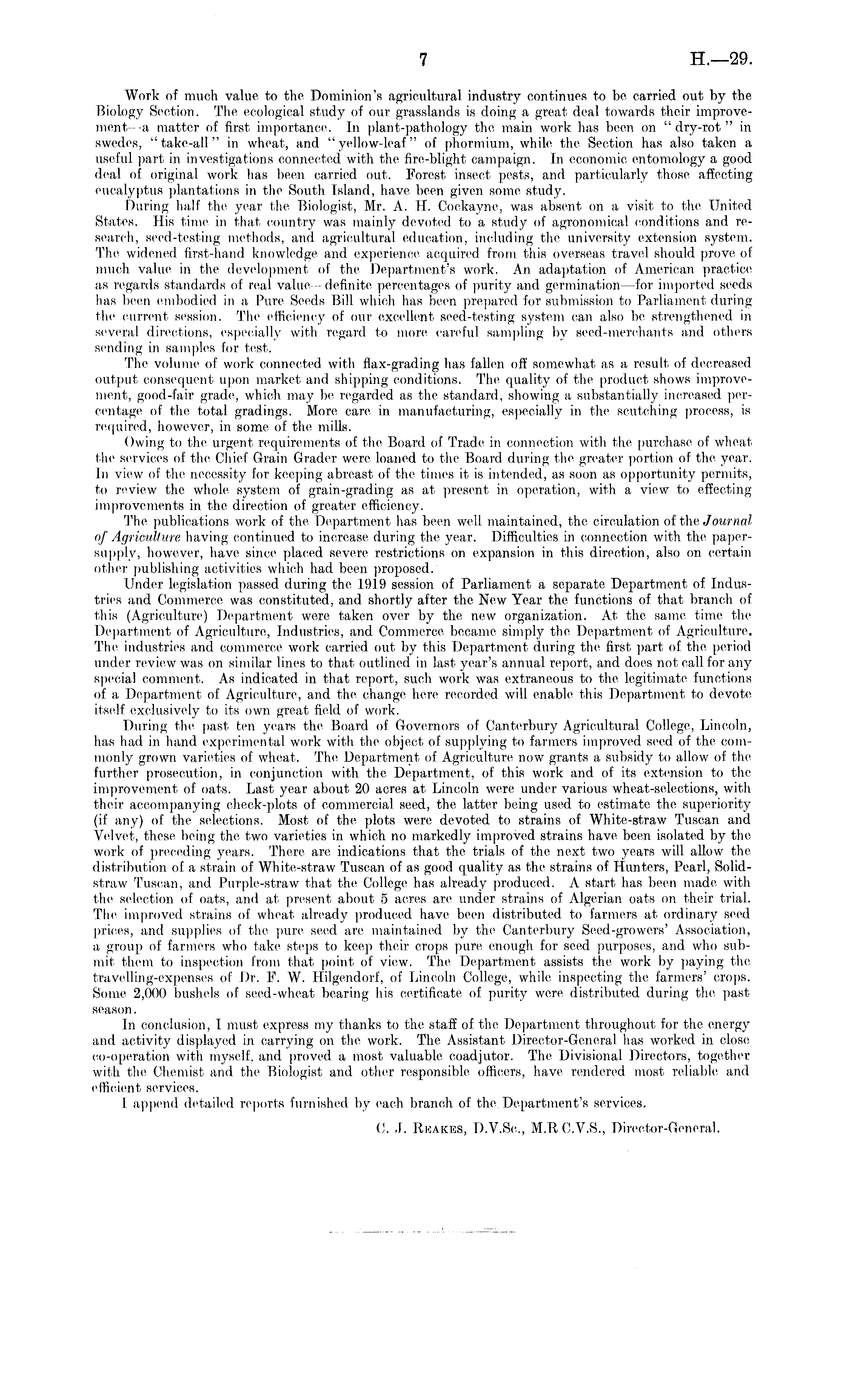 Work of much value, to the Dominion's agricultural industry continues to be carried out by the Biology Section. The ecological study of our grasslands is doing a great deal towards their improvement —a matter of first importance. In plant-pathology the main work has been on " dry-rot "in swedes, "take-all" in wheat, and " yellow-leaf" of phemnium, while the Section has also taken a useful part in investigations connected with the fire-blight campaign. In economic, entomology a good deal of original work has been carried out. Forest insect pests, and particularly those affecting eucalyptus plantations in the South Island, have been given some study. During half the year the Biologist, Mr. A. H. Cockayne, was absent on a visit to the United States. His time in that country was mainly devoted to a study e>f agronomical conditions and research, seed-testing methods, and agricultural education, including the university extension system. The widened first-hand knowledge and experience, acquired from this overseas travel should prove of much value in the development of the' Department's work. An adaptation of American practice as regards standards of real value—definite percentages of purity and germination —for imported seeds has been embodied in a Pure Seeds Bill which has been prepared for submission to Parliament during the' current session. The efficiency of our excellerit seed-testing system can also be strengthened in several directions, especially with regard to more careful sampling by seed-merchants and others sending in sample's for test. The volume, of work connected with flax-grading has fallen off somewhat as a result of decreased output consequent upon market and shipping conditions. The quality of the product shows improvement, good-fair grade, which may be regarded as the standard, showing a substantially increased percentage of the total gradings. More care' in manufacturing, especially in the scutching process, is required, however, in some of the> mills. Owing to the urgent requirements of the Board of Trade in connection with the purchase of wheat the' services of the' Chief Grain Grader were loaned to the Board during the greater portion of the' year. In view of the necessity for keeping abreast of the times it is intended, as soon as opportunity permits, to review the whole system of grain-grading as at present in operation, with a view to effecting improvements in the direction of greater efficiency. The publications work of the Department has been well maintained, the circulation of the Journal of Agriculture having continued to increase during the year. Difficulties in connection with the papersupply, however, have since placed severe restrictions on expansion in this direction, also on certain other publishing activities which had been proposed. Under legislation passed during the 1919 session e>f Parliament a separate, Department of Industries and Commence was constituted, and shortly after the. New Year the functions of that branch of this (Agriculture) Department were taken eiver by the new organization. At the same time the Department of Agriculture, Industries, and Commerce became simply the Department ed Agriculture. The industries and commerce work carried out by this Department during the' first part of the period under review was on similar line's to that outlined in last year's annual report, and doe's not call for any special comment. As indicated in that report, such work was extraneous to the legitimate functions of a Department of Agriculture, and the change here recorded will enable' this Department to devote itself exclusively to its own great field of work. During the past ten years the Board ed Governors of Canterbury Agricultural College, Lincoln, has had in hand experimental work with the' object of supplying to farmers improved seed of the commonly grown varieties of wheat. The Department of Agriculture now grants a subsidy te> allow of the further prosecution, in conjunction with the Department, of this work and of its extension to the improvement of oats. Last year about 20 acres at Lincoln were under various wheat-sedections, with their accompanying check-plots of commercial seed, the latter being used to estimate the superiority (if any) of the selections. Most of the plots were devoted to strains of White-straw Tuscan and Velvet, these being the, two varieties in which no markedly improved strains have been isolated by the work of preceding years. There are indications that the trials of the next two years will allow the distribution of a strain of White-straw Tuscan of as goed quality as the strains of Hunters, Pearl, Solidstraw Tuscan, and Purple-straw that the' College has already produced. A start has been made with the selection of oats, anel at present about 5 acres are' under strains of Algerian oats on their trial. The' improved strains of wheat already produced have been distributed to farmers at ordinary seed prices, and supplies of the pure' seed are' maintained by the Canterbury Seed-growers' Association, a group of farmers who take steps to keep their crops pure enough for seed purposes, and who submit them to inspection from that point of view. The Department assists the work by paying the travelling-expenses of Dr. F. W. Hilgendorf, of Lincoln College, while inspecting the farmers' crops. Some 2,000 bushels of seed-wheat bearing his certificate of purity were distributed during the past season. In conclusion, I must express my thanks to the staff of the Department throughout for the energy and activity displayed in carrying on the work. 'Die Assistant Director-General has worked in close co-operation with myself, and proved a most valuable coadjutor. The Divisional Directors, together with the Chemist and the Biologist and other respemsible officers, have rendered most reliable and efficient services. I append detailed reports furnished by each branch of the Department's services. C. .1. Reakes, D.V.Se'., M.RC.V.S., Direc