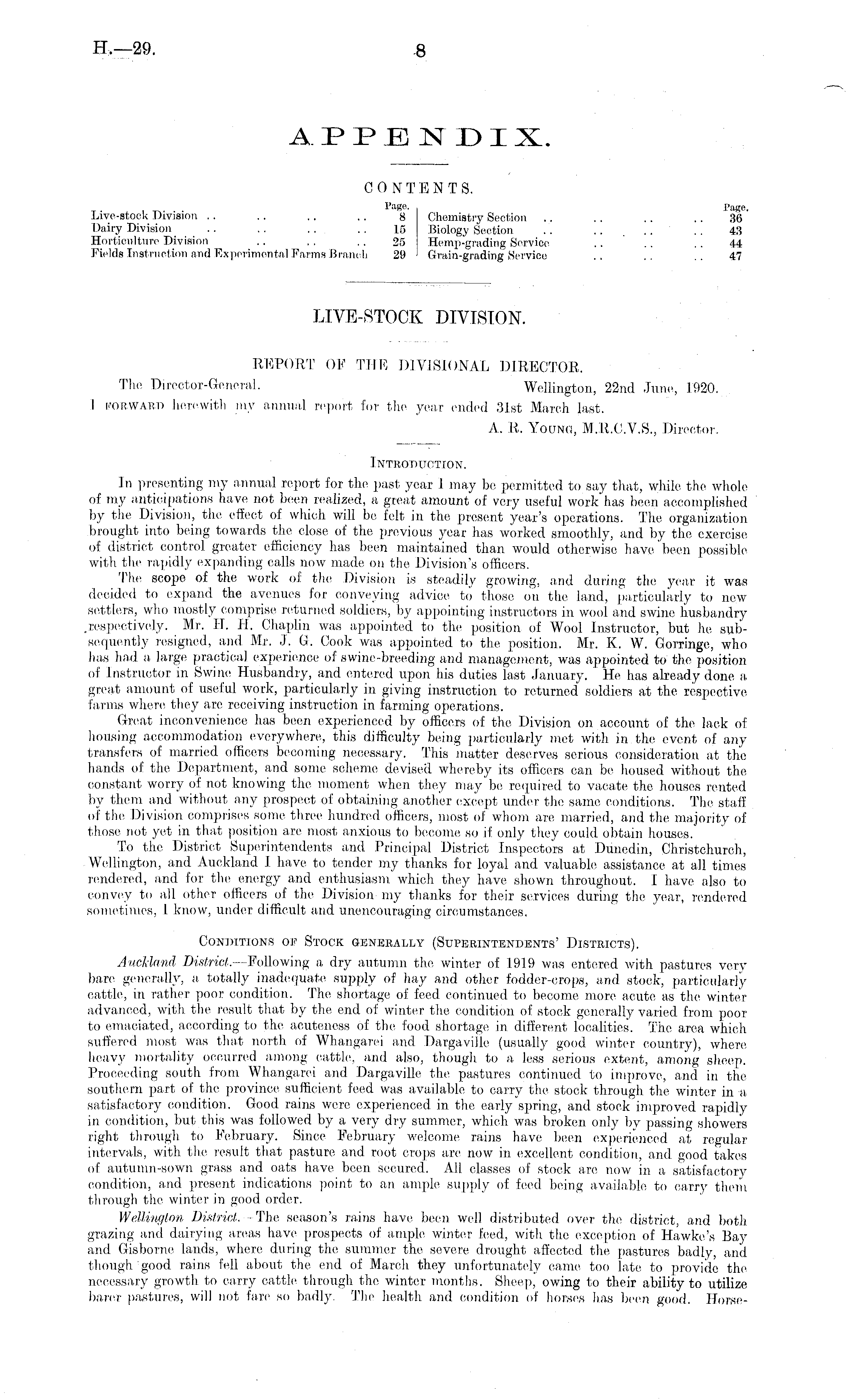 LIVE-STOCK DIVISION. REPORT OF TDK DIVISIONAL DIRECTOR. The Director-General. Wellington, 22nd June, 1920. I forward herewith my annua] report for the year ended 31st March last. A. R, Young, M.R.C.V.S., Director. Introduction. In presenting my annual repent for the past year 1 may be permitted to say that, while the whole of my anticipations have not been realized, a great amount of very useful work has been accomplished by the Division, the effect of which will be felt in the present year's operations, The organization brought into being towards the close of the previous year has worked smoothly, and by the exercise of district centred greater efficiency has been maintained than would otherwise have been possible with the rapidly expanding calls now made on the Division's officers. The- scope of the work of the Division is steadily growing, and during the year it was decided to expand the avenues for conveying advice to those on the land, particularly to now settlers, who mostly comprise returned soldiers, by appointing instructors in wool and swine husbandry .respectively. Mr. 11. H. Chaplin was appointed to the position of Wool Instructor, but he subsequently resigned, and Mr. .1. G. Cook was appointed to the position. Mr. K. W. Gorringe, who has had a large practical experience of swine-breeding anil management, was appointed to the position of Instructor in Swine Husbandry, and entered upon his duties last January, He has already done, a, great amount of useful work, particularly in giving instruction to returned soldiers at the respective farms where they are receiving instruction in farming operations. Great inconvenience' has been experienced by officers of the Division on account of the lack of housing accommodation everywhere, this difficulty being particularly met with in the event of any transfers of married, officers becoming necessary. This matter deserves serious consideration at the hands of the Department, and some scheme devised whereby its officers can housed without the constant worry of not knowing the moment when they may be required to vacate the houses rented by them and without any prospect of obtaining another except under the same conditions. The staff of the Division comprises some three hundred officers, most of whom are married, and the majority of those not yet in that position are most anxious to become so if only they could obtain houses. To the District Superintendents arid Principal District Inspectors at Dunedin, Christchurch, Wellington, and Auckland J have to tender my thanks for loyal and valuable assistance at all times rendered, and for the energy and enthusiasm which they have shown throughout. I have also to convey to all other officers of the Division my thanks for their services during the year, rendered sometimes, I know, under difficult anil unencouraging circumstances, Conditions of Stock generally (Superintendents' Districts). Auckland District.- Following a dry autumn the winter of 1919 was entered with pastures very bare, generally, a totally inadequate supply of hay and other fodder-crops, and stock, particularly cattle, in rather poor condition. The' shortage of feed continued to become more acute as the winter advanced, with the' result that, by the end of winter the condition of stock generally varied, from poor to emaciated, according to the acuteness of the food shortage in different localities. The area, which suffered most was that north of Whangarei and Dargaville (usually good winter- country), whenheavy mortality occurred among cattle, and also, though to a less serious extent, among sheep. Proceeding south from Whangarei and Dargaville the pastures continued to improve, and in the southern part of the' province sufficient feed was available to carry the stock through the winter in a satisfactory condition. Good rains were experienced in. the early spring, and stock improved rapidly in condition, but this was followed by a very dry summer, which was broken only by passing showers right through to February. Since February welcome rains have' been experienced at regular intervals, with the- result that pasture and root crops are now in excellent condition, and good takes of autumn-sown grass and oats have been secured. All classes of stock are now in a satisfactory condition, and present indications point to an ample supply of feed being available to carry them through the winter in good order. Wellington District. -The season's rains have been well distributed over the district, and both grazing and dairying areas have prospects of ample winter feed, with the exception of Hawke's Bay and Gisborne lands, where during the summer: the severe drought affected the pastures badly, and though'good rains fell about the end of March they unfortunately came, too late to provide the, necessary growth to carry cattle through the winter months. Sheep, owing to their ability to utilize barer pastures, will not fare so badly. The health and condition of horses has been good. Horse-