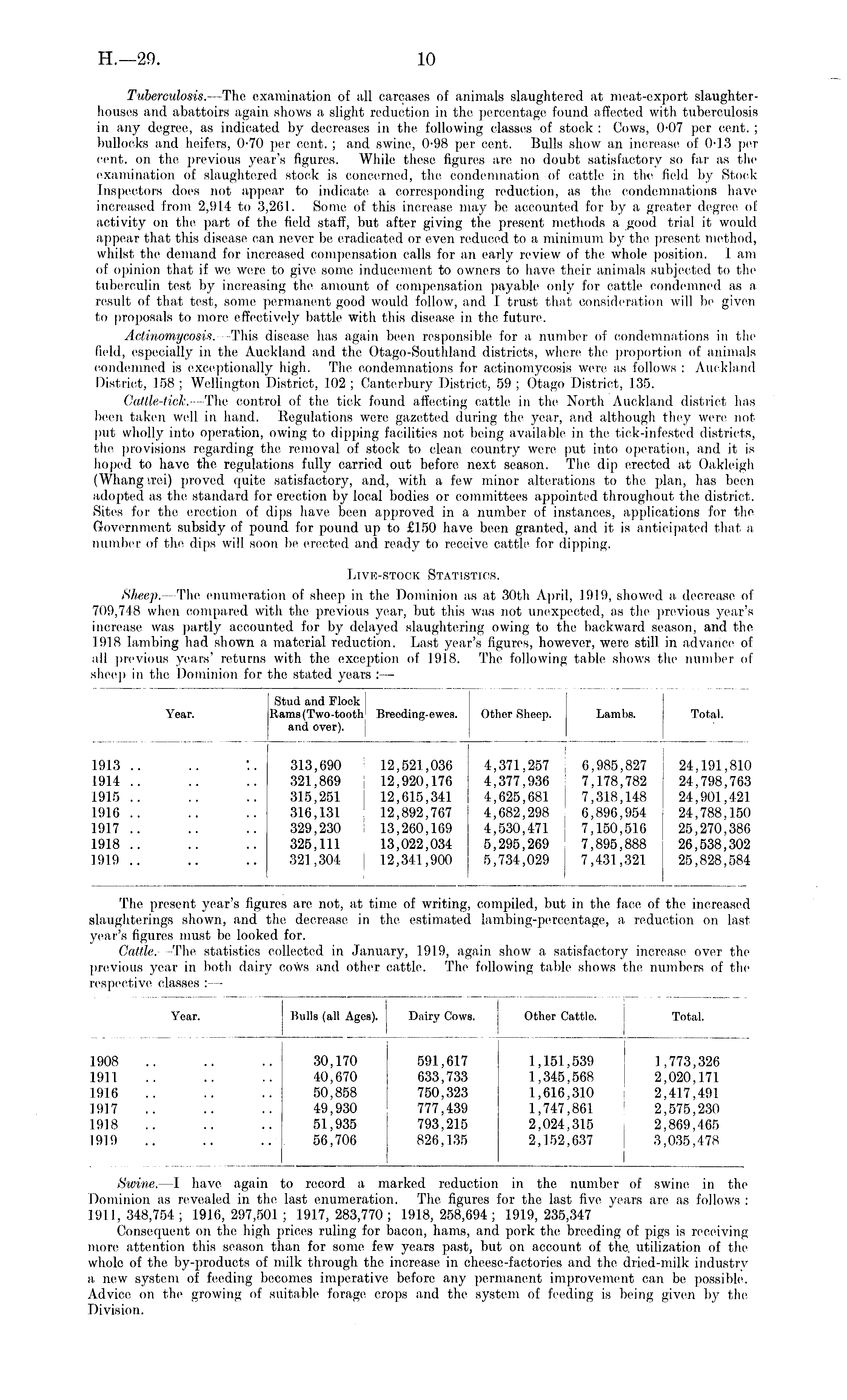 Tuberculosis. —The examination of all carcases of animals slaughtered at meat-export slaughterhouses and abattoirs again shows a slight reduction in the, percentage found affected with, tuberculosis in any degree, as indicated by decreases in the following classes of stock : Cerws, 0-07 per cent. ; bullocks and heifers, 0-70 per cent. ; and swine, 0-98 per cent. Bulls show an increase of 0-13 percent, on the, previous year's figures. While' these figures are no doubt satisfactory so far as the' examination of slaughtered, stock is concerned, the condemnation of cattle in the field by Stock inspectors does ne>t appear to indicate a corresponding reduction, as the condemnations have increased from 2,914 to 3,261. Some of this increase may be accounted for by a greater degree erf activity on the part of the field staff, but after giving the present methods a gooel trial it would appear that this disease can never be eradicated or even reduced to a minimum by the present method, whilst the demand for increased compensation calls for an early review of the whole position. lam erf opinion that if we were to give inducement to owners to have their animals subjected to the tuberculin test by increasing the amount of compensation payable' only for cattle condemned as a, result of that test, some permanent good would follow, and I trust that consideration will be given to proposals to more effectively battle with this disease in the, future. Actinomycosis. —This disease, has again been responsible for a number of condemnations in the field, especially in the Auckland and the Otago-Southland districts, where the proportion of animals condemned is exceptionally high. The condemnations fen- actinomycosis we're as follows : Auckland District, 158 ; Wellington District, 102 ; Canterbury District, 59 ; Otago District, 135. Cattle-tick. — The control of the tick found affecting cattle in the North Auckland district has been taken well in hand. Regulations were gazetted during the year, and although they were not put wholly into operation, owing to dipping facilities not being available in the tick-infested districts, the provisions regarding the removal, of stock to clean country were put into operation, and it is hoped to have the regulations fully carried out before next season. The dip erected at Oakleigh (Whang irei) proved quite satisfactory, and, with a few minor alterations to the, plan, has been adopted as the standard for erection by local bodies or committees appointed throughout the district. Sites for the erection of dips have been approved in a number of instances, applications for the Government subsidy of pound for pound up to £150 have been granted, and it is anticipated that a number of the eiips will soon be erected and ready to receive, cattle for dipping. Livu-stock Statistics. S.heep, —The enumeration of sheep in the Dominion as at 30th April, 1919, showed a, decrease of 709,748 when compared with the previous year, but this was not unexpected, as the previous yeai-'s increase was partly accounted for by delayed slaughtering owing to the backward season, and the 1918 lambing had shown a material reduction. Last year's figures, however, were, still in advance of all previous years' returns with the exception of 1918. The following table slreiws the number of sheep in the Dominion for the stated years : —