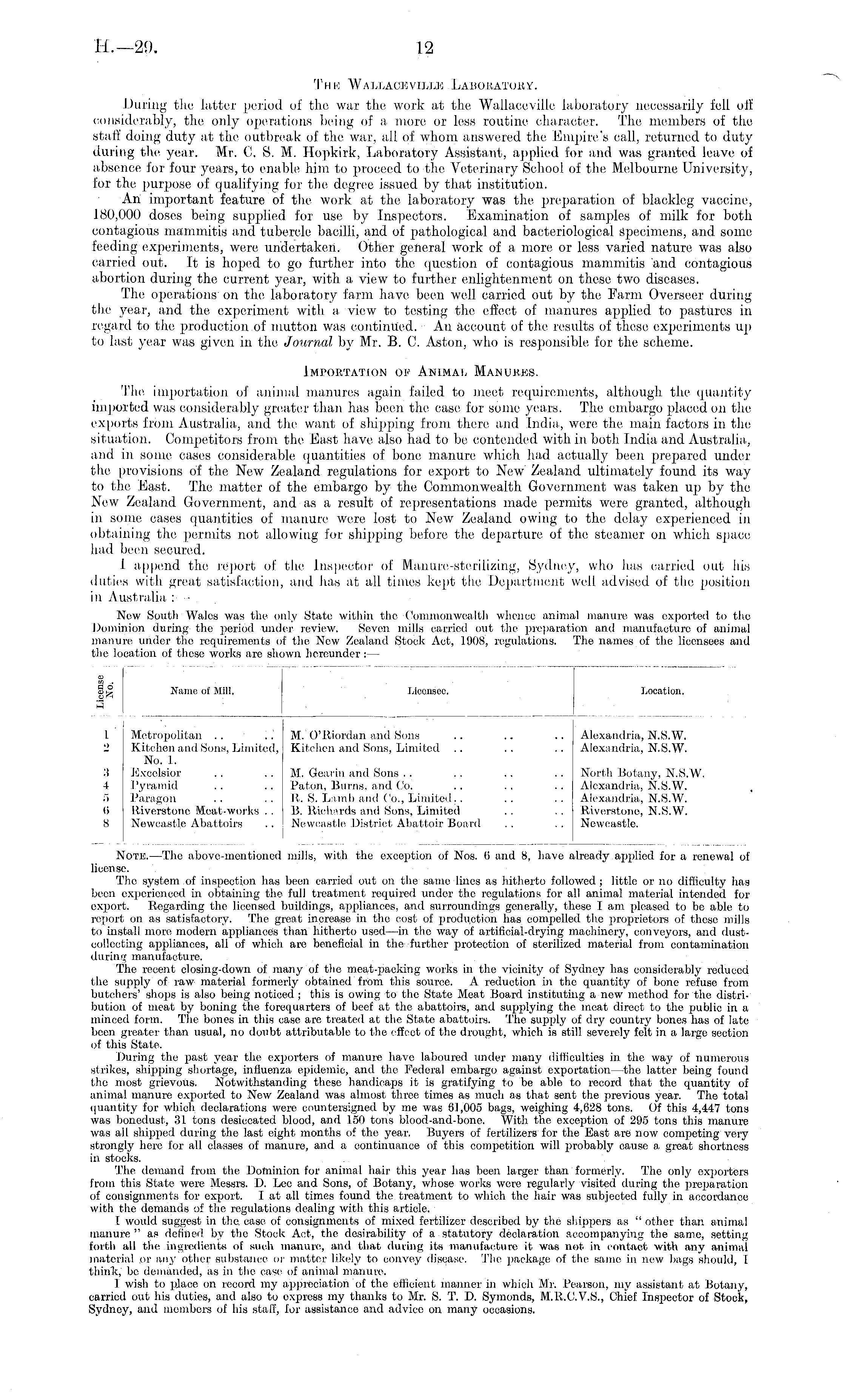 Tun Wallacuvillu Laboratory. During the: latter period of the war the: work at the Wallaceville laboratory necessarily fe:ll off considerably, the only operations being of a more or less routine character. The members of the staff doing duty at the outbreak of the war, all of whom answered the' Empire's call, returned to duty during the, year. Mr. C. S. M. Hopkirk, Laboratory Assistant, applied for and was granted leave of absence for four years, to enable him to proceed to the Veterinary School erf the Melbourne University, for the purpose of qualifying for the degree issued by that institution. An important feature of the' we>rk at the laboratory was the preparation of blackleg vaccine', 180,000 doses being supplied for use by Inspectors. Examination of samples of milk for both contagious mammitis and tubercle bacilli, and of pathological and bacteriological specimens, and some feeding experiments, were undertake:!).. Other general work of a more or less varied nature, was also carried out. It is hoped to go further into the question of contagious mammitis and contagious abortion during the current year, with a view to further enlightenment on these two diseases. The operations on the laboratory farm have been well carried out by the, Farm Overseer during the' year, and the experiment with a. view to testing the effect of manures applied to pastures in regard to the production of mutton was continued. An account of the results of these, experiments up to last year was given in the Journal by Mr. B. C. Aston, who is responsible for the scheme. Importation of Animal Manuhks. The: importation of animal manures again failed to meet requirements, although the quantity imported was e;onsiderably greater than has been the case for some years. The embargo placed on the exports from Australia, and the want of shipping from there and India., were the main factors in the situation. Competitors from the East have also had to be contended with in both India and Australia,, and in some cases considerable quantities of bone manure which Intel actually been prepared under the provisions of the New Zealand regulations for export to New' Zealand ultimately found its way to the East. The matter of the embargo by the Commonwealth Government was taken up by the: New Zealand Government, and as a result of representations made: permits were granted, although in some, cases quantities of manure were lost to Ne:w Zealand erwing to the delay experienced in obtaining the permits not allowing for shipping before the departure of the steamer on which space had been secured. 1 append the report of the Inspector erf Manure-sterilizing, Sydney, who has carried out his duties with great satisfaction, anel has at all times kept the Department well advised of the position in Australia : - New South Wales was the only State within the Commonwealth whence animal manure was exported to the Dominion during the period under review. Seven mills carried out the- preparation and manufacture of animal manure under the requirements of the New Zealand Stock Act, 1908, regulations. The, names of the licensees and the location of those works are shown hereunder :—