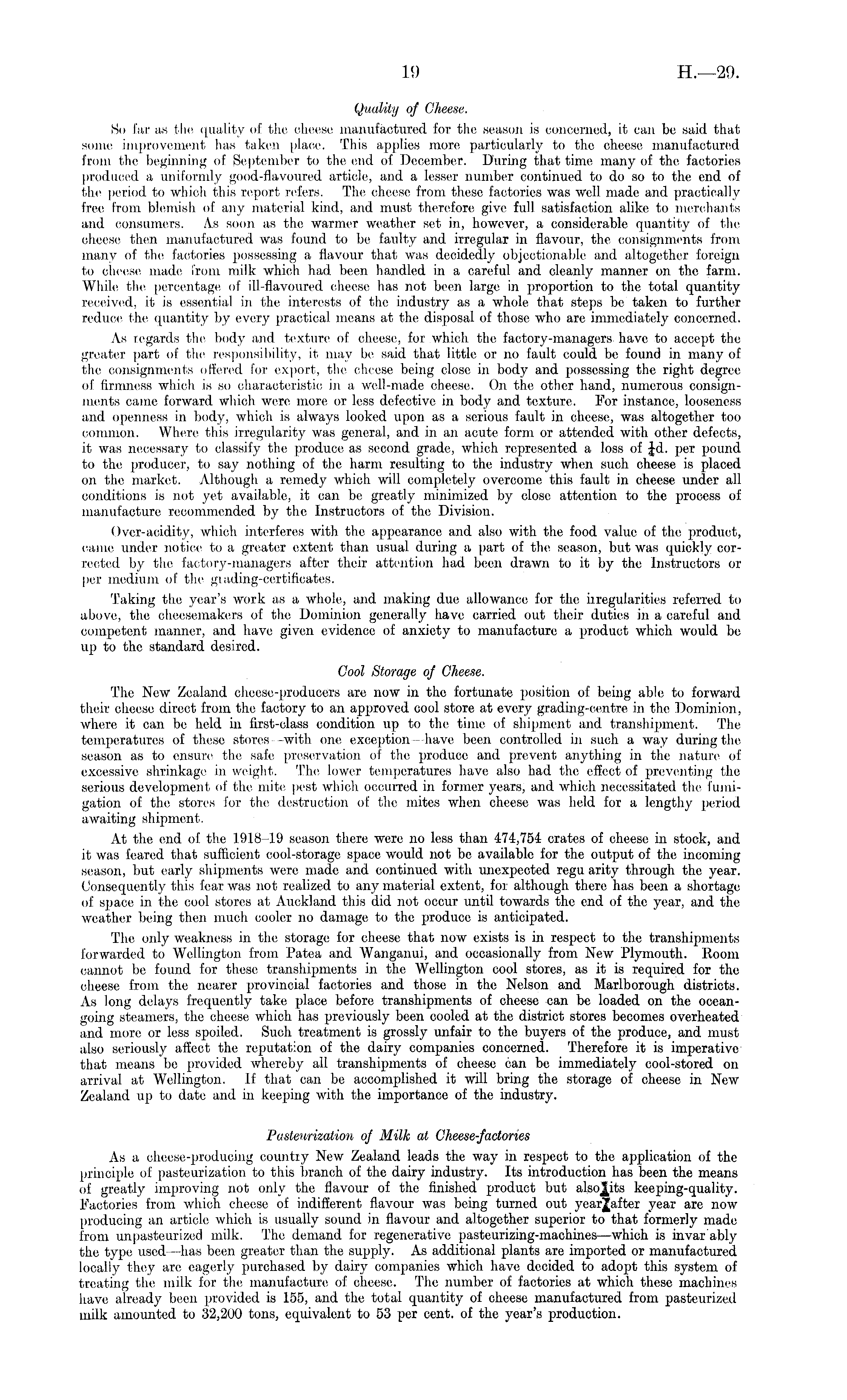 Quality of Cheese. So far as the quality of the cheese manufactured for the season is concerned, it can be sail! that some improvement has taken place. This applies more particularly to the cheese, manufactured from the beginning of September to the end of December. During that time many of the factories produced a uniformly gererd-flavoured article, and a lesser number continued ter do so to the end of the period to which this report refers. The cheese from these factories was well made and practically free from blemish of any material kind, and must therefore give full satisfaction alike to merchants and consumers. As soon as the warmer weather set in, however, a considerable quantity of the cheese then manufactured was found to be faulty and irregular in flavour, the consignments from many of the: factories possessing a flavour that was decidedly objectionable and altogether foreign to oheese made from milk which had. been handled in a careful and cleanly manner on the farm. While the percentage of ill-flaverured cheese has not been large in proportion to the total quantity receive:d, it is essential in the interests of the industry as a whole that steps be taken to further reduce the, quantity by every practical means at the disposal of those who are, immediately concerned. As regards the, body and texture of cheese, for which the factory-managers have to accept the greater part of the responsibility, it, may be, said that little or no fault could be found in many of the consignments offered for export, the' cheese being close in body and possessing the right degree of firmness which is so characteristic in a we:ll-made cheese. On the other hand, numerous consignments came forward which were more or less defective in body and texture, For instance, looseness and openness in body, which is always looked upon as a serious fault in cheese, was altogether too common. Where this irregularity was general, and in an acute form or attended with other defects, it was necessary to classify the produce as second grade, which represented a loss of Jd. per pound to the producer, to say nothing of the harm resulting to the industry when such cheese is placed on the market. Although a remedy which will completely overcome this fault in cheese under all conditions is not yet available, it can be greatly minimized by close attention to the process of manufacture recommended by the Instructors of the Division. Over-acidity, which interferes with the appearance and also with the food value of the product, came under notice to a greater extent than usual during a part of the season, but was quickly corrected by the factory-managers after their attention had been drawn to it by the instructors or per medium erf the giading-certificates. Taking the year's work as a whole, and making clue allowance: for the referred ter above, the cheesemakers of the Dominion generally have carried out their duties in a careful and competent manner, and have given evidence of anxiety to manufacture a product which would be up to the standard desired. Cool Storage of Cheese. The New Zealand cheese-producers are now in the fortunate position of being able to forward their cheese direct from the factory to an approved cool store at every grading-centre in the Dominion, where it can be held in first-class condition up to the time of shipment and transhipment. The temperatures of these stores —with one exception —have been controlled in such a way during the: season as to ensure: the safe preservation of the produce and prevent anything in the nature- of excessive shrinkage in weight. The: lowe:r temperatures have also had the efie:ct of preventing the serious development of the mite, pest which occurred in former years, and which necessitated the, fumigation of the stores for the: destruction of the mites when cheese was held for a lengthy period awaiting shipment. At the end of the 1918-19 season there were no less than 474,754 crates of cheese in stock, and it was feared that sufficient cool-storage space would not be available for the output of the incoming season, but early shipments were made and continued with unexpected regu arity through the year. Consequently this fear was not realized to any material extent, for although there, has been a shortage of space in the cool stores at Auckland this did not occur until towards the end of the year, and the weather being then much cooler no damage to the produce is anticipated. The only weakness in the storage for cheese that now exists is in respect to the transhipments forwarded to Wellington from Patea and Wanganui, and occasionally from New Plymouth. Room cannot be found for these transhipments in the Wellington cool stores, as it is required for the cheese from the nearer provincial factories and those in the Nelson and Marlborough districts. As long delays frequently take place before transhipments of cheese can be loaded on the oceangoing steamers, the cheese which has previously been cooled at the district stores becomes overheated and more or less spoiled. Such treatment is grossly unfair to the buyers of the produce, and must also seriously affect the reputation of the dairy companies concerned. Therefore it is imperative that means be provided whereby all transhipments of cheese can be immediately cool-stored on arrival at Wellington. If that can be accomplished it will bring the storage of cheese in New Zealand up to date and in keeping with the importance of the industry. Pasteurization of Milk at Cheese-factories As a cheese-producing country New Zealand leads the way in respect to the application of the principle of pasteurization to this branch of the dairy industry. Its introduction has been the means of greatly improving not only the flavour of the finished product but alsojits keeping-quality. Factories from which cheese of indifferent flavour was being turned out yearjafter year are now producing an article which is usually sound in flavour and altogeth