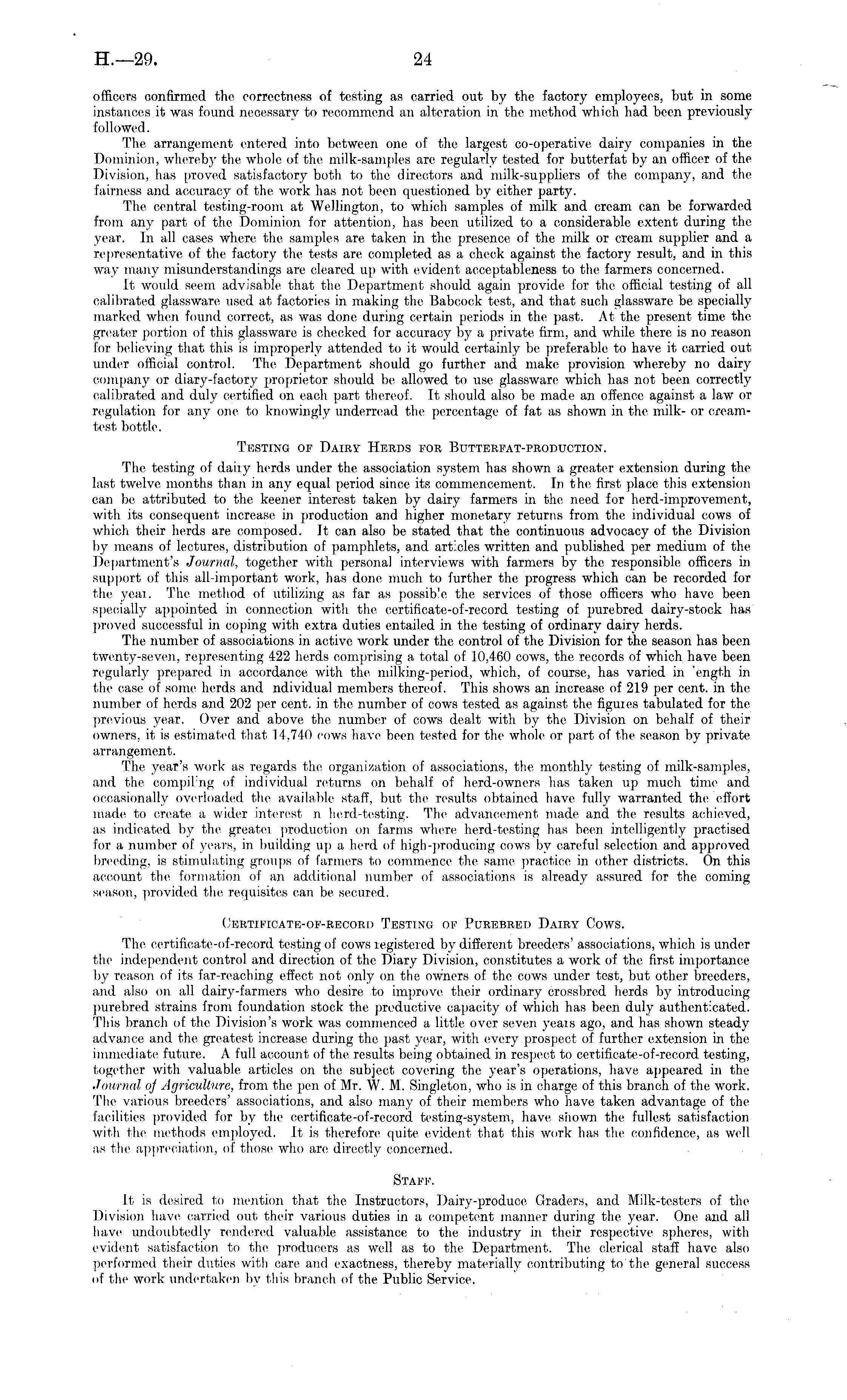 officers confirmed the correctness of testing as carried out by the factory employees, but in some instances it was found necessary to recommenel an alteration in the method which had been previously followed. The arrangement entered into between one of the largest co-operative, dairy companies in the Dominion, whereby the, whole of the milk-samples are regularly tested for butterfat by an officer of the Division, has proved satisfactory berth to the directors and milk-suppliers of the company, and the fairness and accuracy of the work has not been questioned by either party. The central testing-room at Wellington, to which samples of milk and cream can be, forwarded from any part of the Dominion for attention, has been utilized to a considerable extent during the year. In all cases where the samples are taken in the presence of the milk or cream supplier and a representative of the factory the tests are completed as a check against the factory result, and in this way many misunderstandings are cleared up with evident acceptableness to the farmers concerned. It would seem advisable that the Department should again provide, for the official testing of all calibrated glassware used at factories in making the Baboock test, and that such glassware be specially marked when found correct, as was done during certain periods in the past. At the present time, the greater portion of this glassware is checked for accuracy by a private firm, and while there is no reason for believing that this is improperly attended to it weruld certainly be: preferable to have, it carried out under official control. The Department should go further and make provision whereby no dairy company or diary-factory proprietor sheruld be allowed to use: glassware which has not been correctly calibrated and duly certified on each part thereof. It should also be made an offence against a law or regulation for any one to knowingly underread the percentage of fat as shown in the milk- or creamtest bottle. Testing op Dairy Herds for Butterpat-production. The testing of daily herds under the, association system has shown a greater extension during the last twelve months than in any equal period since its commencement. In the first place this extension can be attributed to the keener interest taken by dairy farmers in the need for herd-improvement, with its consequent increase in production and higher monetary returns from the individual cerws of which their herds are composed. It can also be stated that the continuous adveroacy of the, Division by means of lectures, distribution of pamphlets, and articles written and published per medium erf the Department's Journal, together with personal interviews with farmers by the responsible officers in support of this all-important work, has done: much to further the progress which can be recorded for the year, The method erf utilizing as far as possible the services of those officers who have been specially appointed in connection with the certificate -of -reoo-rd testing of purebred dairy-stock has proved successful in coping with extra duties entailed in the testing of ordinary dairy herds. The number of associations in active work under the control of the Division for the season has been twenty-seven, representing 422 herds comprising a total of 10,460 cows, the records of which have been regularly prepared in accordance with the milking-period, which, of course, has varied in 'ength in the case of some: herds and ndividual members thereof. This shows an increase of 219 per cent, in the number of herds and 202 per cent, in the number of cows tested as against the figures tabulated for the previous year. Over and above the, number of cows dealt with by the Division on behalf of their erwners, it is estimated that 14,740 cows have' been tested for the- whole' err part of the seasern by private arrangement. The year's work as regards the: organization of asserciations, the, monthly testing erf milk-samples, and the compil'ng of individual returns on behalf of herd-owners has taken up much time> and occasionally overleraded the available staff, but the results erbtained have fully warranted the' efferrt made to create a wider interest n herd-testing. The advancement made and the results achieved, as indicated by the greater production on farms where herd-testing has been intelligently practised for a number of years, in building up a herd of high-producing cerws by careful selection and approved breeding, is stimulating groups of farmers to commence the same' practice in either districts. On this account the: formation erf an additiemal number of associations is already assured for the, coming seasern, provided the requisites can be secured. CeRTIFICATH-OF-RECORII TESTING OF PUEEBEETJ DAIRY COWS. The certifieatc-of-record testing of cerws registered by different breeders' associations, which is under the' independent control anel direction of the Diary Division, constitutes a work of the, first importance by reason of its far-reaching effect not only on the owners of the cows under test, but other breeders, and also em all dairy-farmers wher desire ter improve: their errdinary crossbred herds by introeiucing purebred strains from foundation stock the productive capacity erf which has been duly authenticated. This branch of the. Division's work was commenced a little over seven yeais ago, and has shown steady advance and the, greatest increase during the past year, with e:very prospect of further extension in the immediate future. A full account of the' results being obtained in respect to certificate-of-record testing, together with valuable, articles on the, subject covering the year's operations, have appeared in the Journal of Agriculture, from the pen of Mr. W. M, Singleton, who is in charge of this branch of the work. The various breeders' associations, anel also many of their members who have, taken advantage of the' facilities provided for by the certificate-of-record testing-syst