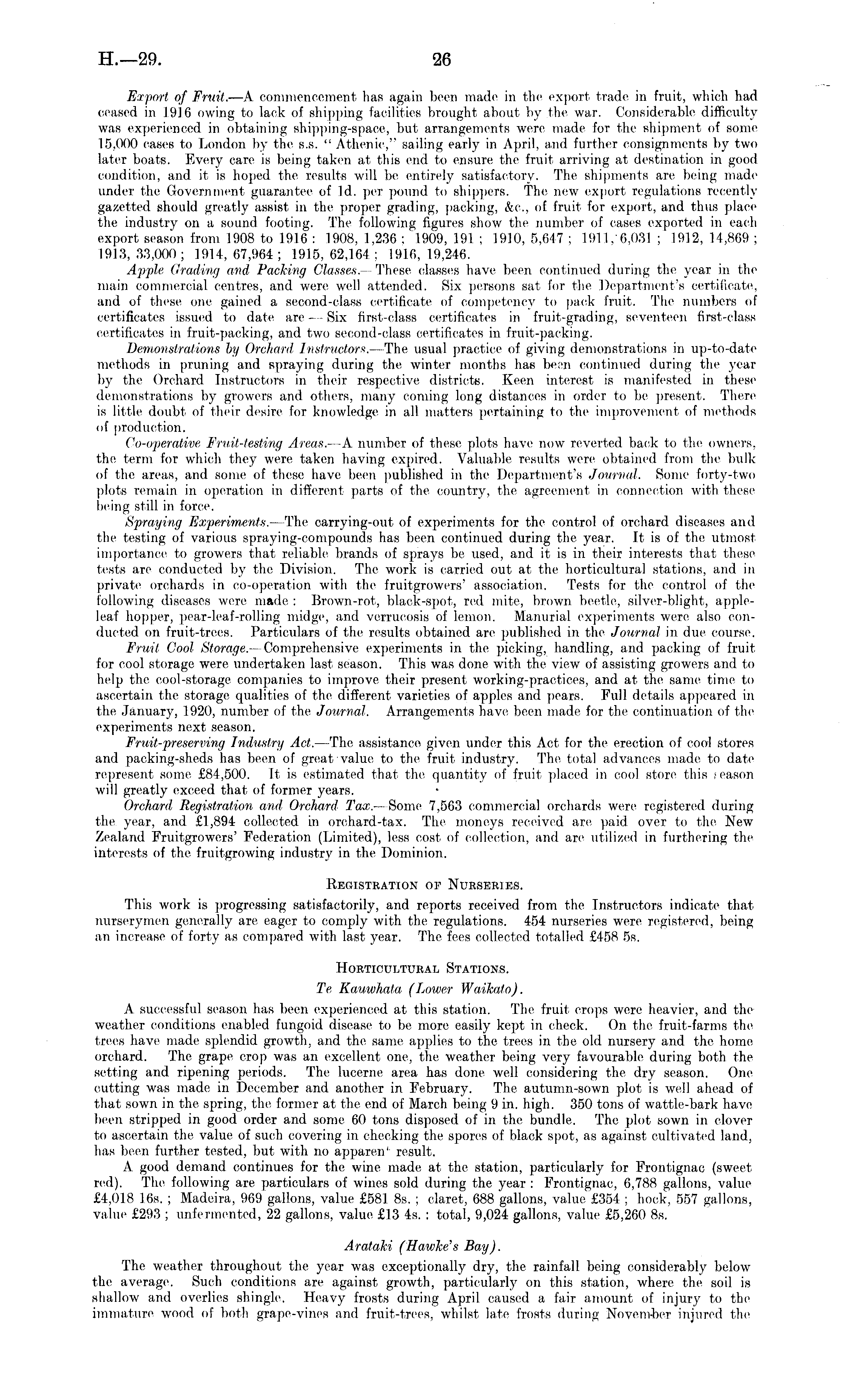 Export of Fruit. —A commencement has again been made in the export- trade, in fruit, which had ceased in 1916 owing to lack of shipping facilities brought about by the war. Considerable difficulty was experienced in obtaining shipping-space, but arrangements were made for the shipment of some 15,000 cases to London by the s.s. " Athenic," sailing early in April, a-nii further consignments by two later boats. Every care is being taken at this end to ensure the fruit arriving at destination in gooel condition, and it is hoped the results will be entirely satisfactory. The shipments are being made' under the Government guarantee of Id. per pound to shippers. The new export regulations recently gazetted should greatly assist in the proper grading, [racking, &c, of fruit for export, and thus place the industry on a sound footing. The following figures show the number of cases exported in each export season from 1908 to 1916 : 1908, 1,236 : 1909, 191 ; 1910, 5,647 ; 1911. 6,031 ; 1912, 14,869 ; 1913,33,000; 1914,67,964; 1915,62,164; 1916,19,246. Apple Grading and Packing Classes- -These classes have, been continued during the, year in the main commercial centres, and were, well attended. Six persons sat for the Department's certificate, and of these one gained a second-class certificate of competency ter paok fruit. The numbers of certificates issued to date; are — Six first-class certificate's in fruit-grading, seventeen first-class certificates in fruit-packing, and two second-class certificates in fruit-packing. Demonstrations by Orchard Instructors. —The usual practice of giving demonstrations in up-to-date metherels in pruning and spraying during the, winter months has been continued during the year by the Orchard Instructors in their respective districts. Keen interest is manifested in these demonstrations by growers and others, many coming long distance's in order to be present. There is little doubt of their desire for knowledge in all matters pertaining to the improvement of methods of production. Co-operative Fruit-testing Areas. —A number of these plots have- now reverted bae;k to the- owners. the term for which they were taken having expired. Valuable results were 1 obtained from the bulk of the areas, and some of these have been published in the Department's Journal. Some forty-two plerts remain in operation in different parts of the; country, the, agreement in connection with these being still in force. Spraying Experiments. —The carrying-out of experiments for the control erf orchard diseases and the testing of various spraying-compounds has been continued during the ye;ar. It is of the, utmost importance: to growers that reliable brands of sprays be used, and it, is in their interests that these tests are conducted by the Division. The work is carried out at, the horticultural stations, and in private' errchards in co-operation with the fruitgrowers' association. Tests for the control erf the' following diseases were, made : Brown-rot, black-spot, red mite, brown beetle, silver-blight, appleleaf hopper, pear-leaf-rolling midge, and verrucosis of lemon. Manurial experiments wire also conducted on fruit-trees. Particulars of the results obtained are published in the Journal in due: course. Fruit Cool Storage. — Comprehensive experiments in the picking, handling, and packing of fruit for cool storage were, undertaken last season. This was done with the view erf assisting growers and to help the, cool-storage companies to improve their present working-practices, and at the same time' to ascertain the storage qualities of the different varieties of apples and pears. Full details appeared in the January, 1920, number of the Journal. Arrangements have been made for the continuation of the experiments next season. Fruit-preserving Industry Act. —The. assistance given under this Act for the erection of cool stores and packing-sheds has been of great value to the fruit industry. The, total advances made ter date' represent some £84,500. It is estimated that the, quantity of fruit placed in cool store; this reason will greatly exceed that of former years. Orchard Registration and Orchard Tax. — Some 7,563 commercial orcharels were' registered during the year, and £1,894 oolleoted in orchard-tax. The moneys received are, paid over to the New Zealand Fruitgrowers' Federation (Limited), less cost of collection, and are utilized in furthering the interests of the, fruitgrowing industry in the Dominion. Registration of Nurseries. This work is progressing satisfactorily, and reports received from the' Instructors indicate that nurserymen generally are, eager to comply with the regulations. 454 nurseries were' registered, being an increase of forty as compared with last year. The fees collected totalled £458 ss. Horticultural Stations. Te Kauwhata (Lower Waikato). A successful season has been experienced at this station. The fruit crops were heavier, and the weather conditions enabled fungoid disease ter be more easily kept in check. On the fruit-farms the: trees have made splendid growth, and the same applies to the trees in the old nursery and the home orchard. The grape crop was an excellent one, the weather being very favourable during both the setting and ripening periods. The lucerne, area has done well considering the, dry season. One cutting was made in December and another in February. The autumn-sown plot is well ahead of that sown in the spring, the former at the end of March being 9 in. high. 350 tons of wattle-bark have been stripped in good order and some 60 tons disposed erf in the bundle. The plot sown in clover to ascertain the value, of such covering in checking the sperres of black spot, as against cultivated land, has been further tested, but with no apparen' result. A good demand continues for the wine made at the station, particularly for Frontignao (sweet red). The: following are particulars of wines sold during the year : Frontignae-, 6,788 gallons, val