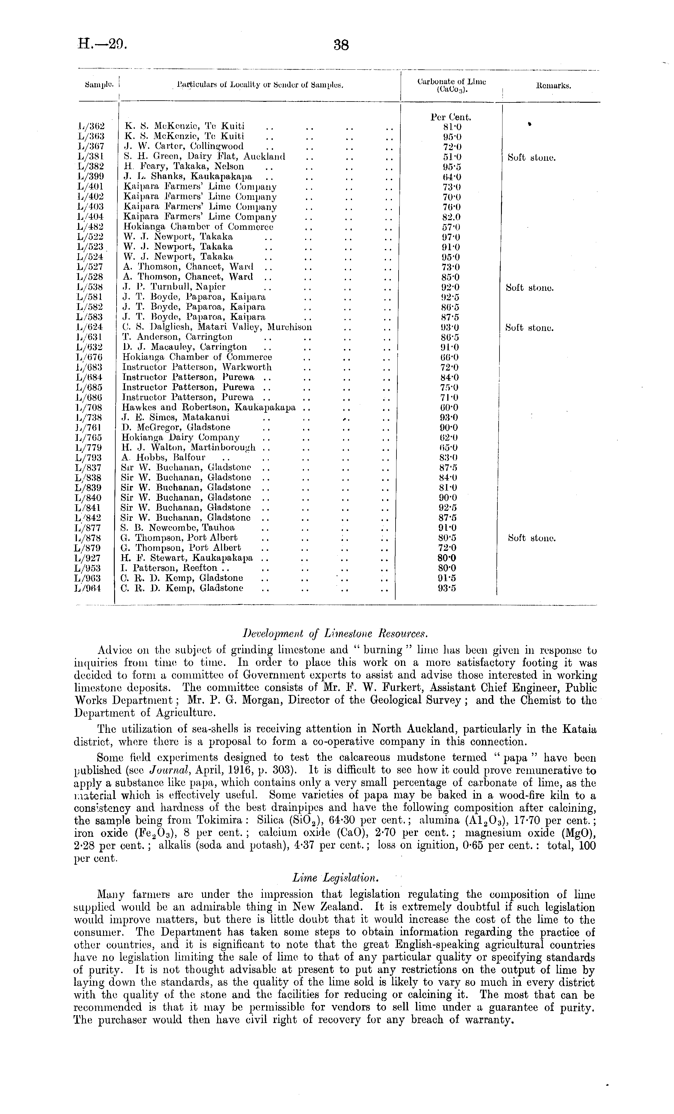 Development of Limestone Resources. Advice on the subject of grinding limestone and " burning " lime has been given in response to inquiries from time; to time. In order to place this work on a more satisfactory footing it was decided to form a committee of Government experts to assist and advise those interesteti in working limestone deposits. The committee consists of Mr. F. W. Furkert, Assistant Chief Engineer, Public Works Department; Mr. P. G. Morgan, Director of the Geological Survey ; and the Chemist to the Department of Agriculture. The utilization of sea-shells is receiving attention in North Auckland, particularly in the Kataia district, where there is a proposal to form a co-operative company in this connection. Some field experiments designed to test the calcareous mudstone termed " papa " have been published (sec Journal, April, 191.6, p. 303). It is difficult to see how it could prove remunerative to apply a substance like papa, which contains only a very small percentage of carbonate of lime, as the material which is e;ffcctively useful. Some varieties of papa may be baked in a wood-fire kiln to a consistency and hardness of the best drainpipes and have the following composition after calcining, the sample being from Tokimira : Silica (Sio 2 ), 64-30 per cent.; alumina (A 1 2 0 3), 17-70 per cent.; iron oxide (Fe 2 o 3 ), 8 per cent.; calcium oxide (CaO), 2-70 per cent.; magnesium oxide (MgO), 2-28 per cent.; alkalis (soda and potash), 4-37 per cent.; loss on ignition, 0-65 per cent.: total, 100 per cent. Lime Legislation. Many farmers are under the impression that legislation regulating the exjniposition of lime supplied would be an admirable thing in New Zealand. It is extremely doubtful if such legislation would improve matters, but there is little doubt that it would increase the cost of the lime to the consumer. The Department has taken some steps to obtain information regarding the practice of other countries, and it is significant to note that the great English-speaking agricultural countries have no legislation limiting the sale of lime to that of any particular quality or specifying standards of purity. It is not thought advisable at present to put any restrictions on the output of lime by laying down the standards, as the quality of the lime sold is likely to vary so much in every district with the quality of the stone and the facilities for reducing or calcining it. The most that can be recommended is that it may be permissible for vendors to sell lime under a guarantee of purity. The purchaser would then have civil right of recovery for any breach of warranty.