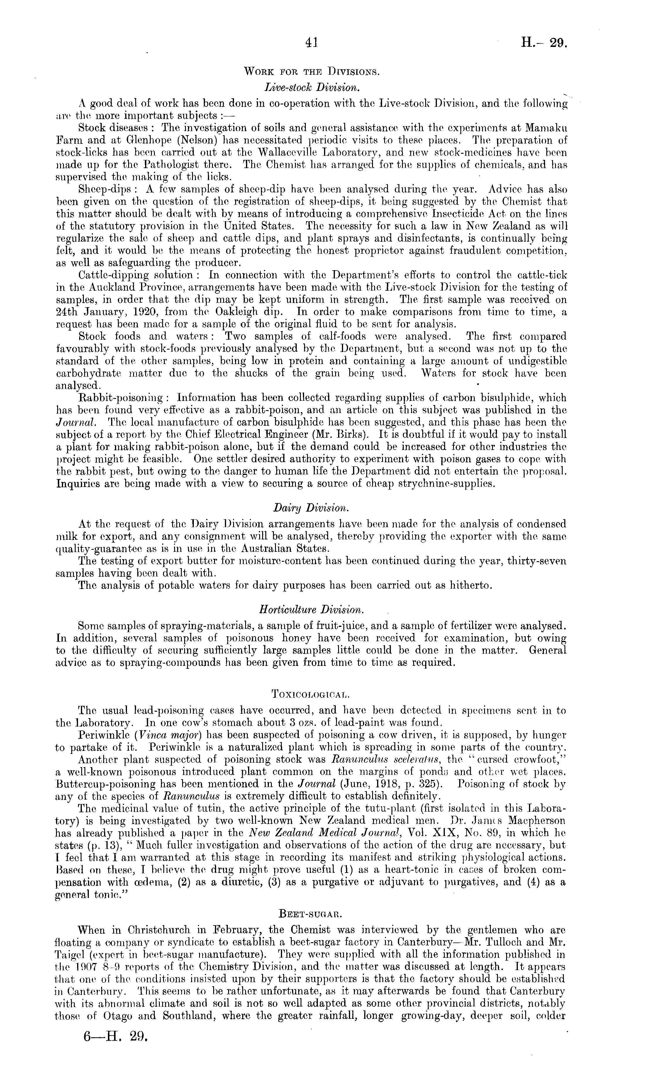 Work for the Divisions. Live-stock Division. A good deal of work has been done in co-operation with the; Live-stock Division, and the following are' the more important subjects : — Stock diseases : The investigation of soils and general assistance with the experiments at Mamaku Farm and at Glenhope (Nelson) has necessitated periodic visits to these places. The' preparation of stock-licks has been carried out at the Wallaceville Laboratory, and new stock-medicines have been made up for the Pathologist there. The Chemist has arranged for the supplies of chemicals, and lias supervised the making of the licks. Sheep-dips : A few samples of sheep-dip have, been analysed during the year. Advice 1 has alser been given on the question of the registration of sheep-dips, it being suggested by the' Chemist that this matter should be dealt with by means of introducing a comprehensive Insecticide Act on the lines of the statutory provision in the. United States. The necessity for such a law in New Zealand as will regularize the sale of sfu;ep and cattle dips, and plant sprays and disinfectants, is continually being felt, and it would be, the means of protecting the honest proprietor against fraudulent competition, as well as safeguarding the prerducer. Cattle-dipping solution : In connection with the Department's efforts to control the' cattle-tick in the Auckland Province, arrangements have been made; with the Live-stock Division for the; testing of samples, in order that the dip may be kept uniform in strength. The first sample was received on 24th January, 1920, from the Oakleigh dip. In order to make comparisons from time to time, a request has been made for a sample of the original fluid to be sent for analysis. Stock foods and waters : Two samples of calf-foods were; analysed. The first compared favourably with stock-foods previously analysed by the Department, but a second was not up to the standard of the other samples, being low in protein and containing a large' amount of undigestible carbohydrate, matter due to the shucks of the grain being used. Waters for stock have been analysed. Rabbit-poisoning : Information has been collected regarding supplies erf carbon bisulphide, which has been found very effective as a, rabbit-poison, and an article on this subject was published in the; Journal. The local manufacture, of carbon bisulphide, has been suggested, and this phase has been the subject of a report by the; Chief Electrical Engineer (Mr. Birks). It is doubtful if it would pay to install a plant for making rabbit-poison alone, but if the demand could be increased for other industries the project might be feasible. One settler desired authority to experiment with poison gases to cerpe with the rabbit pest, but owing to the danger to human life the Department did not entertain the proposal. Inquiries are being made with a view to securing a source, of cheap strychnine-supplies. Dairy Division. At the; request of the Dairy Division arrangements have been made; for the analysis of condensed milk for export, and any consignment will be analysed, thereby providing the exporter with the same epiality-guarantee as is in use, in the Australian States. The testing of export butte;r for moisture-content has been cerntinue;d during the year, thirty-seven samples having been dealt with. The, analysis of potable waters for dairy purposes has been carried out as hitherto. Horticulture Division. Some samples of spraying-materials, a sample of fruit-juice, and a sample of fertilizer were analysed. In addition, se;veral sample's of poisonous honey have been received for examination, but owing to the difficulty of securing sufficiently largo samples little could be done in the matter. General advice, as to spraying-compounds has been given from time' to time as required. TOXICOLOGIOAL, The usual lead-poisoning cases have, occurred, and have; been detected in specimens sent in to the Laboratory. In one cow's stomach about 3 ozs. erf lead-paint was found. Periwinkle (Vinca major) has been suspected of poisoning a cow driven, it, is supposed, by hunger to partake of it. Periwinkle; is a naturalized plant which is spreading in some parts of the country. Another plant suspected of poisoning stock was Ranunculus sceleratus, the "cursed crowfoot," a well-known poisonous introduced plant common on the margins of ponds and other wet places. Buttercup-poisoning has been mentioned in the Journal (June, 1918, p. 325). Poisoning erf stock by any of the species of Ranunculus is extremely difficult to establish definitely. The medicinal value of tutin, the active principle of the tutu-plant (first isolated in this Laboratory) is being investigated by two well-known New Zealand medical men. Dr. James Macpherson has already published a paper in the New Zealand Medical Journal, Vol. XIX, No. 89, in which he states (p. 13), " Much fuller investigation and observations of the action of the drug are necessary, but I feel that I am. warranted at this stage in recording its manifest and striking physiological actions, Baseel etn these, I believe; the drug might prove useful (1) as a heart-tonic in cases of broken compensation with oedema, (2) as a diuretic, (3) as a purgative or adjuvant to purgatives, and (4) as a general tonic." Bebt-stjgae. When in Christchurch in February, the Chemist was interviewed by the, gentlemen who are floating a company or syndicate to establish a beet-sugar factory in Canterbury —Mr. Tulloch and Mr. Taigel (expert in beet-sugar manufacture). They were' supplied with all the information published in the 1907 8-9 reports of the Chemistry Divisiern, and the matter was discussed at length. It appears that one of the conditions insisted upon by their supporters is that the factory should be established in Canterbury. This seems to be rather unfortunate, as it may afterwards be found that Canterbury with its abnormal climate and soil is not so well adapted as some othe;r provincial districts, notably th