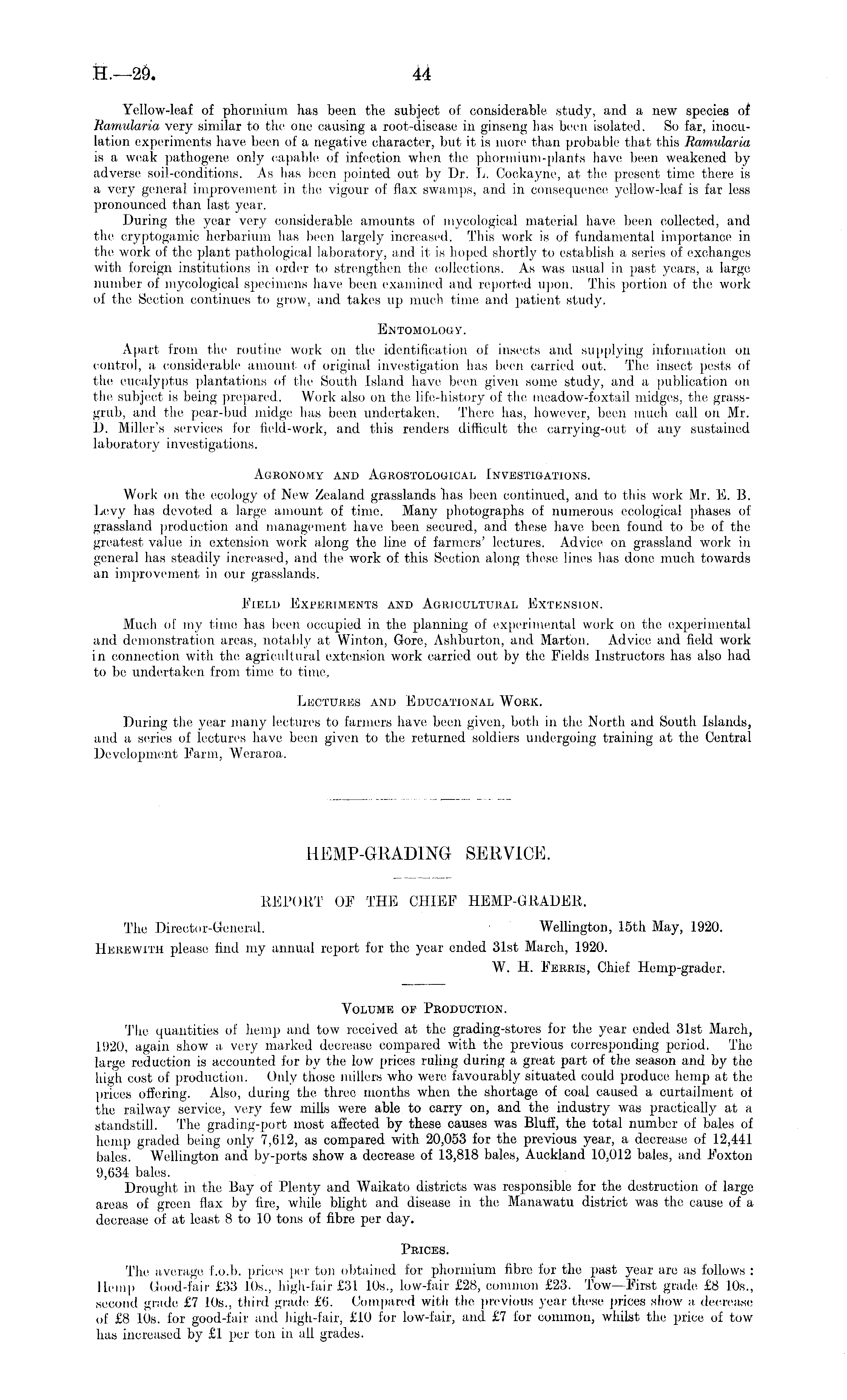 Yellow-leaf of phormium has been the subject of considerable study, and a new species of Ramularia very similar to the one, causing a root-disease in ginseng has been isolated. So far, inoculation experiments have been of a negative character, but it is more' than probable that this Ramularia is a weak pathogene only capable; of infection when the phormium-plants have' be;e;n weakent;d by adverse soil-conditions. As has 1 n pointed out by Dr. L. Cockayne, at the present time there is a very general improvement in the vigour of flax swamps, and in consequenoe yellow-leaf is far less pronounced than last year. During the year very considerable, amounts of mycological material have been collected, and the cryptogamic herbarium has been largely increased. This work is erf fundamental importance in the work of the plant pathological laboratory, and it is hoped shortly to establish a series of exchanges with foreign institutions in errder ter strengthen the collections, As was usual in past years, a large; number of mycological specimens have been examined and reported upon. This portion of the work of the Section continues ter grow, and takes up much time and patient study. Entomology. Apart from the routine work on the identification of insects and supplying information on control, a considerable amount erf original investigation has been carried out. The insect pests of the eucalyptus plantations of lire' South Island have be'en given some study, anil a publication on the subject is being prepared. Work also on the life-history of the; meadow-foxtail midges, the grassgrub, and the pear-bud .midge has been undertaken. There has, however, been much call on Mr. D. Miller's services for field-work, and this renders difficult the carrying-out of any sustained laboratory investigations. Agronomy and Agrostological Investigations, Work on the. ecology of New Zealand grasslands has been continued, and to this work Mr. E. B. Levy has devote;d a large amount of time. Many photographs of numerous ecological phases erf grassland production and management have been secured, and these have been found to be of the greatest value in extension work along the line of farmers' lectures. Advice on grassland werrk in general has steadily increased, and the, work of this Section along these lines has done much towards an improvement in our grasslands. Field Experiments and Agricultural Extension. Much of my time; has been occupied in the planning of experimental work on the experimental and demonstration areas, notably at Winton, Gore, Ashburton, and Marton. Advice and field work in connection with the; agricultural extension work carried out by the Fields Instructors has also had to be undertaken from time to time. Leotuees and Educational Work. During the year many lectures to farmers have, been given, both in the North and South Islands, anel a, series of lectures have been given to the returned soldiers undergoing training at the, Central Development Farm, Weraroa. HEMP-GRADING SERVICE. REPORT OF THE CHIEF HEMP-GRADER. The Director-General. Wellington, 15th May, 1920. Herewith please find my annual report for the year ended 31st March, 1920. W. H. Ferris, Chief Hemp-grader. Volume of Production. The quantities of hemp and tow received at the grading-stores for the year ended 31st March, 1920, again show a very marked decrease compared with the previous corresponding period. The large reduction is accounted for by the low prices ruling during a great part of the season and by the high cost of production. Only those millers who were' favourably situated could produce hemp at the prices offering. Also, during the three months when the shortage of ceral caused a curtailment of the railway service, very few mills were able to carry on, and the industry was practically at a standstill. The grading-port most affected by these causes was Bluff, the total number of bales of hemp graded being only 7,612, as compared with 20,053 for the previous year, a decrease, of 12,441 bales. Wellington and by-ports show a decrease of 13,818 bales, Auckland 10,012 bales, and Foxton 9,634 bales. Drought in the Bay of Plenty and Waikato districts was responsible for the destruction of large areas of green flax by fire, while blight and disease in the Ma-nawatu district was the cause of a decrease of at least 8 to 10 tons of fibre per day. Prices. The average f.o.b. prices per ton obtained for phormium fibre for the past year are as follows : Hemp Good-fair £33 10s., high-lair £31 1.05., low-fair £28, common £23. Tow—First grade £8 10s., second grade £7 10s., third grade £0. Compared with the previous year these prices show a decrease of £8 10s. for good-fair and high-fair, £10 for low-fair, and £7 for common, whilst the price of tow has increased by £1 per ton in all grades.