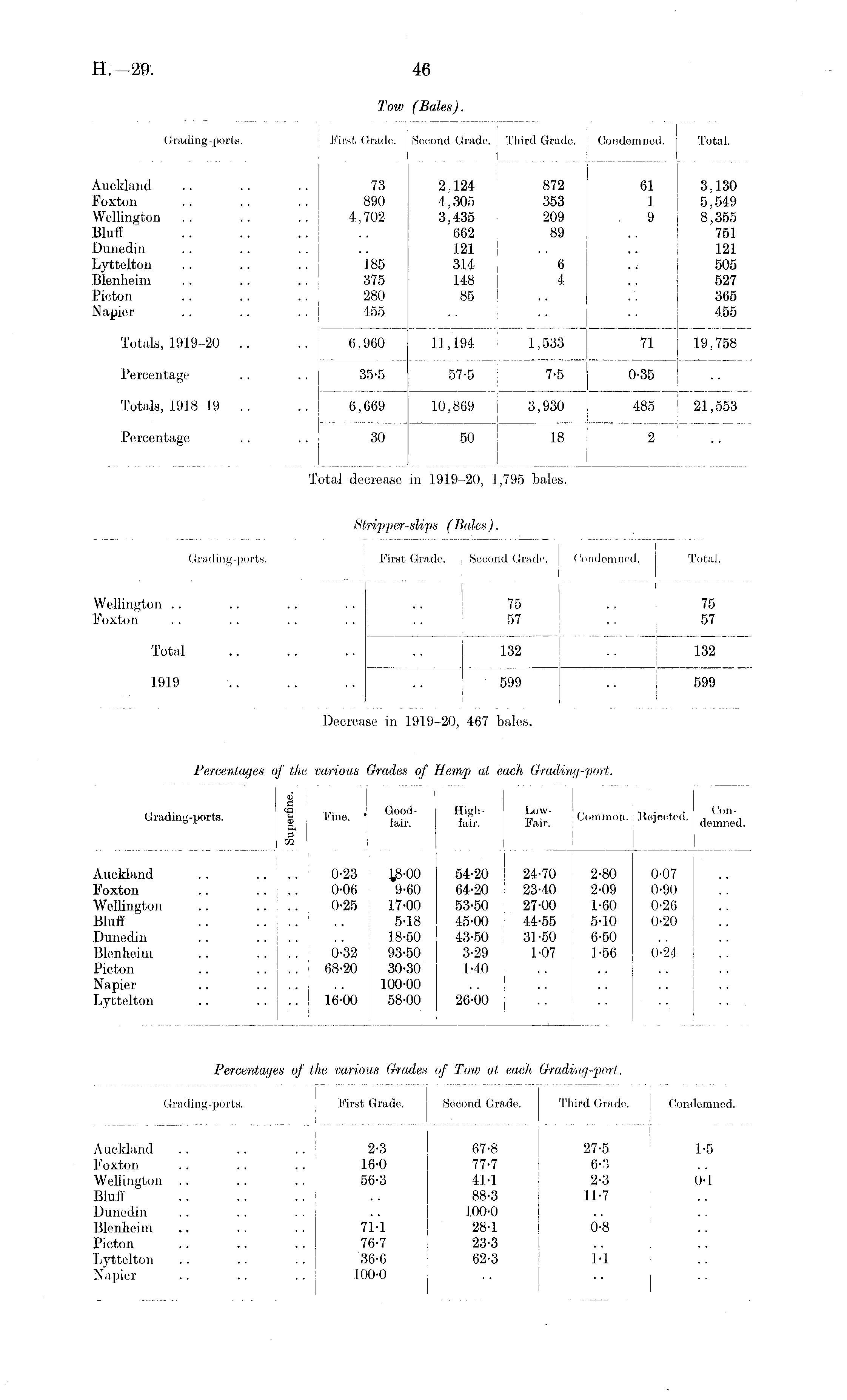 Grading-ports. First Grade. \ I Second Grade. | Third Grade. I Condemned, j Total Auckland Foxton Wellingtern Bluff 73 890 4,702 2,124 872 4.305 353 3,435 209 662 89 121 314 6 148 I 4 85 61 1 9 3,130 5,549 8,355 751 121 505 527 365 455 • • Dunedin Lyttelton Blenheim Picton Napier 185 375 280 455 Totals, 1919-20 .. 6,960 11,194 1,533 71 19,758 Percentage 35-5 57-5 7-5 57-5 0-35 Totals, 1918-19 .. 6,669 10,869 3,930 485 21,553 Percentage 30 50 18 2 Te jtal decrease in 1919-20, 1,795 bales.