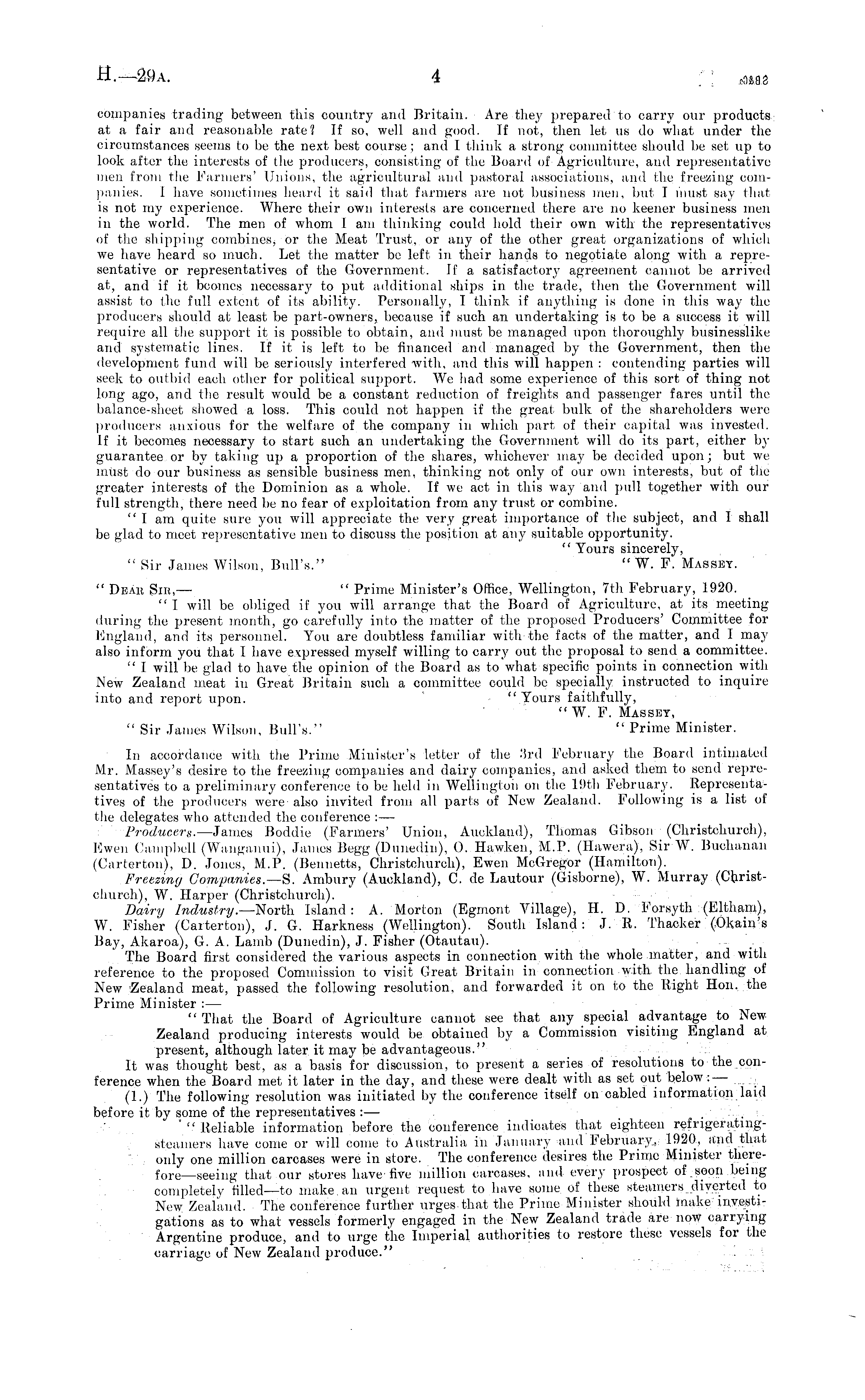 companies trading between this country and Britain. Are the}' prepared to carry our products at a fair and reasonable rate? If so, well and good. If not, then let us do what under the circumstances seems to be the next best course ; and I think a strong committee should be set up to look after the interests of the producers, consisting of the Board of Agriculture, and representative men from the Farmers' Unions, the agricultural and pastoral associations, and the freezing companies. 1 have sometimes heard it said that farmers are not business men, but I must say that is not my experience. Where their own interests are concerned there are no keener business men in the world. The men of whom 1 am thinking could hold their own with the representatives of the shipping combines, or the Meat Trust, or any of the other great organizations of which we have heard so much. Let the matter be left in their hands to negotiate along with a representative or representatives of the Government. If a satisfactory agreement cannot be arrived at, and if it bcomes necessary to put additional ships in the trade, then the Government will assist to the full extent of its ability. Personally, I think if anything is done in this way the producers should at least be part-owners, because if such an undertaking is to be a success it will require all the support it is possible to obtain, and must be managed upon thoroughly businesslike and systematic lines. If it is left to be financed and managed by the Government, then the development fund will be seriously interfered with, and this will happen : contending parties will seek to outbid each other for political support. We had some experience of this sort of thing not long ago, and the result would be a constant reduction of freights and passenger fares until the balance-sheet showed a loss. This could not happen if the great bulk of the shareholders were producers anxious for the welfare of the company in which part of their capital was invested. If it becomes necessary to start such an undertaking the Government will do its part, either by guarantee or by taking up a proportion of the shares, whichever may be decided upon; but we must do our business as sensible business men, thinking not only of our own interests, but of the greater interests of the Dominion as a whole. If we act in this way and pull together with our full strength, there need be no fear of exploitation from any trust or combine. " I am quite sure you will appreciate the very great importance of the subject, and I shall be glad, to meet representative men to discuss the position at any suitable opportunity. " Yours sincerely, " Sir James Wilson, Bull's." " W. F. Massey. " Dear Sir, — " Prime Minister's Office, Wellington, 7th February, 1920. " I will be obliged if you will, arrange that the Board of Agriculture, at its meeting during the present month, go carefully into the matter of the proposed Producers' Committee for England, and its personnel. You are doubtless familiar with the facts of the matter, and I may also inform you that I have expressed myself willing to carry out the proposal to send a committee. " I will be glad to have the opinion of the Board as to what specific points in connection with New Zealand meat in Great Britain such a committee could be specially instructed to inquire into and report upon. " Yours faithfully, " W. F. Massey, " Sir James Wilson, Bull's." " Prime Minister. In accordance with the Prime Minister's letter of the 3rd February the Board intimated Mr. Massey's desire to the freezing companies and dairy companies, and asked them to send representatives to a preliminary conference to be held in Wellington on the 19th February. Representatives of the producers were also invited from all parts of New Zealand. Following is a list of the delegates who attended the conference : — Producer^. —James Boddie (Farmers' Union, Auckland), Thomas Gibson (Christchurch), Ewen Campbell (Wanganui), James Begg (Dunedin), 0. Hawken, M.P. (Hawera), Sir W. Buchanan (Carterton), D. Jones, M.P. (Bennetts, Christchurch), Ewen McGregor (Hamilton). Freezing Companies. —S. Ambury (Auckland), C. de Lautour (Gisborne), W. Murray (Christchurch), W. Harper (Christchurch). Dairy Industry.— North Island: A. Morton (Egmont Village), 11. D. Forsyth (Eltham), W. Fisher (Carterton), J. G. Harkness (Wellington). South Island: J. R. Thacker (Okain's Bay, Akaroa), G. A. Lamb (Dunedin), J. Fisher (Otautau). The Board first considered the various aspects in connection with the whole matter, and with reference to the proposed Commission to visit Great Britain in connection with the handling of New 'Zealand meat, passed the following resolution, and forwarded it on to the Right Hon. the Prime Minister :— "That the Board of Agriculture cannot see that any special advantage to New Zealand producing interests would be obtained by a Commission visiting England at. present, although later it may be advantageous." It was thought best, as a basis for discussion, to present a series of resolutions to the conference when the Board met it later in the day, and these were dealt with as set out below:—• (1.) The following resolution was initiated by the conference itself on cabled information laid before it by some of the representatives : — ... " Reliable information before the conference indicates that eighteen refrigeratmgsteamers have come or will come to Australia, in January and February,,: 1920, and that only one million carcases were in store. The conference desires the Prime Minister therefore—seeing that our stores have five million carcases, and every prospect of.soon being completely tilled—to make.au urgent request to have some of these steamers diverted to New Zealand. The conference further urges that the Prime Minister should make investigations as to what vessels formerly engaged in the New Zealand trade are now carrying Argentine produce, and to urge the Imperial authorities to