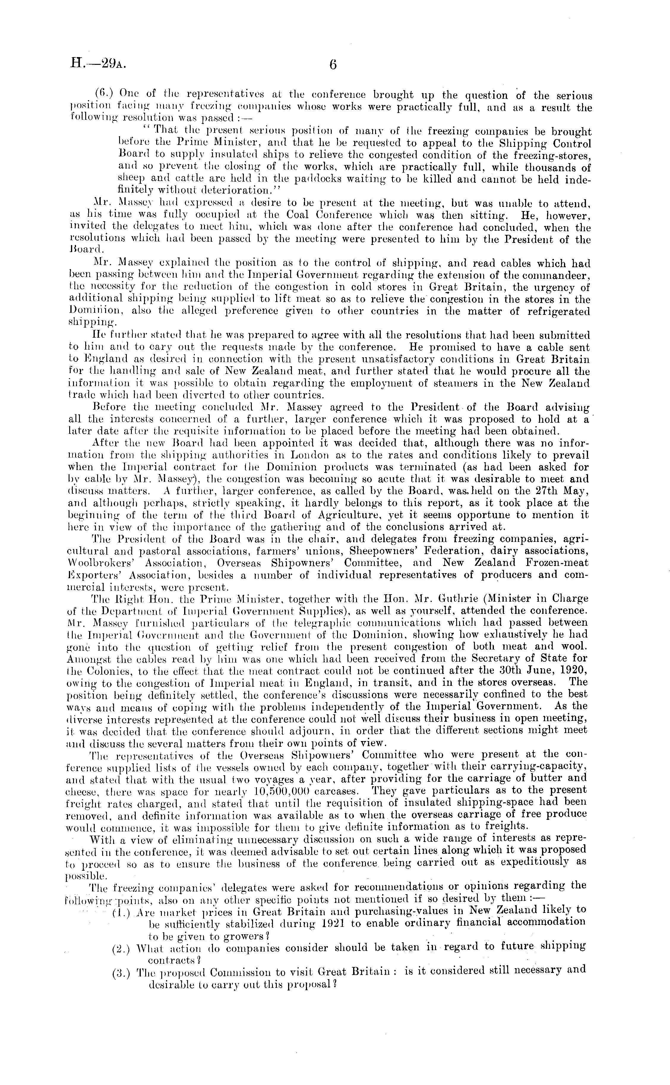 (6.) One of the representatives at the conference brought up the question of the serious position facing many freezing companies whose works were practically full, and as a result the following resolution was passed : — 'That the present serious position of many of the freezing companies be brought before the Prime Minister, and that he lie requested to appeal to the Shipping Control Board to supply insulated ships to relieve the congested condition of the freezing-stores, and so prevent the closing of the works, which are practically full, while thousands of sheep and cattle are held in the paddocks waiting to be killed' and cannot be held indefinitely without deterioration." Mr. Massey had expressed a desire to be present at the meeting, but was unable to attend, as his time was fully occupied at the Coal Conference which was then sitting. He, however, invited the delegates to meet him, which was done after ihe conference had concluded, when the resolutions which had been passed by the meeting were presented to him by the President of the Board. Mr. Massey explained the position as to the control of shipping, and read cables which had been passing between him and the Imperial Government regarding the extension of the commandeer, the necessity for the reduction of the congestion in cold stores in Great Britain, the urgency of additional shipping being supplied to lift meat so as to relieve the congestion in the stores in the Dominion, also the alleged preference given to other countries in the matter of refrigerated shipping. He further stated that he was prepared to agree with all the resolutions that had been submitted to him and to cary out the requests made by the conference. He promised to have a cable sent to England as desired in connection with the present unsatisfactory conditions in Great Britain for the handling and sale of New Zealand meat, and further stated that he would procure all the information it was possible to obtain regarding the employment of steamers in the New Zealand trade which had been diverted to other countries. Before the meeting concluded Mr. Massey agreed to the President of the Board advising all the interests concerned of a further, larger conference which it was proposed to hold at a later date after the requisite information to be placed before the meeting had been obtained. After the new Board had been appointed it was decided that, although there was no information from the shipping authorities in London as to the rates and conditions likely to prevail when the Imperial contract for the Dominion products was terminated (as had been asked for by cable by Mr. Massey), the congestion was becoming so acute that it was desirable to meet and discuss matters. A further, larger conference, as called by the Board, was.held on the 27th May, and although perhaps, strictly speaking, it hardly belongs to this report, as it took place at the beginning of the term of the third Board of Agriculture, yet it seems opportune to mention it here in view of the importance of the gathering and of the conclusions arrived at. The President of the Board was in the chair, and delegates from freezing companies, agricultural and pastoral associations, farmers' unions, Sheepowners' Federation, dairy associations, Woolbrokers' Association, Overseas Shipowners' Committee, and New Zealand Frozen-meat Exporters' Association, besides a number of individual representatives of producers and commercial interests, were present. The Right Hon. the Prime Minister, together with the Hon. Mr. Guthrie (Minister in Charge of the Department of Imperial Government Supplies), as well as yourself, attended the conference. Mr. Massey furnished particulars of the telegraphic communications which had passed between the Imperial Government and the Government of the Dominion, showing how exhaustively he had gone into the question of getting relief from the present congestion of both meat and wool. Amongst the cables read by him was one which had been received from the Secretary of State for the Colonies, to the effect that the meat contract could not be continued after the 30th June, 1920, owing to the congestion of Imperial meat in England, in transit, and in the stores overseas. The position being definitely settled, the conference's discussions were necessarily confined to the best ways and means of coping with the problems independently of the Imperial Government. As the diverse interests represented at the conference could not well discuss their business in open meeting, it was decided that the conference should adjourn, in order that the different sections might meet and discuss the several matters from their own points of view. The representatives of the Overseas Shipowners' Committee who were present at the conference supplied lists of the vessels owned by each company, together with their carrying-capacity, and stated that with the usual two voyages a year, after providing for the carriage of butter and cheese, there was space for nearly 10*500,000 carcases. They gave particulars as to the present freight rates charged, and stated that until the requisition of insulated shipping-space had been removed, and definite information was available as to when the overseas carriage of free produce would commence, it was impossible for them to give definite information as to freights. With a view of eliminating unnecessary discussion on such a wide range of interests as represented in the conference, it was deemed advisable to set out certain lines along which it was proposed to proceed so as to ensure the business of the conference being carried out as expeditiously as possible. The freezing companies' delegates were asked for recommendations or opinions regarding the following points, also on any other specific points not mentioned if so desired by them: —_ (1.) Are market prices in Great Britain and purchasing-values in New Zealand likely to be sufficiently stabilized during 1921 to enable ordin