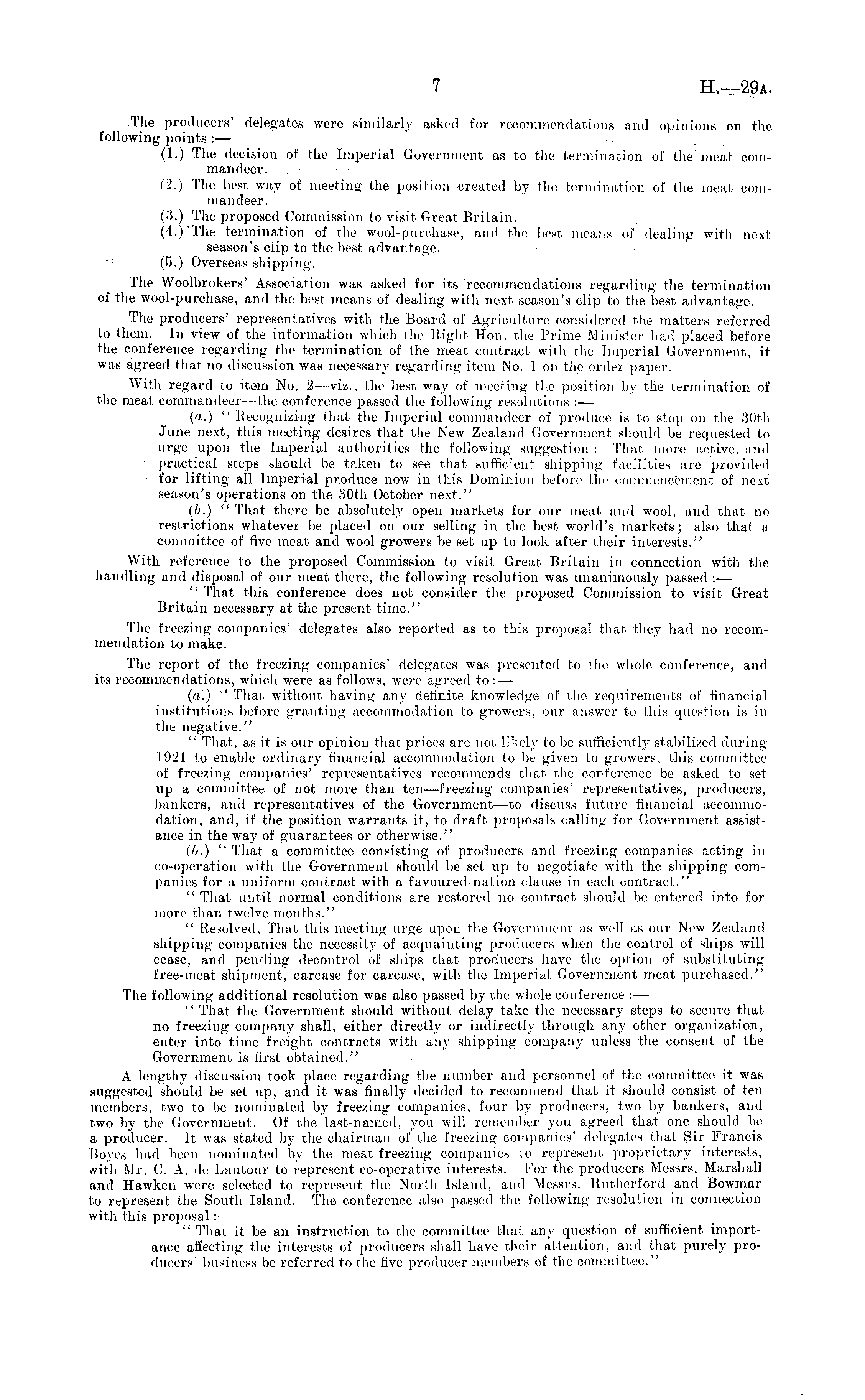 The producers' delegates were similarly asked for recommendations and opinions on the following points : — (1.) The decision of the Imperial Government as to the termination of the meat commandeer. (2.) The best way of meeting the position created by the termination of the meat commandeer. (3.) The proposed Commission to visit Great Britain. (4.) 'The termination of the wool-purchase, and the best means of dealing with next season's clip to the best advantage. (5.) Overseas shipping. The Woolbrokers' Association was asked for its recommendations regarding the termination of the wool-purchase, and the best means of dealing with next season's clip to the best advantage. The producers' representatives with the Board of Agriculture considered the matters referred to them. In view of the information which the Right Hon. the Prime Minister had placed before the conference regarding the termination of the meat contract with the Imperial Government, it was agreed that no discussion was necessary regarding item No. 1 on the order paper. With regard to item No. 2—viz., the best way of meeting the position by the termination of the meat commandeer —the conference passed the following resolutions :— (a.) " Recognizing that the Imperial commandeer of produce is to stop on the 30th June next, this meeting desires that the New Zealand Government should be requested to urge upon the Imperial authorities the following suggestion : That more active, and practical steps should be taken to see that sufficient, shipping facilities are provided for lifting all Imperial produce now in this Dominion before the commencement of next season's operations on the 30th October next." (//.) " That there be absolutely open markets for our meal and wool, and that no restrictions whatever be placed on our selling in the best world's markets; also that, a committee of five meat and wool growers be set up to look after their interests." With reference to the proposed Commission to visit Great Britain in connection with the handling and disposal of our meat there, the following resolution was unanimously passed : — " That this conference does not consider the proposed Commission to visit Great Britain necessary at the present time." The freezing companies' delegates also reported as to this proposal that they had no recommendation to make. The report of the freezing companies' delegates was presented to the whole conference, and its recommendations, which were as follows, were agreed to: — (a.) " That without having any definite knowledge of the requirements of financial institutions before granting accommodation to growers, our answer to this question is in the negative." " That, as it is our opinion that prices are not likely to be sufficiently stabilized during 1921 to enable ordinary financial accommodation, to be given to growers, this committee of freezing companies' representatives recommends that the conference be asked to set up a committee of not more than ten —freezing companies' representatives, producers, bankers, anil representatives of the Government —to discuss future financial accommodation, and, if the position warrants it, to draft proposals calling for Government assistance in the way of guarantees or otherwise." (/;.) " That a committee consisting of producers and freezing companies acting in co-operation with the Government should be set up to negotiate with the shipping companies for a uniform contract with a favoured-nation clause in each contract." " That until normal conditions are restored no contract should be entered into for more than twelve months." " Resolved, That this meeting urge upon the Government as well as our New Zealand shipping companies the necessity of acquainting producers when the control of ships will cease, and pending decontrol of ships that producers have the option of substituting free-meat shipment, carcase for carcase, with the Imperial Government meat purchased." The following additional resolution was also passed by the whole conference :— " That the Government should without delay take the necessary steps to secure that no freezing company shall, either directly or indirectly through any other organization, enter into time freight contracts with any shipping company unless the consent of the Government is first obtained." A lengthy discussion took place regarding the number and personnel of the committee it was suggested should be set up, and it was finally decided to recommend that it should consist of ten members, two to be nominated by freezing companies, four by producers, two by bankers, and two by the Government. Of the last-named, you will remember you agreed that one should be a producer. It was stated by the chairman of the freezing companies' delegates that Sir Francis lioyes had been nominated by the meat-freezing companies to represent proprietary interests, with Mr. C. A. de Lautour to represent co-operative interests. For the producers Messrs. Marshall and Hawken were selected to represent the North Island, and Messrs. Rutherford and Bowmar to represent the South Island. The conference also passed the following resolution in connection with this proposal : — " That it be an instruction to the committee that any question of sufficient importance affecting the interests of producers shall have their attention, and that purely producers' business be referred to the five producer members of the committee."