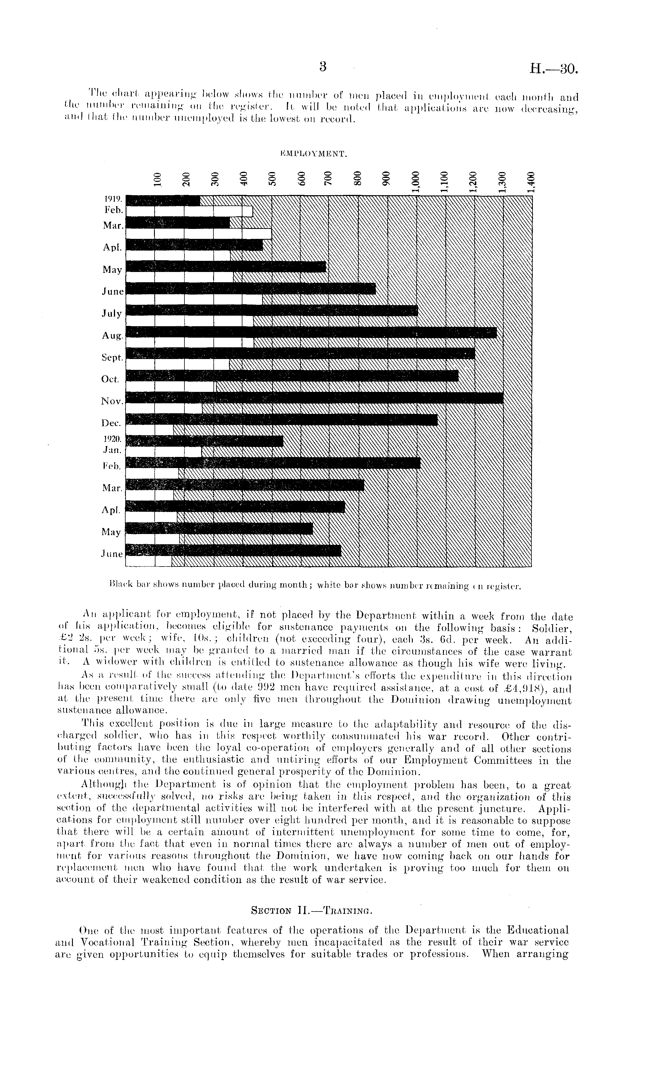 The chart appearing below shows the number of men placed in employment each month and the number remaining on the register. It will be noted that applications are now decreasing, and that the number unemployed is the lowest on record.
