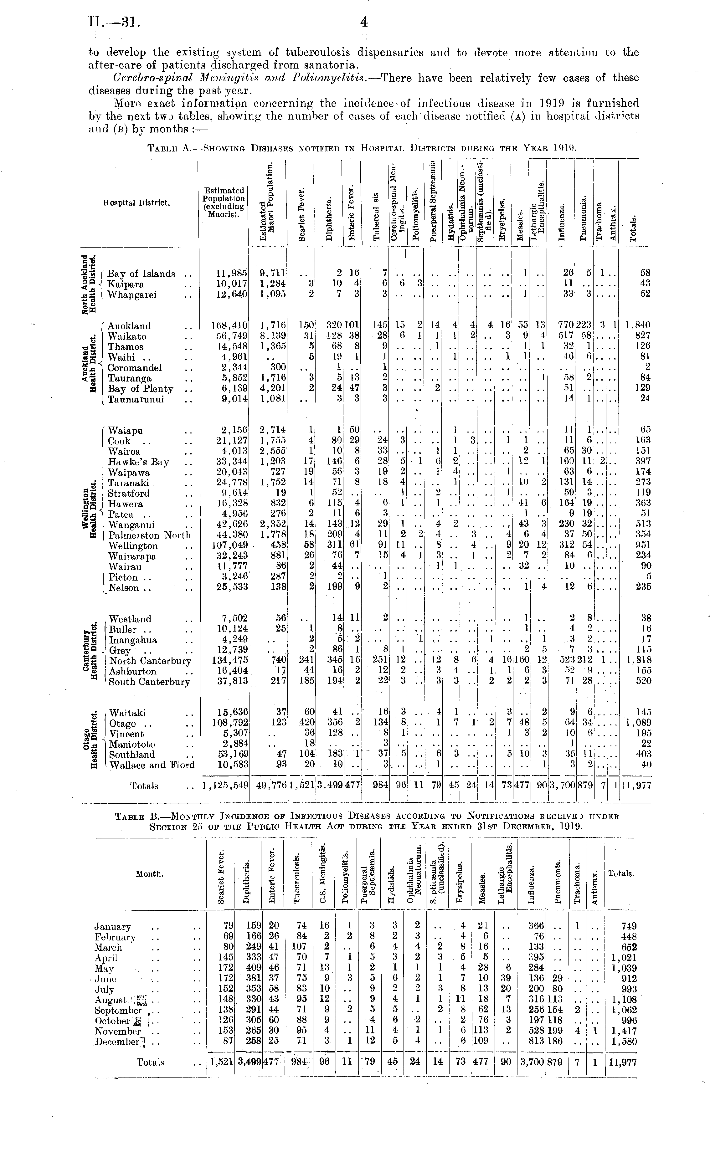 to develop the existing system of tuberculosis dispensaries and to devote more attention to the after-care of patients discharged from sanatoria. Cerebrospinal Meningitis and Poliomyelitis. —There have been relatively few cases of these diseases during the past year. More exact information concerning the incidence of infectious disease in 1919 is furnished by the next twj tables, showing the number of cases of each disease notified (a) in hospital, districts and (b) by months :—