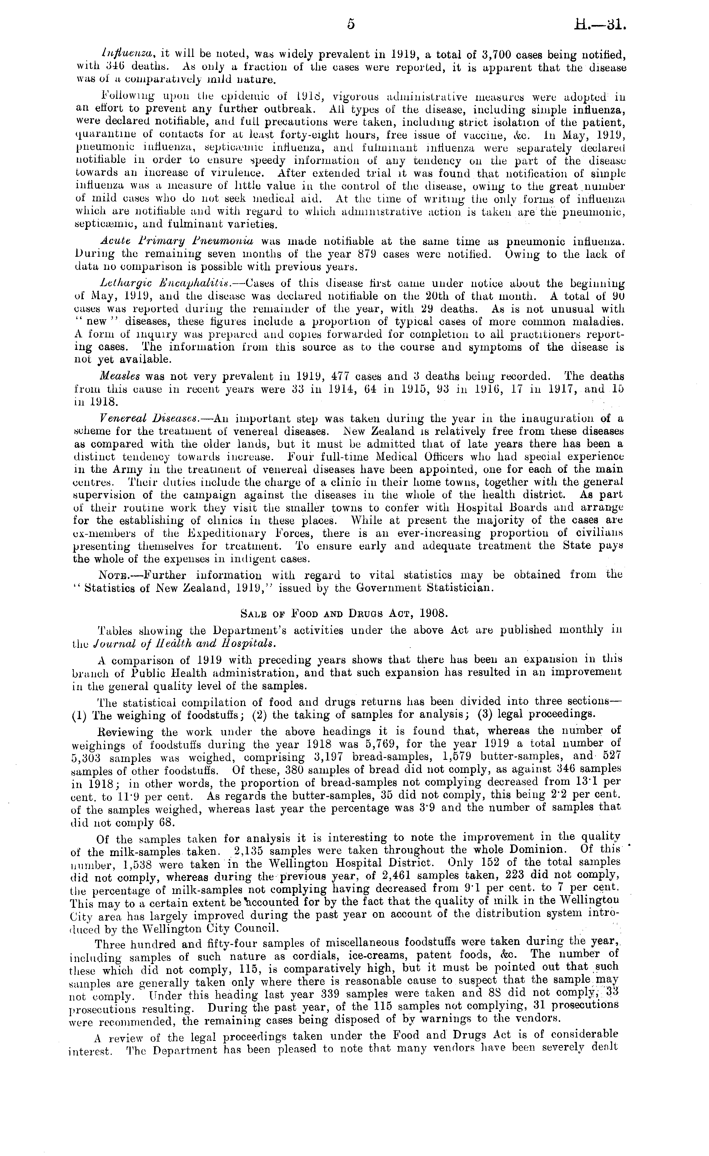 influenza, it will be voted, was widely prevalent in 1919, a total of 3,700 cases being notified, with 346 deaths. As only a fraction of the cases were reported, it is apparent that the disease was of a comparatively mild nature. Following upon the epidemic of 1918, vigorous administrative measures were adopted in an effort to prevent any further outbreak. All types of the disease, including simple influenza, were declared notifiable, and full precautions were taken, including strict isolation of the patient, quarantine of contacts for at least forty-eight hours, free issue of vaccine, &C. in May, 1919, pneumonic influenza, septicaemia influenza, and fulminant influenza were separately declared notifiable in order to ensure speedy information of any tendency on the part of the disease towards an increase of virulence. After extended trial it was found that notification of simple influenza was a measure of little value in the control of the disease, owing to the great number of mild eases who do not seek medical aid. At the time of writing the only forms of influenza which are notifiable and with regard to which administrative action is taken are the pneumonic, septicajmic, and fulminant varieties. Acute Primary Pneumonia was made notifiable at the same time as pneumonic influenza. During the remaining seven months of the year 879 cases were notified. Owing to the lack of data no comparison is possible with previous years. Lethargic Encaphalitis. —Cases of this disease first came under notice about the beginning of May, 1919, and the disease was declared notifiable on the 20th of that month. A total of 90 cases was reported during the remainder of the year, with 29 deaths. As is not unusual with " new " diseases, these figures include a proportion of typical cases of more common maladies. A form of inquiry was prepared and copies forwarded for completion to all practitioners reporting cases. The information from this source as to the course and symptoms of the disease is not yet available. Measles was not very prevalent in 1919, 477 cases and 3 deaths being recorded. The deaths from this cause in recent years were 33 in 1914, 64 in 1915, 93 in 1916, 17 in 1917, and 15 in 1918. Venereal Diseases. —An important step was taken during the year in the inauguration of a scheme for the treatment of venereal diseases. i\ew Zealand is relatively free from these diseases as compared with the older lands, but it must be admitted that of late years there has been a distinct tendency towards increase. Pour full-time Medical Officers who had special experience in the Army in the treatment of venereal diseases have been appointed, one for each of the main centres. Their duties include the charge of a clinic in their home towns, together with the general supervision of the campaign against the diseases in the whole of the health district. As part of their routine work they visit the smaller towns to confer with Hospital Boards and arrange for the establishing of clinics in these places. While at present the majority of the cases are ex-members of the Expeditionary Forces, there is an ever-increasing proportion of civilians presenting themselves for treatment. To ensure early and adequate treatment the State pays the whole of the expenses in indigent cases. Note. —Further information with regard to vital statistics may be obtained from the " Statistics of New Zealand, 1919," issued by the Government Statistician. Sale of Food and Drugs Act, 1908. Tables showing the Department's activities under the above Act are published monthly in the Journal of Health and Hospitals. A comparison of 1919 with preceding years shows that there has been an expansion in this branch of Public Health administration, and that such expansion has resulted in an improvement in the general quality level of the samples. The statistical compilation of food and drugs returns has been divided into three sections — (1) The weighing of foodstuffs; (2) the taking of samples for analysis; (3) legal proceedings. Reviewing the work under the above headings it is found that, whereas the number of weighings of foodstuffs during the year 1.918 was 5,769, for the year 1919 a total number of 5,303 samples was weighed, comprising 3,197 bread-samples, 1,579 butter-samples, and 527 samples of other foodstuffs. Of these, 380 samples of bread did not comply, as against 346 samples in 1918; in other words, the proportion of bread-samples not complying decreased from 13 - 1 per cent, to IP9 per cent. As regards the butter-samples, 35 did not comply, this being 22 per cent, of the samples weighed, whereas last year the percentage was 3 - 9 and the number of samples that did not comply 68. Of the samples taken for analysis it is interesting to note the improvement in the quality of the milk-samples taken. 2,135 samples were taken throughout the whole Dominion. Of this number, 1,538 were taken in the Wellington Hospital District. Only 152 of the total samples did not comply, whereas during the previous year, of 2,461 samples taken, 223 did not comply, the percentage of milk-samples not complying having decreased from 9"1 per cent, to 7 per cent. This may to a certain extent be Accounted for by the fact that the quality of milk in the Wellington City area has largely improved during the past year on account of the distribution system introduced by the Wellington City Council. Three hundred and fifty-four samples of miscellaneous foodstuffs were taken during the year, including samples of such nature as cordials, ice-creams, patent foods, &c. The number of these which did not comply, 115, is comparatively high, but it must be pointed out that such samples are generally taken only where there is reasonable cause to suspect that the sample may not comply. Under this heading last year 339 samples were taken and 8S did not comply, 33 prosecutions resulting. During the past year, of the 115 samples not complying, 31 prosecutions were recommended, the rem