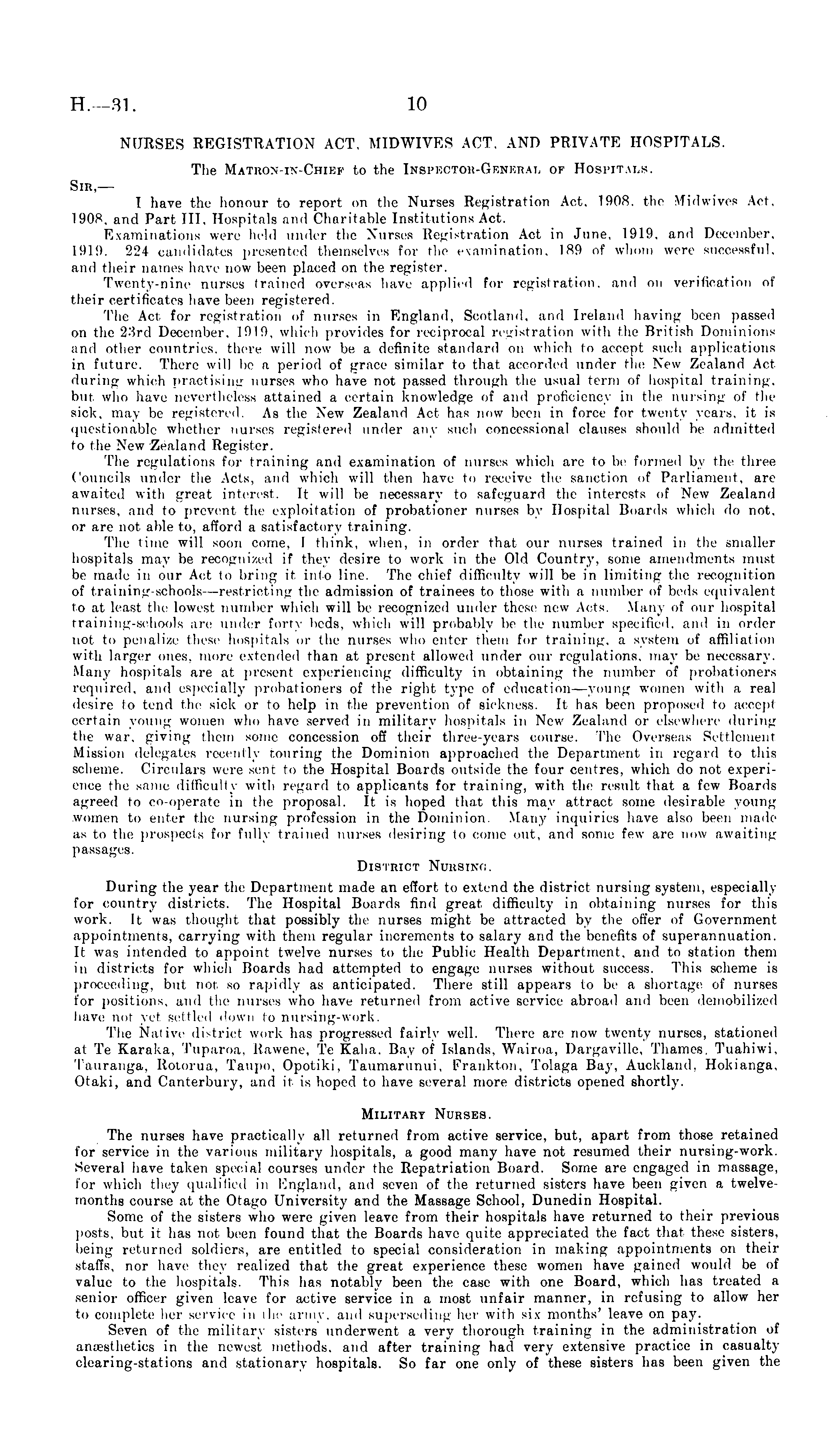 NURSES REGISTRATION ACT, MIDWIYES ACT, AND PRIVATE HOSPITALS. The Matron-in-Chief to the Inspector-General of Hospitals. Sir, — I have the honour to report on the Nurses Registration Act, 1908, the Midwjves Act, 1908, and Part 111, Hospitals and Charitable Institutions Act. Examinations were held under the Nurses Registration Act in June, 1919, and December, 1919. 224 candidates presented themselves for the examination, 189 of whom were successful, and their names have now been placed on the register. Twenty-nine nurses trained overseas have applied for registration, and on verification of their certificates have been registered. The Act for registration of nurses in England, Scotland, and Ireland having been passed on the 23rd December, 1919, which provides for reciprocal registration with the British Dominions and other countries, there will now be a definite standard on which to accept such applications in future. There will be a period of grace similar to that accorded under the New Zealand Act during which practising nurses who have not passed through the usual term of hospital training, but who have nevertheless attained a certain knowledge of and proficiency in the nursing of the sick, may be registered. As the New Zealand Act has now been in force for twenty years, it is questionable whether nurses registered under any such concessional clauses should be admitted to the New Zealand Register. The regulations for training and examination of nurses which are to be formed by the three Councils under the Acts, and which will then have to receive the sanction of Parliament, are awaited with great interest. It will be necessary to safeguard the interests of New Zealand nurses, and to prevent the exploitation of probationer nurses by Hospital Boards which do not, or are not able to, afford a satisfactory training. The time will soon come, I think, when, in order that our nurses trained in the smaller hospitals may be recognized if they desire to work in the Old Country, some amendments must be made in our Act to bring it into line. The chief difficulty will be in limiting the recognition of training-schools—restricting the admission of trainees to those with a number of beds equivalent to at least the lowest number which will be recognized under these new Acts. Many of our hospital training-schools are under forty beds, which will probably be the number specified, and in order not to penalize these hospitals or the nurses who enter them for training, a system of affiliation with larger ones, more extended than at present allowed under our regulations, may be necessary. Many hospitals are at present experiencing difficulty in obtaining the number of probationers required, and especially probationers of the right type of education—young women with a real desire to tend the sick or to help in the prevention of sickness. It has been proposed to accept certain young women who have served in military hospitals in New Zealand or elsewhere during the war, giving them some concession off their tliree-years course. The Overseas Settlement Mission delegates recently touring the Dominion approached the Department in regard to this scheme. Circulars were sent to the Hospital Boards outside the four centres, which do not experience the same difficulty with regard to applicants for training, with the result that a few Boards agreed to co-operate in the proposal. It is hoped that this may attract some desirable young women to enter the nursing profession in the Dominion. Many inquiries have also been made as to the prospects for fully trained nurses desiring to come out, and some few are now awaiting passages. District Nursing. During the year the Department made an effort to extend the district nursing system, especially for country districts. The Hospital Boards find great difficulty in obtaining nurses for this work. It was thought that possibly the nurses might be attracted by the offer of Government appointments, carrying with them regular increments to salary and the benefits of superannuation. It was intended to appoint twelve nurses to the Public Health Department, and to station them in districts for which Boards had attempted to engage nurses without success. This scheme is proceeding, but not so rapidly as anticipated. There still appears to be a shortage of nurses for positions, and the nurses who have returned from active service abroad and been demobilized have not yet settled down to nursing-work. The Native district work has progressed fairly well. There are now twenty nurses, stationed at Te Karaka, Tuparoa, Rawene, Te Kaha, Bay of Islands, Wairoa, Dargaville, Thames, Tuahiwi, Tauranga, Rotorua, Taupo, Opotiki, Taumarunui, Frankton, Tolaga Bay, Auckland, Hokianga, Otaki, and Canterbury, and it is hoped to have several more districts opened shortly. Military Nurses. The nurses have practically all returned from active service, but, apart from those retained for service in the various military hospitals, a good many have not resumed their nursing-work. Several have taken special courses under the Repatriation Board. Some are engaged in massage, for which they qualified in England, and seven of the returned sisters have been given a twelvemonths course at the Otago University and the Massage School, Dunedin Hospital. Some of the sisters who were given leave from their hospitals have returned to their previous posts, but it has not been found that the Boards have quite appreciated the fact that these sisters, being returned soldiers, are entitled to special consideration in making appointments on their staffs, nor have they realized that the great experience these women have gained would be of value to the hospitals. This has notably been the case with one Board, which has treated a senior officer given leave for active service in a most unfair manner, in refusing to allow her to complete her service in the army, and superseding her with six months' leave on pay. Seven of the military