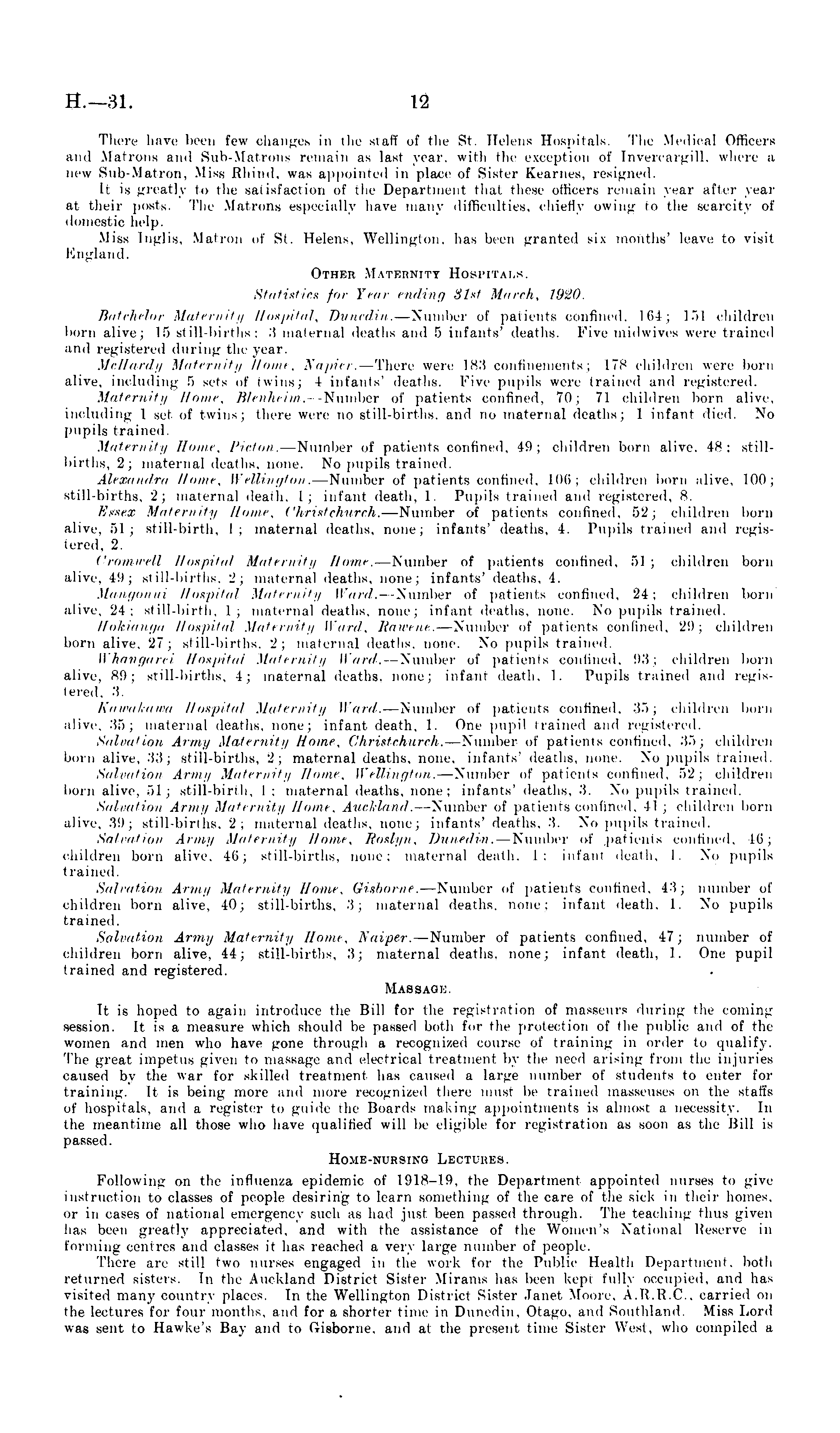 There have been few changes in the staff of the St. Helens Hospitals. The Medical Officers and Matrons and Sub-Matrons remain as last year, with the exception of Invercargill, where a new Sub-Matron, Miss Rhind, was appointed in place of Sister Kearnes, resigned. It is greatly to the satisfaction of the Department that these officers remain year after year at their posts. The Matrons especially have many difficulties, chiefly owing to the scarcity of domestic help. Miss Inglis, Matron of St. Helens, Wellington, has been granted six months' leave to visit England. Other Maternity Hospitals. Statistics for Year ending Slst March, .7920. Batchelor Maternity Hospital, Dune-din.—Number of patients confined, 164; 151 children born alive; 15 still-births; 3 maternal deaths and 5 infants' deaths. Five midwives were trained and registered during the year. McHardy Maternity Home, Napier. —There were 183 confinements; 178 children were born alive, including 5 sets of twins; 4 infants' deaths. Five pupils were trained and registered. Maternity Home, Blenheim. —Number of patients confined, 70; 71 children born alive, including 1 set of twins; there were no still-births, and no maternal deaths; 1 infant died. No pupils trained. Maternity Home, Picton.—Number of patients confined, 49; children born alive. 48; stillbirths, 2; maternal deaths, none. No pupils trained. Alexandra Home, Wellington.—Number of patients confined, 106; children born alive, 100; still-births, 2; maternal death, 1; infant death, I. Pupils trained and registered, 8. Egsex Maternity Home, Christ church. —Number of patients confined, 52; children born alive, 51; still-birth, 1; maternal deaths, none; infants' deaths, 4. Pupils trained and registered, 2. Cromwell Hospital, Maternity Home. —Number of patients confined, 51; children born alive, 4-9; still-births, 2; maternal deaths, none; infants' deaths, 4. Mangonui Hospital Maternity Ward. —Number of patients confined, 24; children born alive, 24; still-birth, 1; maternal deaths, none; infant deaths, none. No pupils trained. Hokianga Hospital Maternity Ward, Rawene.—Number of patients confined, 29; children born alive, 27; still-births, 2; maternal deaths, none. No pupils trained. Whangarei Hospital Maternity Hard.—Number of patients confined, 93; children born alive, 89; still-births, 4; maternal deaths, none; infant death, 1. Pupils trained and registered, 3.' Kawakawa Hospital Maternity Ward.—Number of patients confined, 35; children born alive, 35; maternal deaths, none; infant death, 1. One pupil trained and registered. Salvation Army Maternity Home, Christ-church. —Number of patients confined, 35; children born alive, 33; still-births, 2; maternal deaths, none, infants' deaths, none. No pupils trained. Salvation Army Maternity Home, Wellington.—Number of patients confined, 52; children born alive, 51; still-birth, 1; maternal deaths, none; infants' deaths, 3. No pupils trained. Salvation Army Maternity Home, Auckland. —Number of patients confined, 41 ; children born alive, 39; still-births, 2; maternal deaths, none; infants' deaths, 3. No pupils trained. Salvation Army Maternity Home, Roslyn, Dune-dim. —Number of patients confined, 46; children born alive, 46; still-births, none; maternal death. 1; infant death, 1. No pupils trained. Salvation Army Maternity Home, Gisbome. —Number of patients confined, 43; number of children born alive, 40; still-births, 3; maternal deaths, none; infant death, 1. No pupils trained. Salvation Army Maternity Home, Naiper. —Number of patients confined, 47; number of children born alive, 44; still-births, 3; maternal deaths, none; infant death, 1. One pupil trained and registered. Massage. It is hoped to again introduce the Bill for the registration of masseurs during the coming session. It is a measure which should be passed both for the protection of the public and of the women and men who have gone through a recognized course of training in order to qualify. The great impetus given to massage and electrical treatment by the need arising from the injuries caused by the war for skilled treatment has caused a large number of students to enter for training. It is being more and more recognized there must be trained masseuses on the staffs of hospitals, and a register to guide the Boards making appointments is almost a necessity. In the meantime all those who have qualified will be eligible for registration as soon as the Bill is passed. Home-nursing Lectures. Following on the influenza epidemic of 1918-19, the Department appointed nurses to give instruction to classes of people desiring to learn something of the care of the sick in their homes, or in cases of national emergency such as had just been passed through. The teaching thus given has been greatly appreciated, and with the assistance of the Women's National Reserve in forming centres and classes it has reached a very large number of people. There are still two nurses engaged in the work for the Public Health Department, both returned sisters. In the Auckland District Sister Mirams has been kept fully occupied, and has visited many country places. In the Wellington District Sister Janet Moore, A.R.R.C., carried on the lectures for four months, and for a shorter time in Dunedin, Otago, and Southland. Miss Lord was sent to Hawke's Bay and to Gisborne, and at the present time Sister West, who compiled a