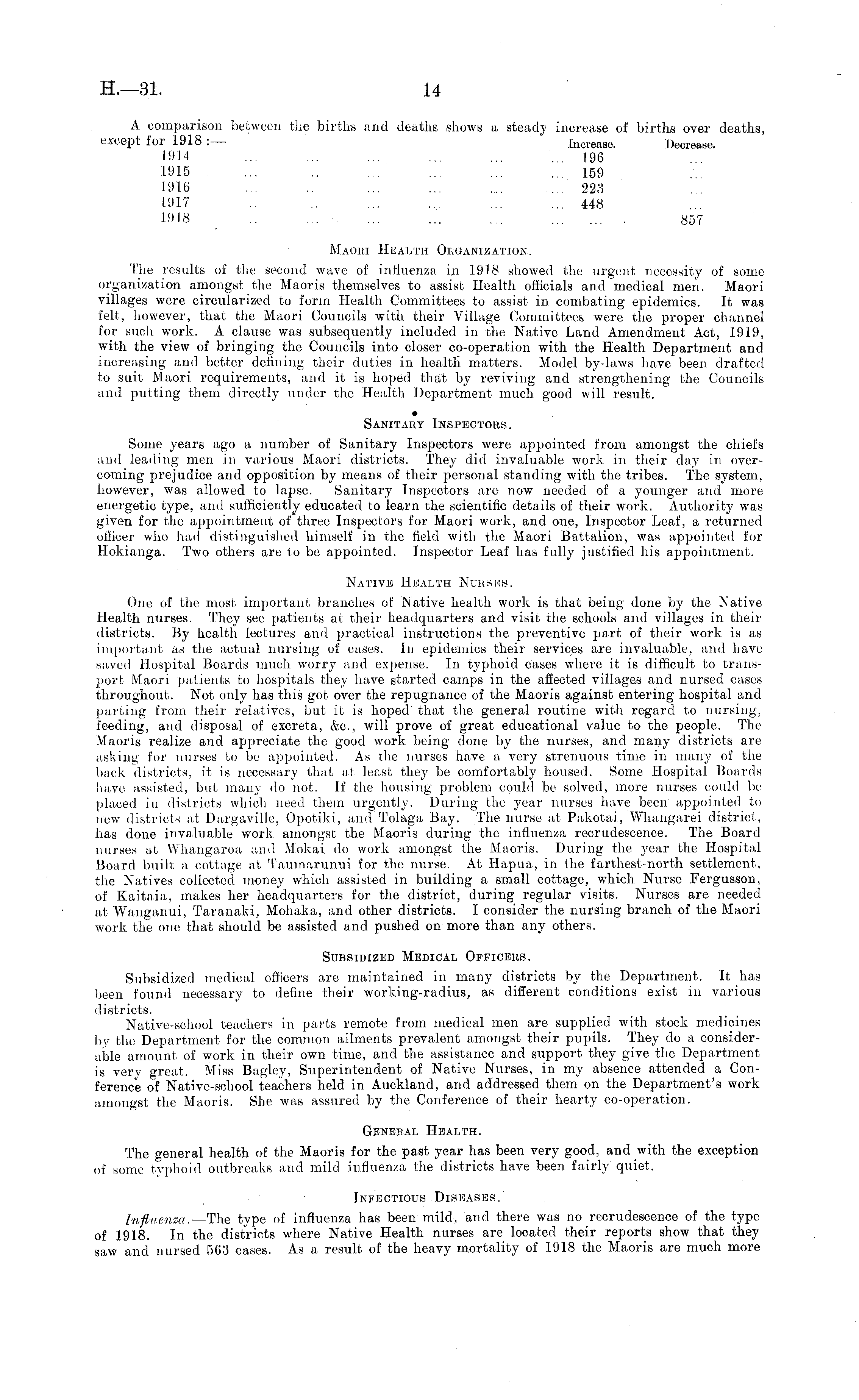 A comparison between the births ami deaths shows a steady increase of births over deaths, except for 1918 :— Increase. Decrease. 1914 ... ... ... ... ... ... 196 1915 ... .. ... ... ... ... 159 1916 ... .. ... ... .... ... 223 1917 ... ... ... ... 448 1918 857 Maori Health Organization.. The results of thi! second wave of influenza in 1.918 showed the urgent necessity of some organization amongst the Maoris themselves to assist Health officials and medical men. Maori villages were circularized to form Health Committees to assist in combating epidemics. It was felt, however, that the Maori Councils with their Village Committees were the proper channel for such work. A clause was subsequently included in the Native Land Amendment Act, 1919, with the view of bringing the Councils into closer co-operation with the Health Department and increasing and better defining their duties in health matters. Model by-laws have been drafted to suit Maori requirements, and it is hoped that by reviving and strengthening the Councils and putting them directly under the Health Department much good will result. Sanitary Inspectors. Some years ago a number of Sanitary Inspectors were appointed from amongst the chiefs and leading men in various Maori districts. They did invaluable work, in their day in overcoming prejudice and opposition by means of their personal standing with the tribes. The system, however, was allowed to lapse. Sanitary Inspectors are now needed of a younger and more energetic type, and sufficiently educated to learn the scientific details of their work. Authority was given for the appointment of three Inspectors for Maori work, and one, Inspector Leaf, a returned officer who had distinguished himself in the field with the Maori Battalion, was appointed for liokianga. Two others are to be appointed. Inspector Leaf has fully justified his appointment. Native Health Nurses. One of the most important branches of Native health work is that being done by the Native Health nurses. They see patients at their headquarters and visit the schools and villages in their districts. By health lectures and practical instructions the preventive part of their work is as important as the actual nursing of cases. In epidemics their services are invaluable, and have saved Hospital Boards much worry and expense. In typhoid cases where it is difficult to transport Maori patients to hospitals they have started camps in the affected villages and nursed eases throughout. Not only has this got over the repugnance of the Maoris against entering hospital and parting from their relatives, but it is hoped that the general routine with regard to nursing, feeding, and disposal of excreta, &0., will prove of great educational value to the people. The Maoris realize and appreciate the good work being done by the nurses, and many districts are asking for nurses to be appointed. As the nurses have a very strenuous time in many of the back districts, it is necessary that at least they be comfortably housed. Some Hospital Boards have assisted, but many do not. If the housing problem could be solved, more nurses could be placed in districts which need them urgently. During the year nurses have been appointed to new districts at Dargaville, Opotiki, and Tolaga Bay. The nurse at Pakotai, Whangarei district, has done invaluable work amongst the Maoris during the influenza recrudescence. The Board nurses at Whangaroa find Mokai do work amongst the Maoris. During the year the Hospital Board built a cottage at Taumarunui for the nurse. At Hapua, in the farthest-north settlement, the Natives collected money which assisted in building a small cottage, which Nurse Fergusson, of Kaitaia, makes her headquarters for the district, during regular visits. Nurses are needed at Wanganui, Taranaki, Mohaka, and other districts. I consider the nursing branch of the Maori work the one that should be assisted and pushed on more than any others. Subsidized Medical Officers. Subsidized medical officers are maintained in many districts by the Department. It has been found necessary to define their working-radius, as different conditions exist in various districts. Native-school teachers in parts remote from medical men are supplied with stock medicines by the Department for the common ailments prevalent amongst their pupils. They do a considerable amount of work in their own time, and the assistance and support they give the Department is very great. Miss Bagley, Superintendent of Native Nurses, in my absence attended a Conference of Native-school teachers held in Auckland, and addressed them on the Department's work amongst the Maoris. She was assured by the Conference of their hearty co-operation. General Health. The general health of the Maoris for the past year has been very good, and with the exception of some typhoid outbreaks and mild influenza the districts have been fairly quiet. Infectious Diseases. Influenza. —The type of influenza has been mild, and there was no recrudescence of the type of 1918. In the districts where Native Health nurses are located their reports show that they saw and nursed 563 cases. As a result of the heavy mortality of 1918 the Maoris are much more