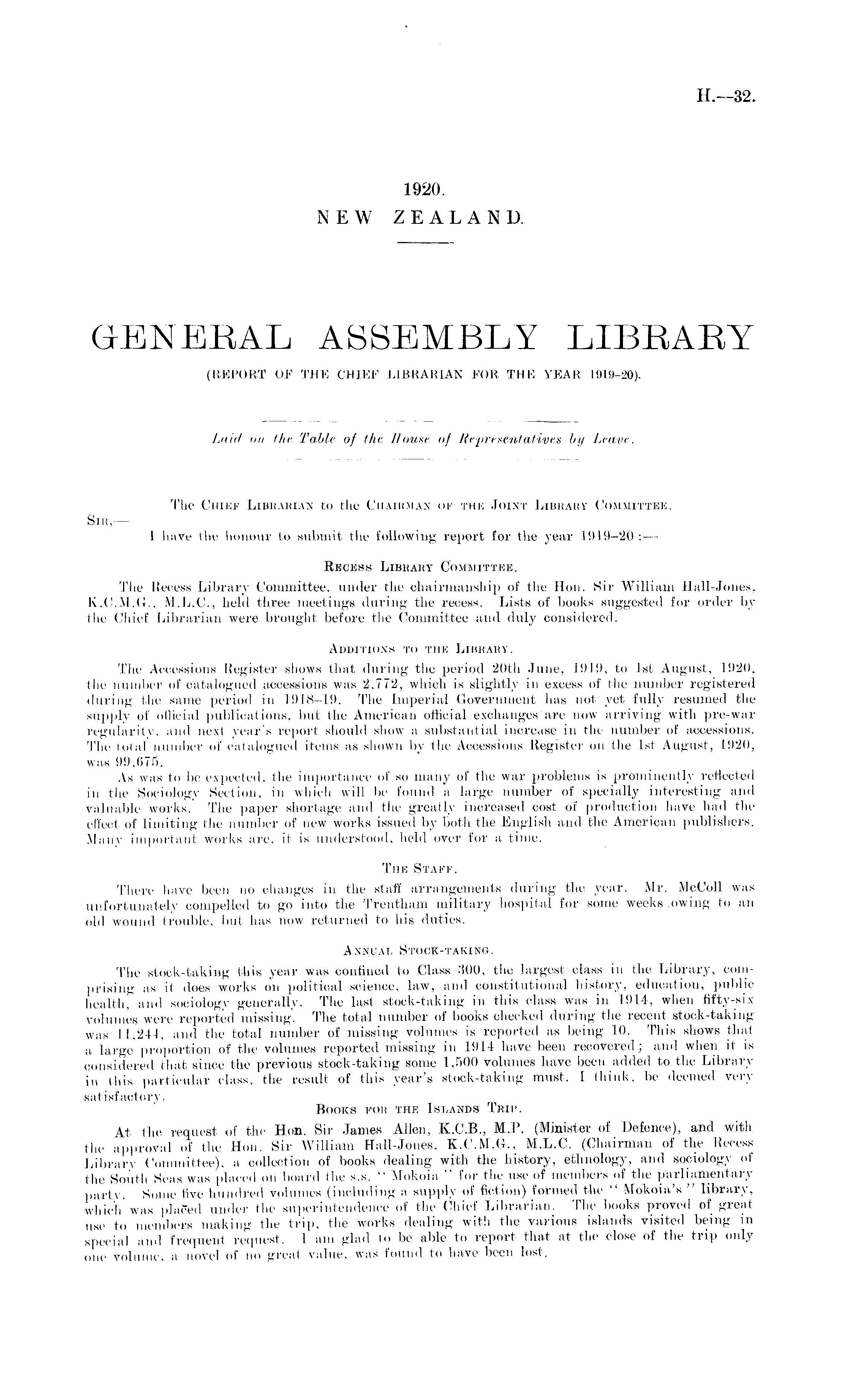 The Chief Librarian to the Chairman of the Joint Library Committee. Sir, — I have the honour to submit the following report for the year 1919—20: — Recess Library Committee. The Recess Library Committee, under the chairmanship of the Hon. Sir William Hall-Jones, K.C.M.G., M.L.C., held three meetings during the recess. Lists of bonks suggested for order by the Chief Librarian were brought before the Committee and duly considered. Additions to the Library. The Accessions Register shows that during the period 20th June, 1919, to Ist August, 1920. the number of catalogued accessions was 2,772, which is slightly in excess of the number registered during the same period in L 918—19. 'flic Imperial Government has not yet fully resumed the supply of official publications, but the American official exchanges are now arriving with pre-war regularity, and next year's report should show a substantial increase in the number of accessions. The total number of catalogued items as shown by the Accessions Register on the Ist August, 192(1. was 99,675. As was to be expected, the importance of so many of the war problems is prominently reflected in the Sociology Section, in which will be found a large number of specially interesting and valuable works. The paper shortage and the greatly increased cost of production have had the effect of limiting the number of new works issued by Both the English and the American publishers. Mane important works are, it is understood, held over for a time. The Staff. There have been no changes in the staff arrangements during the year. Air. McColl was unfortunately compelled to go into the Treutham military hospital for some weeks owing to an old wound trouble, but has now returned to his duties. Annual Stock-taking. The stock-taking this year was confined to Class 300, the largest class in the Library, comprising as it does works on political science, law, and constitutional history, education, public health, and sociology generally. The last stock-taking in this class was in 1914, when fifty-six volumes were reported missing. The total number of books checked during the recent stock-taking was 11,244, and the total number of missing volumes is reported as being 10. This shows that a large proportion of the volumes reported missing in 1914 have been recovered; and when it is considered that since the previous stock-taking some 1,500 volumes have been added to the Library in this particular class, the result of this year's stock-taking must. I think, be deemed very satisfactory. Books for the Islands Trip. At the request of the Hon. Sir James Allen, X.C.8., M.P. (Minister of Defence), and with the approval of the Hon. Sir William Hall-Jones. K.C.M.G., M.L.C. (Chairman of the Recess Library Committee), a collection of books dealing with the history, ethnology, and sociology of the South Seas was placed on board the s.s. " Mokoia " for the use of members of the parliamentary party. Some five hundred volumes (including a supply of fiction) formed the " Mokoia's " library, which was placed under the superintendence of the Chief Librarian. The books proved of great use to members making the trip, the works dealing with the various islands visited being in special and frequent request. 1 am glad to be able to report that at the close of the trip only one volume, a novel of no great value, was found to have been lost.
