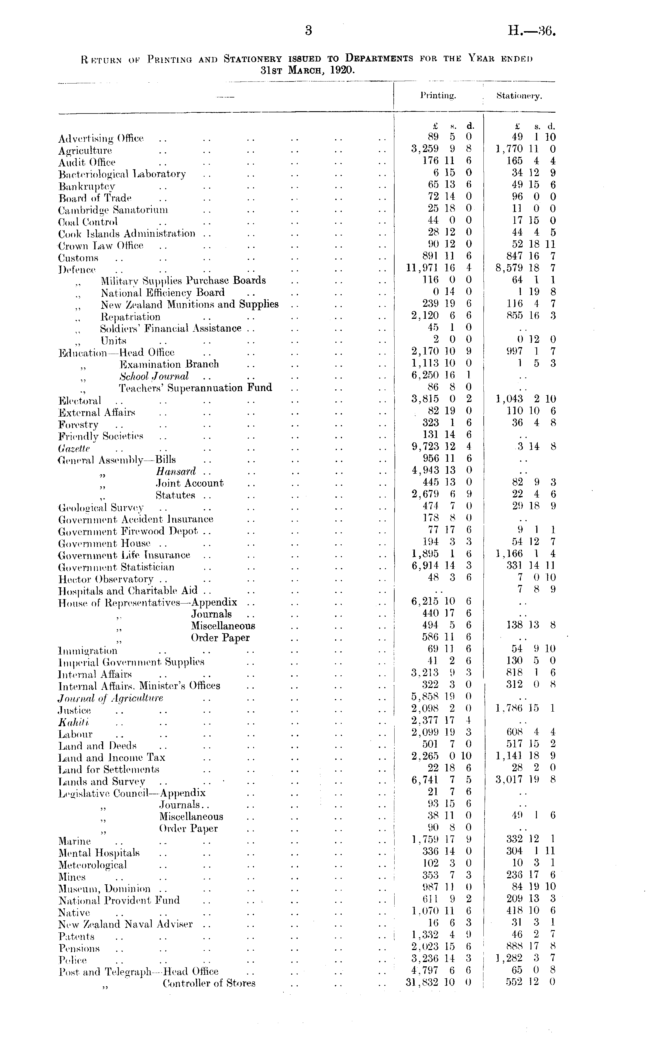 Printing. Stationery. Advertising Office Agriculture Audit Office Bacteriological Laboratory Bankruptcy Board of Trade Cambridge Sanatorium Coal Control Cook Islands Administration .. Crown Law Office Customs Defence Military Supplies Purchase Boards National Efficiency Board ,, New Zealand Munitions and Supplies ,, Repatriation ,, Soldiers' Financial Assistance . . Units Education —Head Office ,, Examination Branch ,, School Journal ., Teachers' Superannuation Fund Electoral External Affairs Forestry Friendly Societies Gazette" .. General Assembly —Bills „ Hansard . . ,, Joint Account ,. Statutes Geological Survey Government Accident Insurance Government Firewood Depot Government House Government Life Insurance Government Statistician Hector Observatory Hospitals and Charitable Aid .. House of Representatives —Appendix .. ,, Journals ,, Miscellaneous ,, Order Paper Immigration Imperial Government Supplies Internal Affairs Internal Affairs. Minister's Offices Journal of Agriculture Jusl ice Kahili Labour Band and Deeds Land and Income Tax Land for Settlements Lands and Survey . . Legislative Council —Appendix ,, Journals.. ,, Miscellaneous ,, Order Paper Marine Mental Hospitals Meteorological Mines Museum, Dominion National Provident Fund . . ... Native New Zealand Naval Adviser Patents Pensions Police Post and Telegraph—Head Office ,, Controller of Stores £ s. d. 89 5 0 3,259 9 8 176 11 6 6 15 0 65 13 6 72 11 0 25 18 0 44 0 0 28 12 0 90 12 0 891 11 6 11,971 16 4 116 0 0 0 11 0 239 19 6 2,120 6 6 45 1 0 2 0 0 2,170 10 9 1,113 10 0 6,250 16 I 86 8 0 3.815 0 2 82 19 0 323 I 6 131 14 6 9,723 12 I 956 11 6 4,943 13 0 445 13 0 2.679 6 9 474 7 0 178 8 0 77 17 6 194 3 3 1,895 1 6 6,914 14 3 48 3 6 6,215 10 6 440 17 6 494 5 6 586 11 6 69 11 6 11 2 6 3.213 9 3 322 3 0 5,858 HI 0 2.098 2 0 2.377 17 I 2.099 19 3 501 7 0 2.265 0 III 22 18 6 6,741 7 5 21 7 6 1)3 15 6 38 II 0 90 8 0 1.759 17 9 336 14 0 102 3 0 353 7 3 987 11 o till 9 2 1.070 11 6 16 6 3 1.332 1 9 2.023 15 6 3,236 1 1 3 4.797 6 6 31,832 lo o £ s. d. 49 1 10 1,770 11 0 165 4 4 34 12 9 49 15 6 96 0 0 11 0 0 17 15 0 44 4 5 52 18 11 847 16 7 8,579 18 7 64 1 1 I 19 8 116 1 7 855 16 3 0 12 0 997 I 7 1 5 3 1,043 2 10 110 10 6 36 4 8 3 14 8 82 9 3 22 4 6 29 18 9 9 1 I 54 12 7 1,166 1 4 331 14 11 7 0 10 7 8 9 138 13 8 54 9 10 130 5 0 818 1 6 312 0 8 I .786 15 1 60S 4 4 517 15 2 1,141 18 9 28 2 0 3,017 19 8 I'J 1 6 332 12 1 301 I 11 10 3 1 2.".;; 17 6 84 19 10 209 13 3 118 10 6 31 3 1 16 2 7 SSS 17 8 1,282 3 7 65 0 8 552 12 0