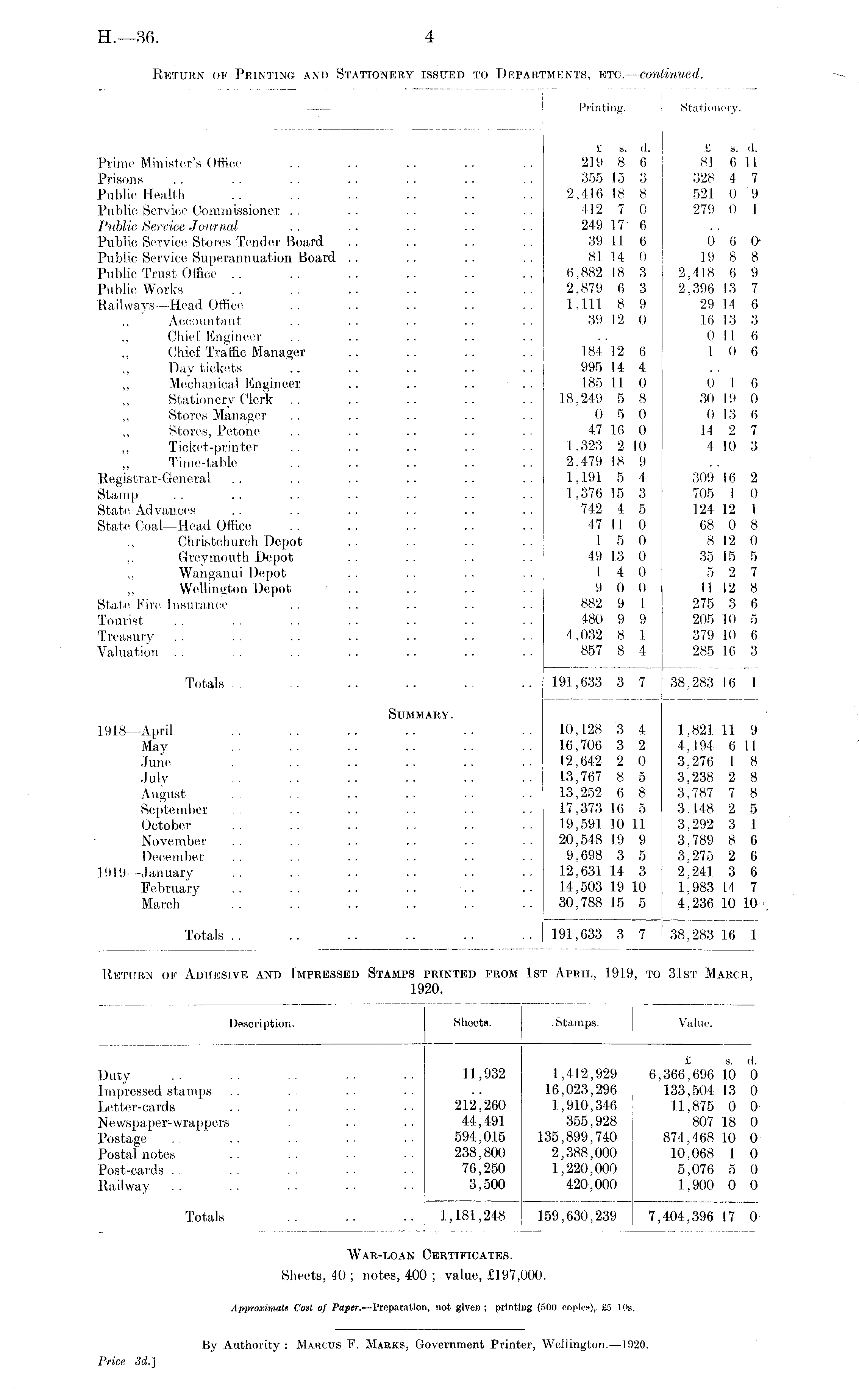 Printing. Stationery. Prime Minister's Office Prisons Public Health Public Service Commissioner Public Service Journal Public Service Stores Tender Board Public Service Superannuation Board .. Public Trust Office Public Works Railways —Head Office ,, Accountant ,, Chief Engineer ,, Chief Traffic Manager ,, Day tickets ,, Mechanical Engineer ,, Stationery Clerk ,, Stores Manager ,, Stores, Petone ,, Ticket-printer ,, Time-table . . Registrar-General Stamp State Advances State Coal-Head Office ,, Christchurch Depot ,, Grey mouth Depot ,, Wanganui Depot ,, Wellington Depot State, Fire Insurance Tourist £ s. d. 219 8 6 355 15 3 2,416 18 8 412 7 0 249 17 6 39 11 6 81 14 0 6,882 18 3 2,879 6 3 1,111 8 9 39 12 0 £ s. (I. 81 6 11 328 4 7 521 0 9 279 0 I 0 6 0 19 8 8 2,418 6 9 2.396 13 7 29 14 6 16 13 3 Oil 6 1 0 6 184 12 6 995 14 4 185 11 0 18,249 5 8 0 5 0 47 16 0 I ,323 2 10 2.479 18 9 1,191 5 4 1,376 15 3 742 4 5 47 11 0 1 5 0 49 13 0 I 4 0 9 0 0 882 9 1 480 9 9 4.032 8 1 857 8 4 0 I 6 30 19 0 0 13 6 If 2 7 1 10 3 309 16 2 705 1 0 124 12 1 68 0 8 8 12 0 35 15 5 5 2 7 11 12 8 275 3 6 205 40 5 379 10 6 285 16 3 Treasury Valuation Totals 191,633 3 7 38,283 16 1 Summary. 1918—April May .June, July August September October November December 1919 -January February March 10,128 3 4 16,706 3 2 12,642 2 0 13,767 8 5 13,252 6 8 17.373 16 5 19.591 10 11 20,548 19 9 9.698 3 5 12,631 14 3 14,503 19 10 30,788 15 5 1,821 11 9 4,194 6 11 3,276 1 8 3,238 2 8 3,787 7 8 3.148 2 5 3.292 3 1 3,789 8 6 3,275 2 6 2,241 3 6 1,983 14 7 4,236 10 10 Totals 191,633 3 7 38,283 16 I