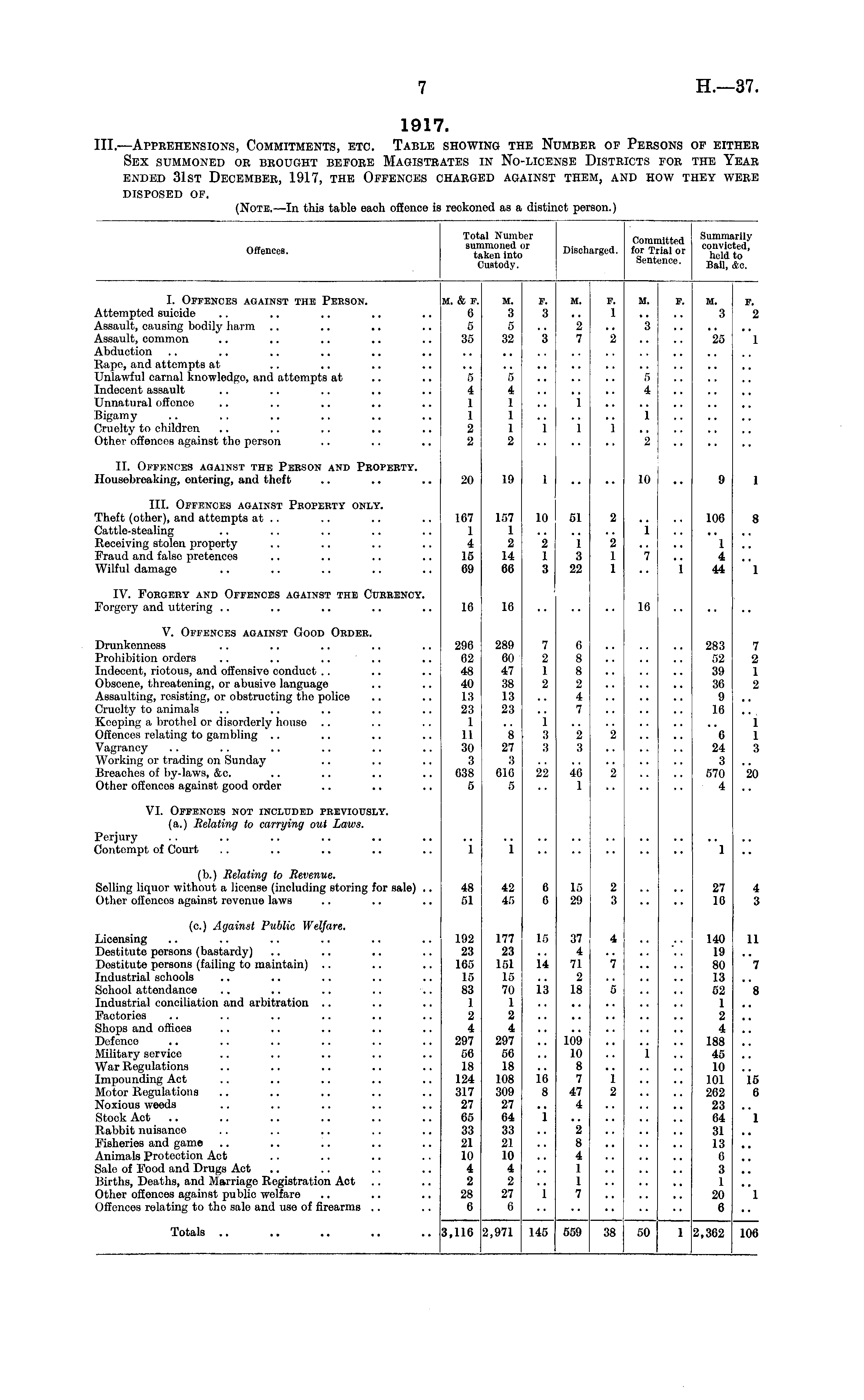 1917. III. —Apprehensions, Commitments, etc. Table showing the Number of Persons of either Sex summoned or brought before Magistrates in No-license Districts for the Year ended 31st December, 1917, the Offences charged against them, and how they were disposed of.