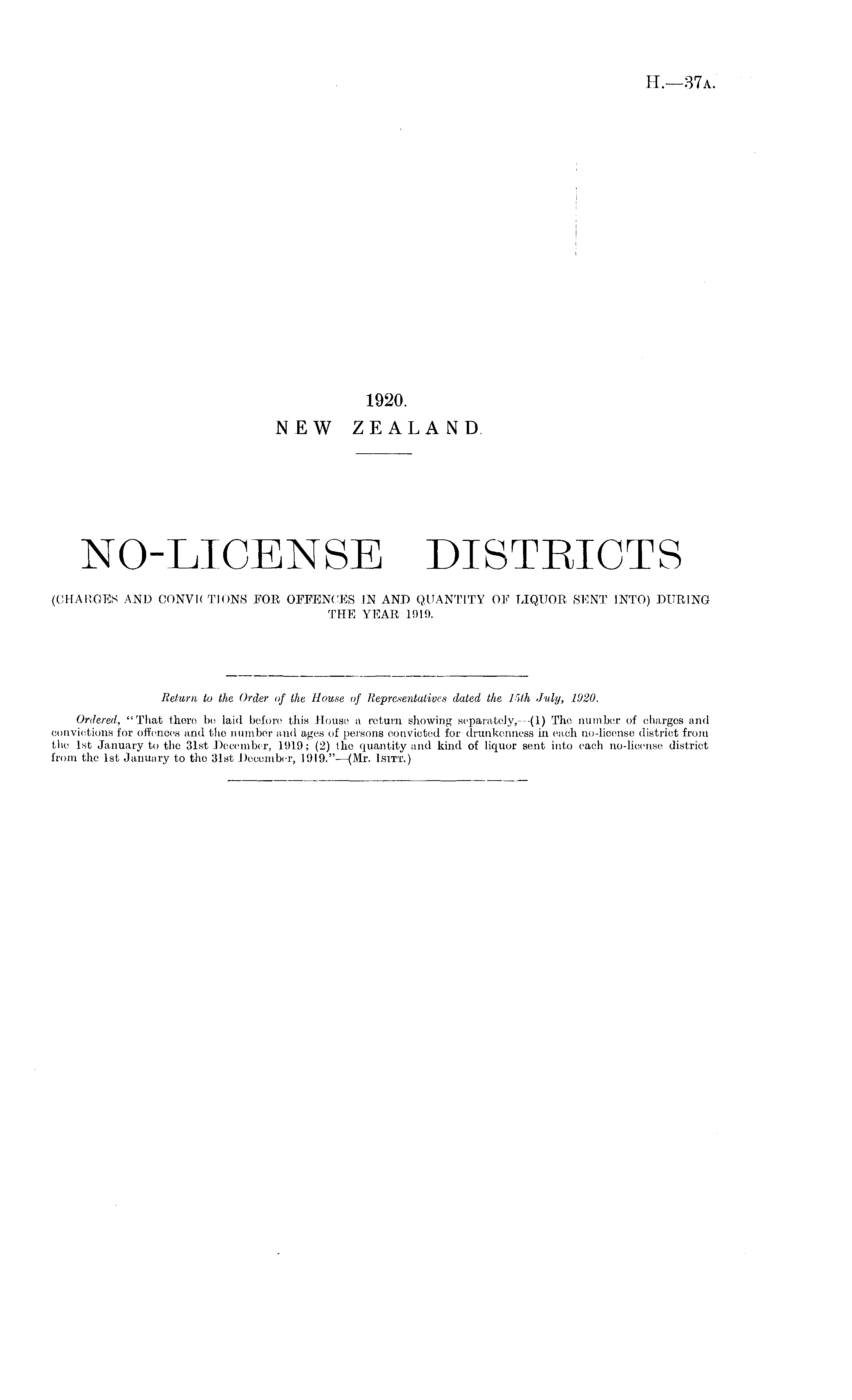 Return to the Order of ike House of Representatives dated the 15th July, 1920. Ordered, "That there be laid before this House a return showing separately,—(l) The number of charges and convictions for offences and the number and ages of persons convicted for drunkenness in each no-license district from the Ist January to the 31st December, 1919; (2) the quantity and kind of liquor sent into each no-license district from the Ist January to the 31st December, 1919."—(Mr. IsiTT.)