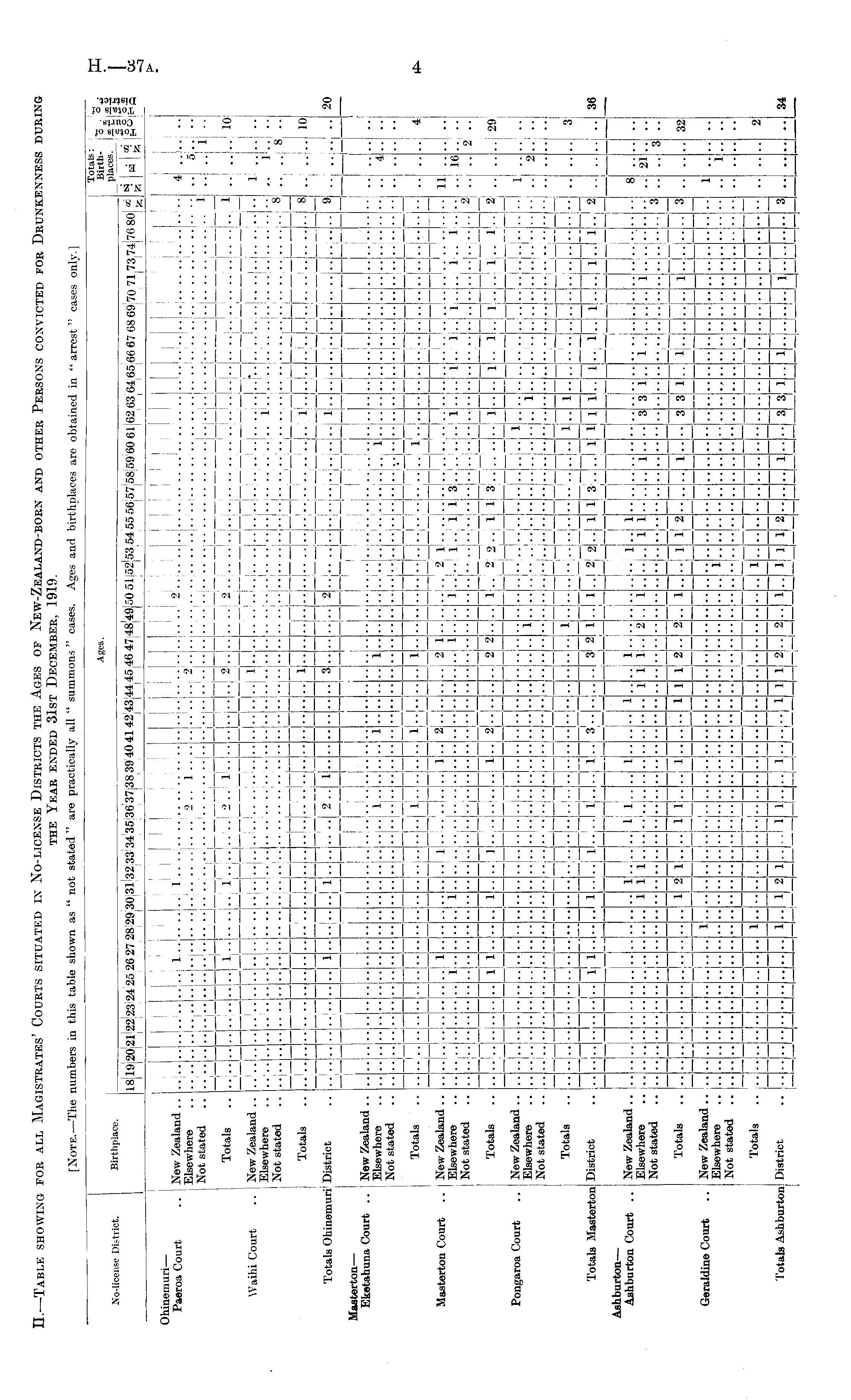 [Note. —The numbers in this table shown as " not stated " are practically all " summons " eases. Ages and birthplaces are obtained in "arrest" cases only.] No-license District. Totals: Ages. Birth- "S ■ °^ 2ll2223 24 25 26 27 28 29 30 31 32 33 34 35 36 37 38 39 40 4142 43 44 45 46 47 4849 50 51 io2J53 54 55 56 57 08 59 60 61 62 63 64 65 66 67 68 69 70 71 73 74j76 80 "- i N - s h";So Ages. IS 19 20 Ohinemuri —- Paeroa Court .. New Zealand .. Elsewhere Not stated Totals " 1 i ••- •• i. . : - 4 1 \\ I 5 i .. 2 i .... •■ • • .... 1 - ——.— i '.'. 2 • " I lj .. ., •• — •■ — I •• I.. - .. .. ■ti •■ — "i ■■ — * i •• —: — 7-T.T 1 .. j i 8 •• •• I .. io .. .. •s:: .. 10 ■■ •■ i .... i>.. •• ■■ 2 •• I 11 HHillH -.-: - I i_4 - H±b - — - -. 77 Waihi Court .. | New Zealand .. Elsewhere Not stated .... •■ •• •• 1 ... i 1 ■ 'i "' ..! ■• •■ ■• •• ■■ - — -H — __ — — — - - 7.7-7. --- Totals ■• ■• •• •• ■• ■■ ■• •• •■ ■■ Totals Ohinemuri District == - • : J. . - l 1 - — 3 — — — I I - t^ H 9| .. ■• ■■ ■■ ■• •■ •• ■• •• •• •■ ■• •• •• •■ •1 —— - - — —' ~ - — - - - _ - - _ : I - Maaterton — Eketahuna Court .. New Zealand .. Elsewhere Not stated •• kk .. i 1 i •■ .. •• 1 .. 1 1 3 1 .. . . i 2 .. 1 1 3 1 .. .. ■ 1 .. -' 2 .. 1 1 3.. .. 1 1 1 1 ■■ " '' i .. ii 2 i 4 •• •■ ■■ •• •■ •■ " ■• •1 •1 •• •• ■• •■ •• ■• ■■ •■ .... ■• •• ■■ ' " .. •■ •• ■■ Totals - - — — — — — - — — - — 1 I i ' — - - - - - - —' —' — I N .... 1.. 1 .. 4 •• •• ■• ■■ i" •• •• '' •I 'I ■■ - - ! H — i i i I — — - i - — - — Masterton Court .. New Zealand .. Elsewhere Not stated •• i 1 l 2 i 2 1 1 .... .. li .... i 'l i i.. io ± .. U .. •• 2 .. •• ■• ■• •• •• •• •■ •• ■• •■ ■• •■ ■• •• •■ •• .. - - — - - — - - - — 2 — - I 2 i fr - Totals i l ] 1 2 I i 1 j ' .. 29 •• •■ •• ■• •■ •■ ■• ■• •■ ■■ •■ •• ■■ - — — — — — — — - I — — _ _ " — - - - - - Pongaroa Court .. New Zealand .. Elsewhere Not stated ■■ .. .. .. .. .. 'i i - 1 ! 2 •• •■ •• ■• __ •• •■ — •• — •■ - ■• - ■■ - ■• - ■• — •• — •• - H- — ■■ - .. - - •• •■ -i •• 1 •■ •• - ■• •■ ■• - •■ - ■■ fr ■• ■■ - ■■ .. Totals _ _ - - — — i— !— I * 1 3 •• •■ •■ ■• •• •■ •• •■ •■ •■ •• •• ■• •■ •• ■• ■• ■■ ■• ■• ■■ ■■ •■ ■■ •■ •• •■ ■• •■ ■■ ■• ■• •■ ■• - - — - - - -- -- - - - - — _ - -; - - — — — H - i — - — .. 1 Totals llasterton District — - - _ - i * l , 3 3 2 i 1 1 1 1 1 i l 36 •• ■• ■• ■•: ■•• •■ . ■ •• •■ •• ■• ■• •• •• '•• •• — — — — - — - — - - - —! — - - — — — - - - — - - - - - i-4 - Ashburton — Ashburton Court .. New Zealand .. Elsewhere Not stated •• ■• 1 1 1 i.. 1 1 i i i i> i ....1.1.. i 1 1 •• 1 3 '3 i i '.'. "i S 21 •I 3 3 •• •• •■ •• •• •• ■■ •■ •■ •• •• •• ■• •■ ■• •• ■• ■■ ■■ ■■ ■■ .... ' " ■ ■ •■ •■ •■ ■■ - — l - i - - - - — — -' H 1 - 2 - — 7 -, - — - - - - - rr — - Totals H i i i 1 > i 2 1 3 i :!2 ■• ■■ ■■ •• ■■ •• ,•• •• •I ■• •■ ■■ Geraldine Court .. New Zealand .. Elsewhere Not stated .. — 1 — ! _ _ — " - H - - - :- - \~ - — — — - — - - ■ •' i ■ ■ .. i ■■ •■ 1 •• .. •• "I .. •■ ■• • • •• •■ •• •■ •■ •• •• •• "I ■• • • : !•• •■ •• .. •• '■ ■■ ■• " •■ •• •■ •■ ■• Totals — - — i - —. - - - — - — - — _ — " — — - — .. 1 .. " i 2 •■ •• •■ ■• •• •■ ■• •• •■ •• ■• •• •• • • •■ •• ■■ •■ ■• •■ •• •■ ■■ •■ •• ■• •• •■ •■ •■ •■ •■ •• - — - - - 1 - _ - i i — — — - 1 — - 7 - i -A — - - - 1 - -' — —. •• i - - — - Totals Ashburton District .. l 1 2 i 1 1 2 2 1 2 1 3 3 3 •• •• ■• •■ •• ■• •• ■■ ■• ■■ 3 •■ ■■ ■■ •■ •• - _ _ _ _ _ i_' I - _ i_ - - __ __ _ - _ -