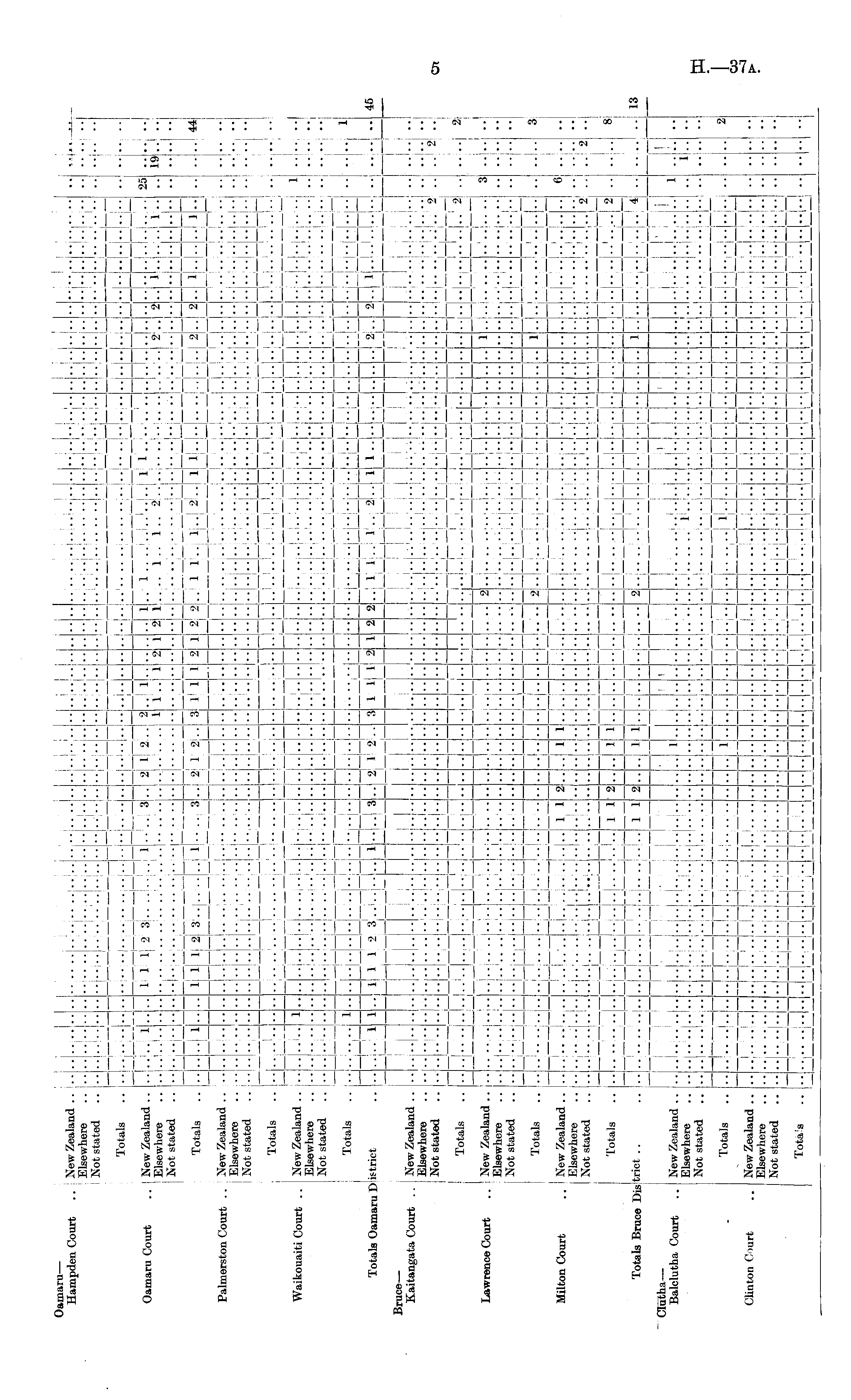 Oamaru — Hampden Court .. New Zealand .. Elsewhere .. Not stated .. !!!!!!!!!! i * * ! i ~" ■•I 111111111111111111 . .. 1 Plj .. .. 1.. 1 .. 2.. .. lli:ili:illlllllll. .. 1 1 .. 1 .. 2 .. 1 1111111111111:1111 1........ • • • 1 2.. . 1 1 . . i 1 1 I I I- I I , ................. , a IT 25 2.. 1 1.. .. 2.. 1 1 .. .. H rii!! !. .. .. 44 •• H4 !•• - •■ - ~ Totals .. ..] ±L±d 1 lj X 2 3 1 •• .. 3 .......................... 1 1 1 2 3 L 1 •• .. 3 4:i:i:3T:-iii:ii|iilii 1112 3 1 1 3 — iiiH:! 7777771777777 ..7.7.7.....:: 11 i 2 12.. 11.. 12 •• •• •• Oamaru Court .. New Zealand .. Elsewhere .. Not stated .. - — .... iL.. h — — 2.3 1 i 'J ]_l ■i 1 ii, •■ ■• — •• — .... iL... ■■ i i — ■■ — — i— — ;— :H ■• i ■■ - ■1 ■■ - •• - .. .. Totals .. .. 2 12.. » 3 lj 1 1 2 i ■2 j 2 2 ■■ ■• •• H — - - H—- — — u _ Palmerston Court .. New Zealand .... Elsewhere .. Not stated .. .. • - ■• .. I" "1* "I" * * * 2 ■■ 1111 i ' i.. : 2 .. ■■ •• L.|........ ■■ •• •• •• - ■ Hi - H - _ - - — Totals .. .. i.. •• ■■ ■• •• •■ ■■ •■ •■ _ — — i - - - _ Waikouaiti Court .. New Zealand .. Elsewhere .. Not stated .. .. ■■ ...... Totals •■ - ■• -' •• - ••I •• - —— H •• — _ u •■ - •• — ■■ - m ■■ — • •• — mm ' ■■ — T ■■ - 2 12.. •• - 3J 1 1 1 2 7 •■ -• •■ .. 1 1 .. 1 .. 2J.. 1 I G....I..|TT7 ■■ μ-k—— •• - ■■ Totals Oamaru D iftrict * * "" .... 11.., I 3 2 2 ■ ■• •■ - - - - — ; - I — — -. - - - Bruce — Kaitangata Court . . New Zealand .. Elsewhere .. Not stated .. Totals .. Lawrence Court .. New Zealand .. Elsewhere .. Not stated .. •• - "• _ _ ■■ ■• _ .... ■■ - ■■ •• — •• - —, •• - •■ - ■• — ...... •■ — 1 '.'. 2 .. - ..'., •• •■ •• •1 ••i - - - - ! - — ~ IS ••••■" " H .... ■2 ■■I 1 .... .. • • .... .. .... ::::::::::::::;:::: 6 ::: ::;::b::::;i:: •• •• •1 ■" ■• •• ■■ - _ — — i I - Totals .......... 11 .. i 1 3 •• ■■ •• .... •■ •■ ■• ■• •• •• I— — — — — - I - - Milton Court .. New Zealand .. Elsewhere .. Not stated .. i i .... 2 . . 1 .. 1 i .J i 6 vh 2 .. •■ ■• ■■ ■• •• ■■ ■■ •■ ■• - ~" i — — _ -r — 11111111111:111111. - — - - 2.. •••••■ ■" Totals .. .J 2 8 2 •• m ■■ •• •• •• ■■ - 1 11 2 H — — _ — H - Totals Bruce Dis trict .. .... _ .. i! i ■2 4 " " •• ■• ■■ •■ — — —— i — —- - _ — Clutha— Balclutha Court .. New Zealand .. Elsewhere .. Not stated .. ■■ .... .... i •••• .......... i...... iiiiiiiiiiiiiiiiii. ■• 1 i ■■ ■• •■ •• ■• •■ ■• •■ - I — ~ 1 — - .... - - — — —. - — Totals .. .. .... — ■• ■■ 'I ■■ •■ •• Clinton C >urt .. New Zealand.. .. Elsewhere .. Not stated .. .. - — — — — - •• .... •• ■• ■• ■■ " — — — r n - Totals .. .. I •■ !•• •1 > I ! I L_|_ L_ I 1 1 1 i_l