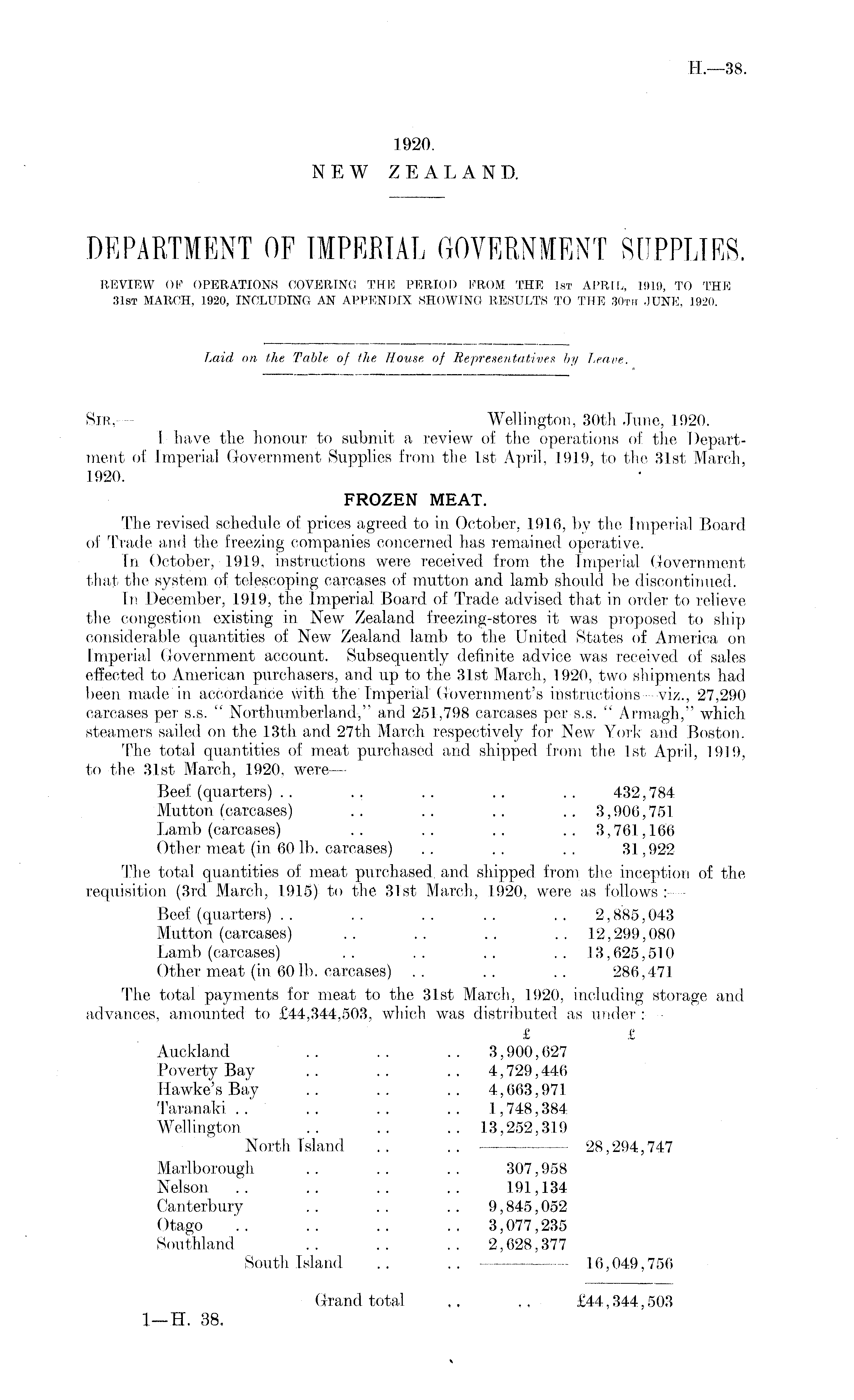 Sir,— Wellington, 30th June, 1020. I have the honour to submit a review of the operations of the Department of Imperial Government Supplies from the Ist April, .1919, to the 31st March, 1920. FROZEN MEAT. The revised schedule of prices agreed to in October, 1916, by the Imperial Board of Trade and the freezing companies concerned has remained operative. fit October, 1919, instructions were received from the Imperial Government that the system of telescoping carcases of mutton and lamb should be discontinued. In December, 1919, the Imperial Board of Trade advised that in order to relieve the congestion, existing in New Zealand freezing-stores it was proposed to ship considerable quantities of New Zealand lamb to the United States of America on Imperial Government account. Subsequently definite advice was received of sales effected to American purchasers, and up to the 31st March, 1920, two shipments had been made in accordance with the Imperial Govern men t's instructions viz., 27,290 carcases per s.s. " Northumberland," and 251,798 carcases per s.s. " Armagh," which, steamers sailed on the 13th and 27th March respectively for New York and Boston. The total quantities of meat purchased and shipped from the Ist April, 1919, to the 31st March, 1920, were— Beef (quarters) . . . . . . . . . . 432,784 Mutton (carcases) .. .. .. ..3,906,751 Lamb (carcases) .. .. .. .. 3,761,166 Other meat (in 60 lb. carcases) . . . . . . 31,922 The total quantities of meat purchased, and shipped from the inception of the requisition (3rd March, 1915) to the 31st March, 1920, were its follows: Beef (quarters) . . . . . . . . 2,885,043 Mutton (carcases) .. .. .. .. 12,299,080 Lamb (carcases) .. .. .. .. .13,625,510 Other meat (in 6011). carcases) .. .. .. 286,471 The total payments for meat to the 31st March, 1920, including storage and advances, amounted to £44,344,503, which was distributed as under : £ .£ Auckland .. .. .. 3,900,627 Poverty Bay .. .. .. 4,729,446 Hawke's Bay .. .. .. 4,663,971 Taranaki ..' . . . . . . 1 ,748,384 Wellington .. .. .. 13,252,319 North Island .. .. 28,294,747 Marlborough .. .. .. 307,958 Nelson .. .. .. .. 191,134 Canterbury .. . . . . 9,845,052 Otago .. .. .. .. 3,077,235 Southland .. .. .. 2,628,377 South Island .. .. 16,049,750 Grand total ~ , , £44,344,503