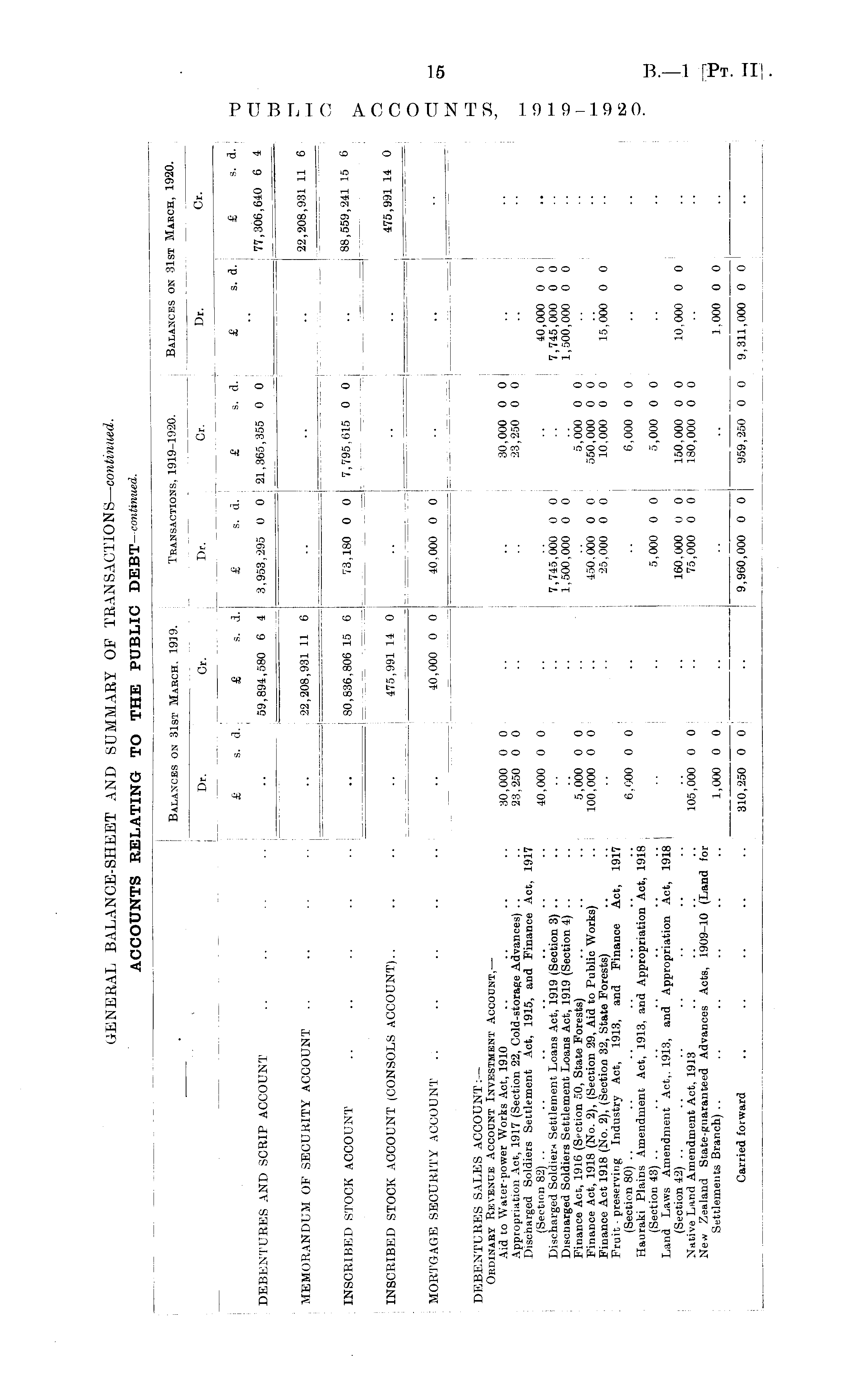 Balances on 31st March, 1919. Transactions, 1919-1920. Balances on 31st March, 1920. | .... Dr. Cr. : Dr. Cr. Dr. Cr. Dr. Cr. Dr. Cr. Dr. Cr. i i I i i r - DEBENTURES AND SCRIP ACCOUNT £ s. d. £ s. d. £ s. d. £ s. d. 59,894,580 6 4 3,953,295 0 0 21,365,355 0 0 £ s. d. £ s. d. 77,306,640 6 4 U= ■■= = ======= | 122,208,931 11 6 MEMORANDUM OF SECURITY ACCOUNT .. .. ..j 22,208,931 11 6 L 22,208,931 11 6 22,208,931 11 6 -= = — INSCRIBED STOCK ACCOUNT 80,836,806 15 6 73,180 0 0 7,795,615 0 0 80,636,806 15 6 73,180 0 0 7,795,615 0 0 88,559,241 15 6 88,559,241 15 6 I INSCRIBED STOCK ACCOUNT (CONSOLS ACCOUNT).. 475,991 14 0 475,991 14 0 475,991 14 0 475,991 14 0 475,991 14 0 — U == MORTGAGE SECURITY ACCOUNT .. 40,000 0 0 40,000 0 0 40,000 0 0 40,000 0 0 . I I DEBENTURES S.ALES ACCOUNT:— Ordinary Revenue .Account Investment Account, — Aid to Water-power Works Act, 1910 Appropriation Act, 1917 (Section 22, Cold-storage Advances) .. .. I Discharged Soldiers Settlement Act, 1915, and Finance Act, 1917 (Section 82) .. Discharged Soldiers Settlement Loans Act, 1919 (Section 3) .. .. Discnarged Soldiers Settlement Loans Act, 1919 (Section 4) .. Finance Act, 1916 (Section 50, State Forests) .. .. Finance Act, 1918 (No. 2), (Section 29, Aid to Public Works) Finance Act 1918 (No. 2), (Section 32, State Forests) .. .. Fruit - preserving Industry Act, 1913, and Finance Act, 1917 (Section 80) .. Hauraki Plains Amendment Act, 1913, and Appropriation Act, 1918 (Section 43) .. .. .. .. .. .. .. j Land Laws Amendment Act,. 1913, and Appropriation Act, 1918 (Section 42) .. Native Land Amendment Act, 1913 New Zealand State-guaranteed Advances Acts, 1909-10 (Land for Settlements Branch) 30,000 0 0 .. .. 30,000 0 0 23,250 0 0 .. .. 23,250 0 0 40,000 0 0 7,745,000 0 0 1,500,000 0 0 5,000 0 0 .. .. 5,000 0 0 100,000 0 0 .. 450,000 0 0 550,000 0 0 25,000 0 0 10,000 0 0 6,000 0 0 .. .. 6,000 0 0 5,000 0 0 5,000 0 0 160,000 0 0 150,000 0 0 105,000 0 0 .. 75,000 0 0 180,000 0 0 1,000 0 0. 40,000 0 0 7,745,000 0 0 1,500,000 0 0 15,000 0 0 10,000 0 0 1.000 0 0 Carried forward 310,250 0 0 j .. : 9,960,000 0 0 959,250 0 0 310,250 0 0 [ 9,960,000 0 0 959,250 0 0 9,311,000 0 0 9,311,000 0 0 I