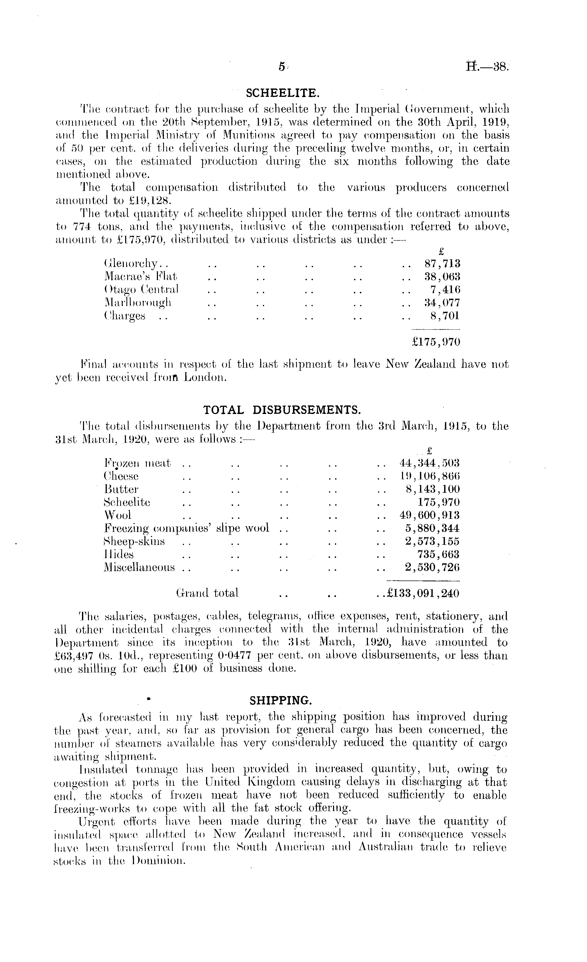 SCHEELITE. The contract for the purchase of scheelite by the Imperial Government, which commenced on the 20th September, 1.9.15, was determined on. the 30th April, 1919, and the Imperial Ministry of Munitions agreed to pay compensation on the basis of 50 per cent, of the deliveries during the preceding twelve months, or, in. certain cases, on the estimated production during the six months following the date mentioned above. The total compensation distributed to the various producers concerned amounted to £19,128. The total quantity of scheelite shipped, under the terms of the contract amounts to 774 tons, and the payments, inclusive of the compensation referred to above, amount to £175,970, distributed to various-districts as under:— £ Olenorchy.. .. .. .. .. ..87,713 Macrae's Flat .. .. .. .. .. 38,063 Otago Centra,l .. .. .. .. .. 7,416 Marlborough .. .. .. .. .. 34,077 Charges .. .. .. .. .. .. 8,701 £175,970 Final accounts in respect of the last shipment to leave New Zealand have not yet been received from London. TOTAL DISBURSEMENTS. The total disbursements by the Department from the 3rd March, 1915, to the 31st March, 1.920, were as follows : — . £ Frozen meat .. .. .. .. .. 44,344,,503 Cheese .. .. .. .. .. 19,106,866 Butter .. .. .. .. .. 8,143,100 Scheelite .. .. .. .. .. 175,970 Wool .. .. .. .. .. 49,600,913 Freezing companies' slipe wool . . . . . . 5,880,344 Sheep-skins .. .. .. .. .. 2,573,155 Hides .. .. .. .. .. 735,663 Miscellaneous.. .. .. .. .. 2,530,726 Grand total .. .. ..£133,091,240 The salaries, postages, cables, telegrams, office expenses, rent, stationery, and all other incidental charges connected with the internal administration of the Department since its inception to the 31st March, 1920, have amounted to £63,497 os. 10d., representing 0-0477 per cent, on above disbursements, or less than one shilling for each £100 of business done. SHIPPING. As forecasted in my last report, tfie shipping position has improved during the past year, and, so far as provision for general cargo has been concerned, the number of steamers available has very considerably reduced the quantity of cargo a,waiting shipment. Insulated tonnage has been provided in increased quantity, but, owing to congestion at ports in the United Kingdom causing delays in discharging at that end, the stocks of frozen meat have not been reduced, sufficiently to enable freezing-works to cope with all the fat stock offering. Urgent efforts have been made during the year to have the quantity of insulated space allotted to New Zealand increased, and in consequence vessels have been transferred from the South American and Australian trade to relieve stocks in the Dominion*