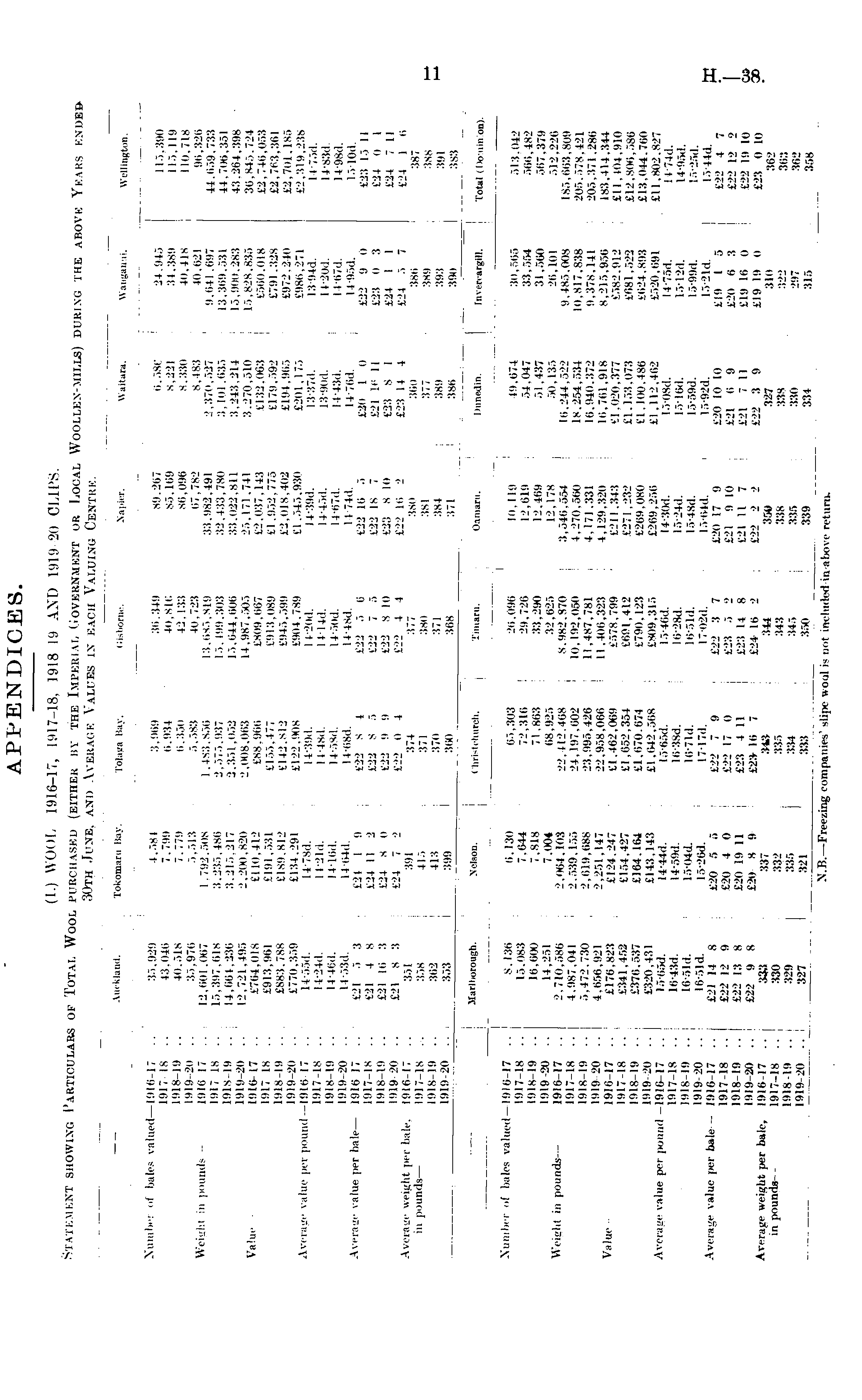 Auckland. Tokomaru Bay. Tolaga Bas\ Gisborne. Napier. Waitara. Wanganui. Wellington. I Number of bales valued —1916-17 1917-18 1918-19 1919-20 Weight in pounds — 1916-17 1917-18 1918-19 1919-20 Value— 1916-17 1917-18 1918-19 1919-20 Average value per pound —1916-17 1917-18 1918-19 1919-20 Average value per bale — 1916-17 1917-18 1918-19 1919-20 Average weight per bale, 1916-17 in pounds — 1917-18 1918-19 1919-20 35,929 43,046 40,518 35,976 12,601,067 15,397,618 14,664,236 12,721,495 £764,018 £913,961 £883,788 £770,359 14-55d. 1424d. 14-46d. 14-53d. £21 5 3 £21 4 8 £21 16 3 £21 8 3 351 3.58 362 353 4,584 7,799 7,779 5,513 1,792,508 3,235,486 3,215,217 2,200,820 £110,412 £191,531 £189.812 £134,291 14-78d. 14-21d. 14-16d. 14-64d. £24 1 9 £24 11 2 £24 8 0 £24 7 2 391 415 413 399 3,969 6,934 6.350 5,583 1,483,856 2,575,937 2,351,052 2,008,063 £88,966 , £155,477 £142.812 £122,908 1439d. 14-48d. 14-58d. 14-68d. £22 8 4 £22 8 5 £22 9 9 £22 0 4 374 371 370 360 I 36.349 40,816 42.133 40,723 13,685,819 15.499,303 15,044,606 14.987,505 £809,667 £913,089 £945,599 £904,789 1420d. 1414d. 14-48d. £22 5 6 £22 7 5 £22 8 10 £22 4 4 377 380 371 368 89.267 85,169 86,096 67,782 33,982,491 32,433,780 33,022,811 25,171,741 £2,037,143 £1,952,775 £2,018,402 £1,545,930 14-39d. 14-45d. 14-67d. 14-74d. £22 16 5 £22 18 7 £23 8 10 £22 16 2 380 381 384 371 6.586 8,221 8.330 8,483 2,370,527 3,101,635 3,243,214 3,270,510 £132.063 £179,592 £194,965 £201, 175 1337d. 13-90d. 1443d. 1476d. £20 1 0 £21 16 11 £23 8 1 £23 14 4 360 377 389 386 24,945 34,389 40,418 40,621 9,641,697 13,369,531 15,900,283 15,828,835 £560.018 £791.328 £972.240 £986,271 1394d. 14-20d. 14-67d. 14-95d. £22 9 0 £23 0 3 £24 1 1 £24 5 7 386 389 393 390 115,390 115,119 110,718 96,326 44.659,733 44,706,351 43.264,398 36,845,724 £2,746,053 £2,763,361 £2,701,185 £2,319,238 14-75d. 14-83d. 14-98d. 1510d. £23 15 11 £24 0 1 £24 7 11 £24 1 0 387 388 391 383 Marlborough. Nelson. Christchurch. I Timaru. Oamaru. : Ifunedin. Invercargill. Total (Dominion). Number of bales valued —1916-17 1917-18 1918-19 1919-20 Weight in pounds — 1916-17 1917-18 1918-19 1919-20 Value— 1916-17 1917-18 1918-19 1919-20 Average value per pound —1916-17 1917-18 1918-19 1919-20 Average value per bale — 1916-17 1917-18 1918-19 1919-20 Average weight per bale, 1916-17 in pounds — 1917-18 1918-19 1919-20 8,136 15.083 16,600 14,251 2,710,586 4,987,041 5,472.730 4,656,921 £176,823 £341,452 £376,537 £320,431 15-65d. 1643d. 16-51d. 16-51d. £21 14 8 £22 12 9 £22 13 8 £22 9 8 333 330 329 327 6,130 7.644 7,818 7,004 2,064.103 2.539,155 2,619,688 2,251,147 £124,247 £154,427 £164,164 £143,143 14-44d. 14-59d. 15-04d. 15-26d. £20 5 5 £20 4 0 £20 19 11 £20 8 9 337 332 335 321 65,303 72,316 71,863 68,925 22.412.468 24,197,602 23.995,426 22,958,066 £1,462,069 £1,652,354 £1,670.674 £1,642,568 15-65d. 16-38d. 16-7U1. 17-17d. £22 7 9 £22 17 0 £23 4 11 £23 16 7 343 335 334 333 26.096 29,726 33,290 32,625 8.982,870 10,192,050 11,487,781 11,406,323 £578,799 £691.412 £790.123 £809,315 l.V46d. 16-28d. 1651d. 17-02d. £22 3 7 £23 5 2 £23 14 8 £24 16 2 344 343 345 350 10,119 12,619 12.469 12,178 3,546,554 4,270,560 4,171,331 4,129,320 £211,343 £271,232 £269,080 £269,256 14-30d. 15-24d. 1548d. 15-644. £20 17 9 £21 9 10 £21 11 7 £22 2 2 350 338 335 339 I 49,674 54,047 51,437 50,135 16,244,522 18,254,534 16.940.372 16,761,918 £1.020,377 £1.153,073 £1,100,486 £1,112,462 15-08d. 15-16d. 15-59d. 15-92d. £20 10 10 £21 6 9 £21 7 11 £22 3 9 327 338 330 334 30,565 33,554 31,560 26,101 9,485,008 10,817,838 9,378,141 8,215.956 £582.912 £681,522 £624,893 £520,691 14-75d. l.V12d. 1599d. 1521d. £19 1 5 £20 6 3 £19 16 0 £19 19 0 310 322 297 315 513.042 566,482 567,379 512,226 185,663,809 205.578,421 205,371.286 183,414,344 £11,404,910 £12.806,586 £13,044.760 £11,802,827 14-74d. I495d. 1525d. l.V44d. £22 4 7 £22 12 2 £22 19 10 £23 0 10 362 363 362 358 N.B. —-Freezing companies' stipe wool is not included in above return.