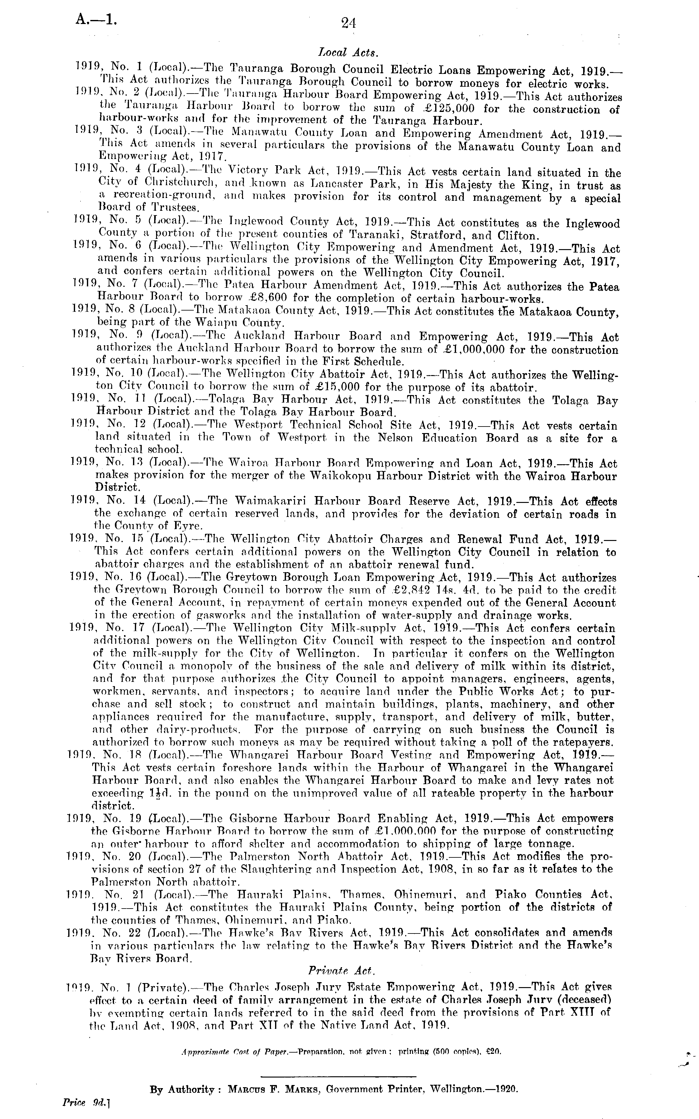 Local Acts. 1919 No. 1 (Local).—The Tauranga Borough Council Electric Loans Empowering Act, 1919.— I his Act authorizes the Tauranga Borough Council to borrow moneys for electric works. 1919, No. 2 (Local).—The Tauranga Harbour Board Empowering Act, 1919.—This Act authorizes the Tauranga Harbour Board to borrow the sum of £125,000 for the construction of harbour-works and for the improvement of the Tauranga Harbour. 1919, No. 3 (Local). —The Manawatu County Loan and Empowering Amendment Act, 1919. This Act amends in several particulars the provisions of the Manawatu County Loan and Empowering Act, 1917. 1919, No. 4 (Local).—The Victory Park Act, 1919.—This Act vests certain land situated in the City of Christchurch, and known as Lancaster Park, in His Majesty the King, in trust as a recreation-ground, and makes provision for its control and'management by a special Board of Trustees. 1919, No. 5 (Local).—The Tnglewood County Act, 1919.—This Act constitutes as the Inglewood County a portion of the present counties of Taranaki, Stratford, and Clifton. 1919, No. 6 (Local).—The Wellington City Empowering and Amendment Act, 1919.—This Act amends in various particulars the provisions of the Wellington City Empowering Act, 1917, and confers certain additional powers on the Wellington City Council. 1919, No. 7 (Local).—The Patea Harbour Amendment Act, 1919.—This Act authorizes the Patea Harbour Board to borrow £8,600 for the completion of certain harbour-works. 1919, No. 8 (Local).—The Matakaoa County Act, 1919.—This Act constitutes the Matakaoa County, being part of the Waiapu County. 1919, No. 9 (Local).—The Auckland Harbour Board and Empowering Act, 1919.—This Act authorizes the Auckland Harbour Board to borrow the sum of £1.000.000 for the construction of certain harbour-works specified in the First Schedule. 1919, No. 10 (Local).—The Wellington City Abattoir Act, 1919.—This Act authorizes the Wellington City Council to borrow the sum of £15,000 for the purpose of its abattoir. 1919. No. 11 (Local).— Tolaga Bay Harbour Act, 1919.— This Act constitutes the Tolaga Bay Harbour District and the Tolaga Bay Harbour Board. 1919, No. 12 (Local).—The Westport Technical School Site Act, 1919.—This Act vests certain land situated in the Town of Westport in the Nelson Education Board as a site for a technical school. 1919, No. 13 (Local). —The Wairoa Harbour Board Empowering and Loan Act, 1919.—This Act makes provision for the merger of the Waikokopu Harbour District with the Wairoa Harbour District. 1919, No. 14 (Local). —The Waimakariri Harbour Board Reserve Act, 1919.—This Act effects the exchange of certain reserved lands, and provides for the deviation of certain roads in the County of Eyre. 1919, No. 15 (Local). —The Wellington City Abattoir Charges and Renewal Fund Act, 1919. — This Act confers certain additional powers on the Wellington City Council in relation to abattoir charges and the establishment of an abattoir renewal fund. 1919, No. 16 (Local). —The Greytown Borough Loan Empowering Act, 1919. —This Act authorizes the Greytown Borough Council to borrow the sum of £2,842 14s. 4d. to be paid to the credit of the General Account, in repayment of certain moneys expended out of the General Account in the erection of gasworks and the installation of water-supply and drainage works. 1919, No. 17 (Local).—The Wellington City Milk-supply Act," 1919.— This Act confers certain additional powers on the Wellington City Council with respect to the inspection and control of the milk-supply for the City of Wellington. In particular it confers on the Wellington City Council a monopoly of the business of the sale and delivery of milk within its district, and for that purpose authorizes .the City Council to appoint managers, engineers, agents, workmen, servants, and inspectors; to acquire land under the Public Works Act; to purchase and sell stock ; to construct and maintain buildings, plants, machinery, and other appliances required for the manufacture, supply, transport, and delivery of milk, butter, and other dairy-products. For the purpose of carrying on such business the Council is authorized to borrow such moneys as may be required without taking a poll of the ratepayers. 1919. No. 18 (Local). —The Whangarei Harbour Board Vestimr and Empowering Act, 1919.— This Act vests certain foreshore lands within the Harbour of Whangarei in the Whangarei Harbour Board, and also enables the Whangarei Harbour Board to make and levy rates not exceeding lid. in the pound on the unimproved value of all rateable property in the harbour district. 1919, No. 19 (Local). —The Gisborne Harbour Board Enabling Act, 1919. —This Act empowers the Gisborne Harbour Board to borrow the sum of £1.000.000 for the purpose of constructing an outer" harbour to afford shelter and accommodation to shipping of large tonnage. 1919, No. 20 (Local).—The Palmerston North Abattoir Act, 1919.—This Act modifies the provisions of section 27 of the Slaughtering and Inspection Act, 1908, in so far as it relates to the Palmerston North abattoir. 1919. No. 21 (Local). —The Hauraki Plains. Thames, Ohinemuri, and Piako Counties Act, 1919. —This Act constitutes the Hauraki Plains County, being portion of the districts of the counties of Thames. Ohinemuri, and Piako. 1919. No. 22 (Local). —The Hawke's Bay Rivers Act, 1919. —This Act consolidates and amends in various particulars the law relating to the Hawke's Bay Rivers District and the Hawke's Bay Rivers Board. Private Act. I°l9. No. 1 (Private). —The Charles Joseph Jury Estate Empowering Act, 1919. —This Act gives effect to a certain deed of family arrangement in the estate of Charles Joseph Jury (deceased) by exempting certain lands referred to in the said deed from the provisions of Part XTTT of the Land Act, 1908, and Part XTT of the Native Land Act. 1919.