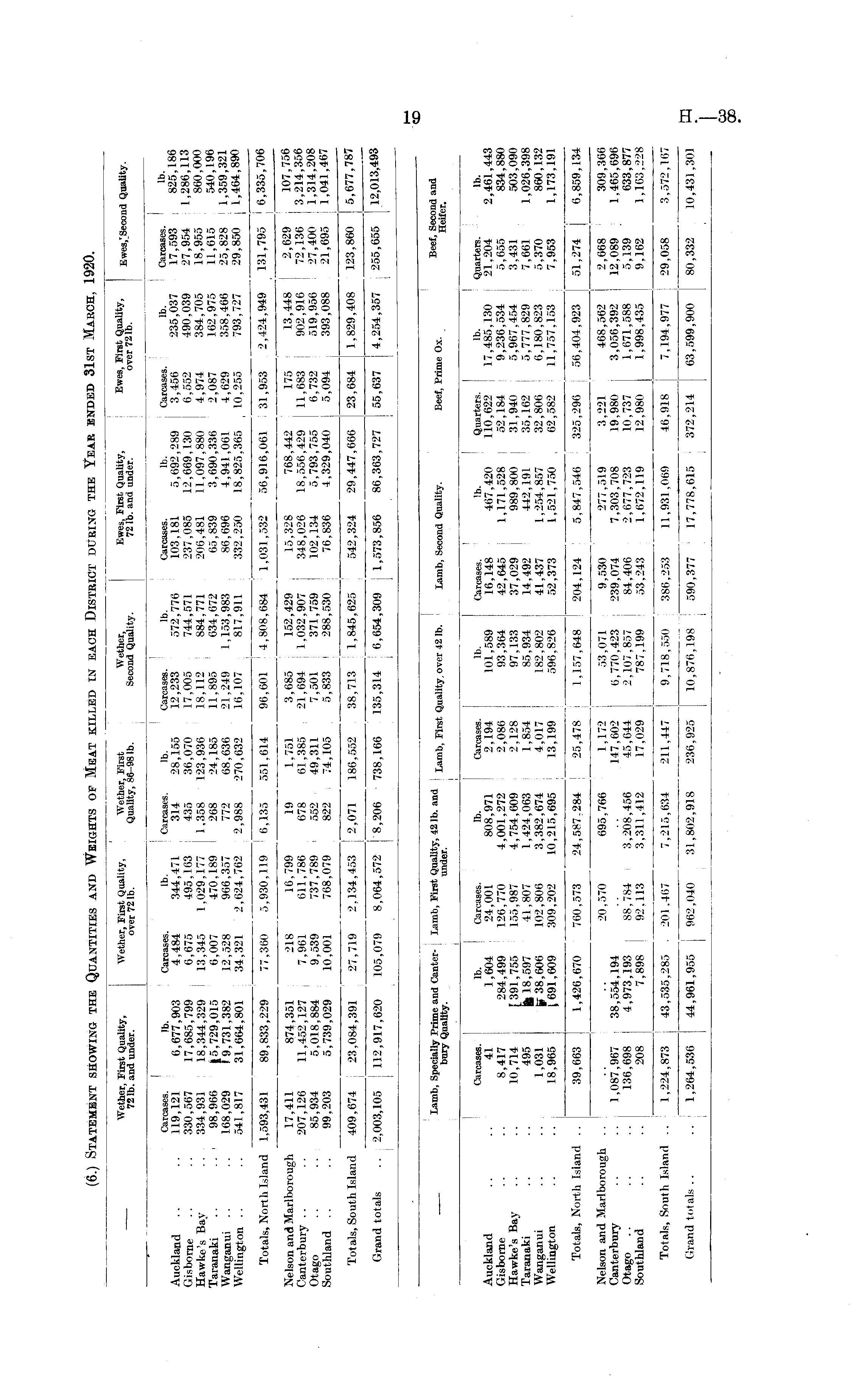 (6.) Statement showing the Quantities and Weights of Meat killed in each District during the Year ended 31st March, 1920.