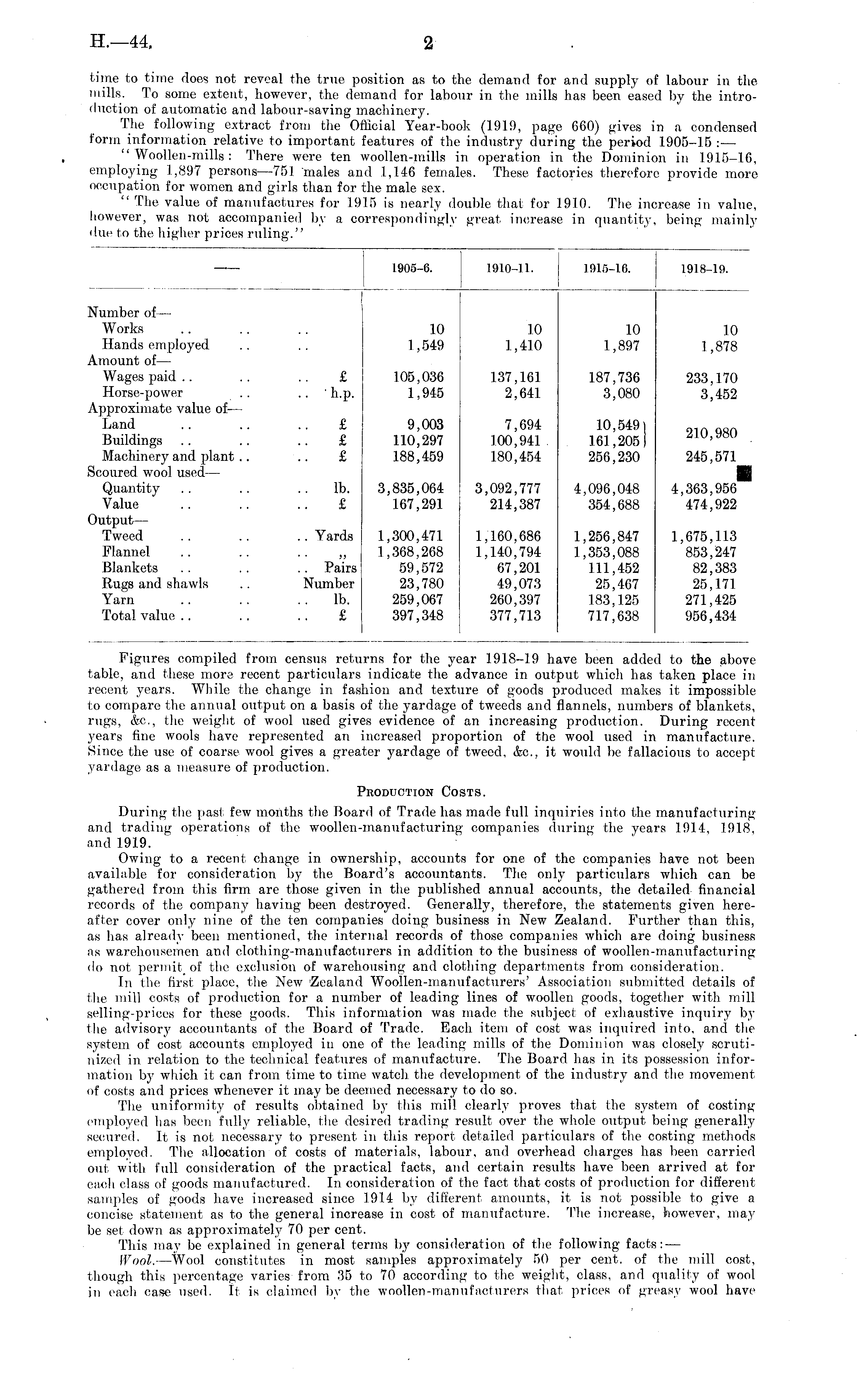 Figures compiled from census returns for the year 1918-19 have been added to the a'>ove table, and these more recent particulars indicate the advance in output which has taken place in recent years. While the change in fashion and texture of goods produced makes it impossible to compare the annual output on a basis of the yardage of tweeds and flannels, numbers of blankets, rugs, &c, the weight of wool used gives evidence of an increasing production. During recent years fine wools have represented an increased proportion of the wool used in manufacture. Since the use of coarse wool gives a greater yardage of tweed, &c, it would be fallacious to accept yardage as a measure of production. Production Costs. During the past, few months the Board of Trade has made full inquiries into the manufacturing and trading operations of the woollen-manufacturing companies during the years 1914, 1918, and 1919. Owing to a recent, change in ownership, accounts for one of the companies have not been available for consideration by the Board's accountants. The only particulars which can be gathered from this firm are those given in the published annual accounts, the detailed financial records of the company having been destroyed. Generally, therefore, the statements given hereafter cover only nine of the ten companies doing business in New Zealand. Further than this, as has already been mentioned, the internal records of those companies which are doing business as warehousemen and clothing-manufacturers in addition to the business of woollen-manufacturing do not permit of the exclusion of warehousing and clothing departments from consideration. In the first place, the New Zealand Woollen-manufacturers' Association submitted details of the mill costs of production for a number of leading lines of woollen goods, together with mill selling-prices for these goods. This information was made the subject of exhaustive inquiry by the advisory accountants of the Board of Trade. Each item of cost was inquired into, and the system of cost accounts employed in one of the leading mills of the Dominion was closely scrutinized in relation to the technical features of manufacture. The Board has in its possession information by which it can from time to time watch the development of the industry and the movement, of costs and prices whenever it may be deemed necessary to do so. The uniformity of results obtained by this mill clearly proves that the system of costingemployed has been fully reliable, the desired trading result over the whole output being generally secured. It is not necessary to present, in this report detailed particulars of the costing methods employed. The allocation of costs of materials, labour, and overhead charges has been carried out with full consideration of the practical facts, and certain results have been arrived at for each class of goods manufactured. In consideration of the fact that costs of production for different samples of goods have increased since 1914 by different amounts, it, is not possible to give a concise statement as to the general increase in cost of manufacture. The increase, however, may be set down as approximately 70 per cent. This may be explained in general terms by consideration of the following facts: — Wool. —Wool constitutes in most, samples approximately 50 per cent, of the mill cost, though this percentage varies from 35 to 70 according to the weight, class, and quality of wool in each case used. It is claimed by the woollen-manufacturers that, prices of greasy wool have