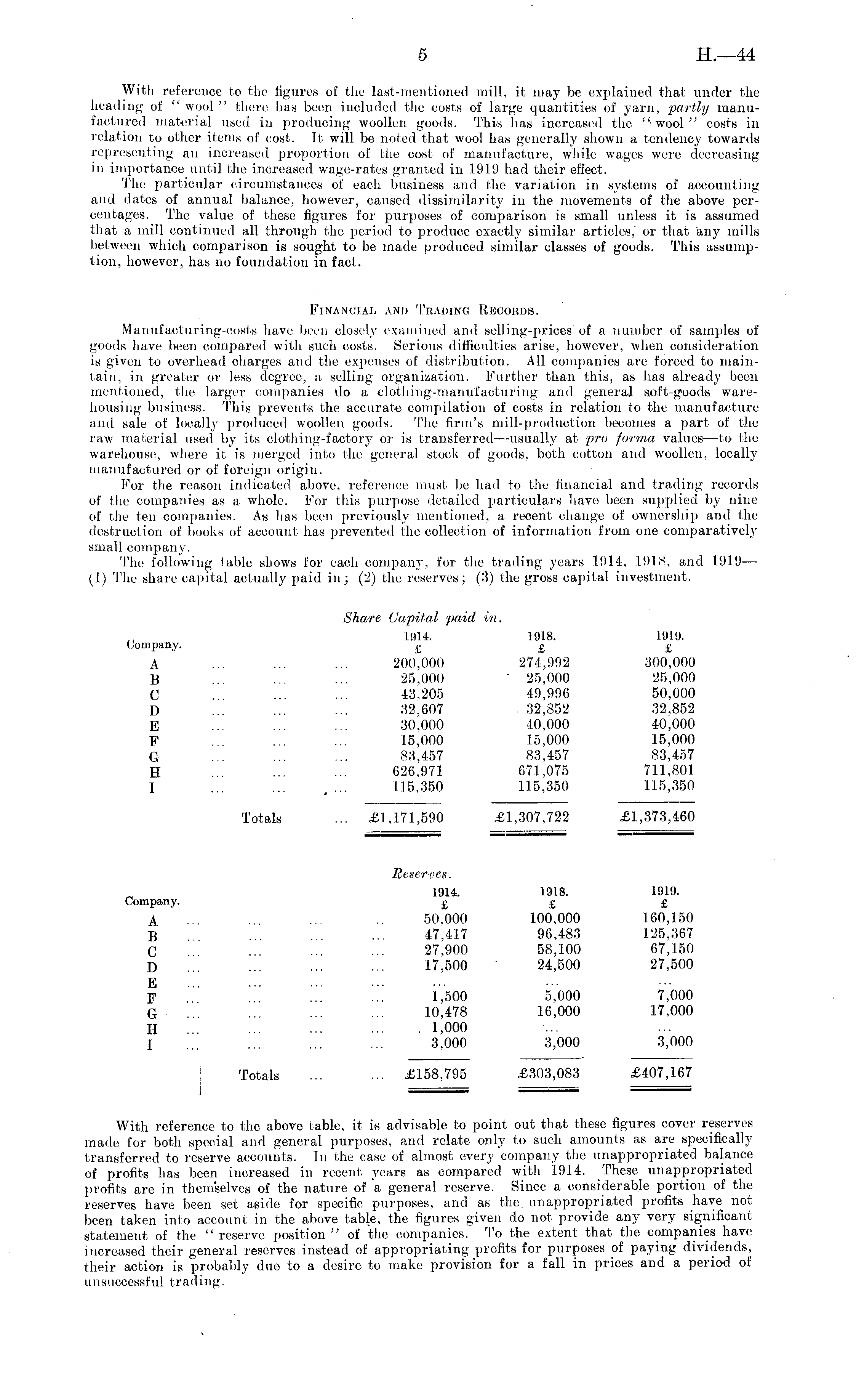 With reference to the figures of the last-mentioned mill, it may be explained that under the heading of " wool " there has been included the costs of large quantities of yarn, partly manufactured material used in producing woollen goods. This has increased the "wool" costs in relation to other items of cost. It will be noted that wool has generally shown a tendency towards representing an increased proportion of the cost of manufacture, while wages were decreasing in importance until the increased wage-rates granted in 1919 had their effect. The particular circumstances of each business and the variation in systems of accounting and dates of annual balance, however, caused dissimilarity in the movements of the above percentages. The value of these figures for purposes of comparison is small unless it is assumed that a mill continued all through the period to produce exactly similar articles, or that any mills between which comparison is sought to be made produced similar classes of goods. This assumption, however, has no foundation in fact. Financial and Trading Records. Manufacturing-costs have been closely examined and selling-prices of a number of samples of goods have been compared with such costs. Serious difficulties arise, however, when consideration is given to overhead charges and the expenses of distribution. All companies are forced to maintain, in greater or less degree, a selling organization. Further than this, as has already been mentioned, the larger companies do a clothing-manufacturing and general soft-goods warehousing business. This prevent* the accurate compilation of costs in relation to the manufacture and sale of locally produced woollen goods. The firm's mill-production becomes a part of the raw material used by its clothing-factory or is transferred—usually at pro forma values —to the warehouse, where it is merged into the general stock of goods, both cotton and woollen, locally manufactured or of foreign origin. For the reason indicated above, reference must be had to the financial and trading records of the companies as a whole. For this purpose detailed particulars have been supplied by nine of the ten companies. As has been previously mentioned, a recent change of ownership and the destruction of books of account has prevented the collection of information from one comparatively small company. The following table shows for each company, for the trading years 1914, 1918, and 1919 — (1) The share capital actually paid in; (2) the reserves; (3) the gross capital investment. Share Cwpital paid in. 1914. 1918. 1919. Company. £ £ £ A ... ... ... 200,000 274,992 300,000 B . ... ... 25,000 " 25,000 25,000 C ... ... 43,205 49,996 50,000 D ... ... 32,607 32,852 32,852 E ... ... ... 30,000 40,000 40,000 F .. ... 15,000 15,000 15,000 G ... ... ' 83,457 83,457 83,457 H ... ... 626,971 671,075 711,801 I ... ... 115,350 115,350 115,350 Totals ... £1,171,590 .£1,307,722 £1,373,460 Reserves. 1914. 1918. 1919. Company. £ £ £ A . .. ... 50,000 100,000 160,150 B ... 47,417 96,483 125,367 C ... 27,900 58,100 67,150 D 17,500 • 24,500 27,500 F '" .'." ... 1,500 5,000 7,000 G ... ... 10,478 16,000 17,000 H ... ... ••• : 1,000 I ... ... ... ... 3,000 3,000 3,000 Totals ... ... £158,795 £303,083 £407,167 With reference to the above table, it is advisable to point out that these figures cover reserves made for both special and general purposes, and relate only to such amounts as are specifically transferred to reserve accounts. In the case of almost every company the unappropriated balance of profits has been increased in recent years as compared with 1914. These unappropriated profits are in themselves of the nature of a general reserve. Since a considerable portion of the reserves have been set aside for specific purposes, and as the. unappropriated profits have not been taken into account in the above table, the figures given do not provide any very significant statement of the "reserve position" of the companies. To the extent that the companies have increased their general reserves. instead of appropriating profits for purposes of paying dividends, their action is probably due to a desire to make provision for a fall in prices and a period of unsuccessful trading.