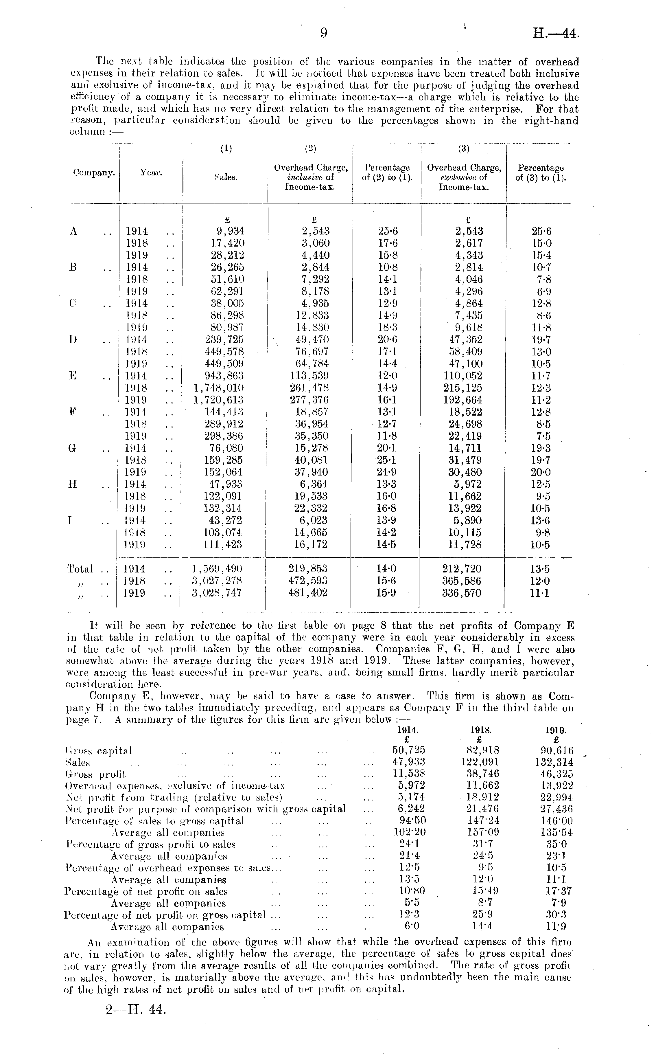 (I) (2) (3) Company. Year. 8 ales, Overhead Charge, inclusive of Income-tax. Percentage of (2) to(l). Overhead Charge, exclusive of Income-tax. Percentage of (3) to (1). A B C D E £ 1914 .. 9,934 1918 .. 17,420 1919 .. 28,212 1914 .. 26,265 1918 .. 51,610 1919 .. 02,291 1914 .. 38,005 1918 .. 86,298 1919 .. ; 80,987 1914 .. ! 239,725 1918 .. | 449,578 1919 .. ! 449,509 1914 .. I 943,863 1918 .. i 1,748,010 1919 .. ! 1,720,613 1914 .. ! 144,413 1918 .. J 289,912 1919 .. I 298,386 19.14 .. 76,080 1918 .. 159,285 1919 .. i 152,064 1914 .. i 47,933 1918 .. ' 122,091 1919 .. ' 132,314 1914 .. | 43,272 1918 .. ! 103,074 1919 .. 111,423 £ 2,543 3,060 4,440 2,844 7,292 8,178 4,935 1.2.833 14,830 49,470 76,697 64,784 113,539 261,478 277,376 18,857 36,954 35,350 15,278 40,081 37,940 6,364 19,533 22,332 6,023 14,665 16,172 25-6 17-6 15-8 10-8 14-1 13-1 12-9 14-9 18-3 20-6 17-1 14-4 12-0 14-9 16-1 13-1 12-7 11-8 20-1 •25-1 24-9 13-3 16-0 16-8 13-9 14-2 14-5 £ 2,543 2,617 4,343 2,814 4,046 4,296 4,864 7,435 9,618 47,352 58,409 47,100 110,052 215,125 192,664 18,522 24,698 22,419 14,711 31,479 30,480 5,972 11,662 13,922 5,890 10,115 11,728 25-6 15-0 15-4 10-7 7-8 6-9 12-8 8-6 11-8 19-7 13-0 10-5 11-7 12-3 1-1-2 12-8 8-5 7-5 19-3 19-7 20-0 12-5 9-5 10-5 13-6 9-8 10-5 F G H j. .. Total .. j; • ' 1914 .. ! 1,569,490 1918 .. i 3,027,278 1919 .. j 3,028,747 219,853 472,593 481,402 14-0 15-6 15-9 212,720 365,586 336,570 13-5 12-0 11-1 ■>■> • •