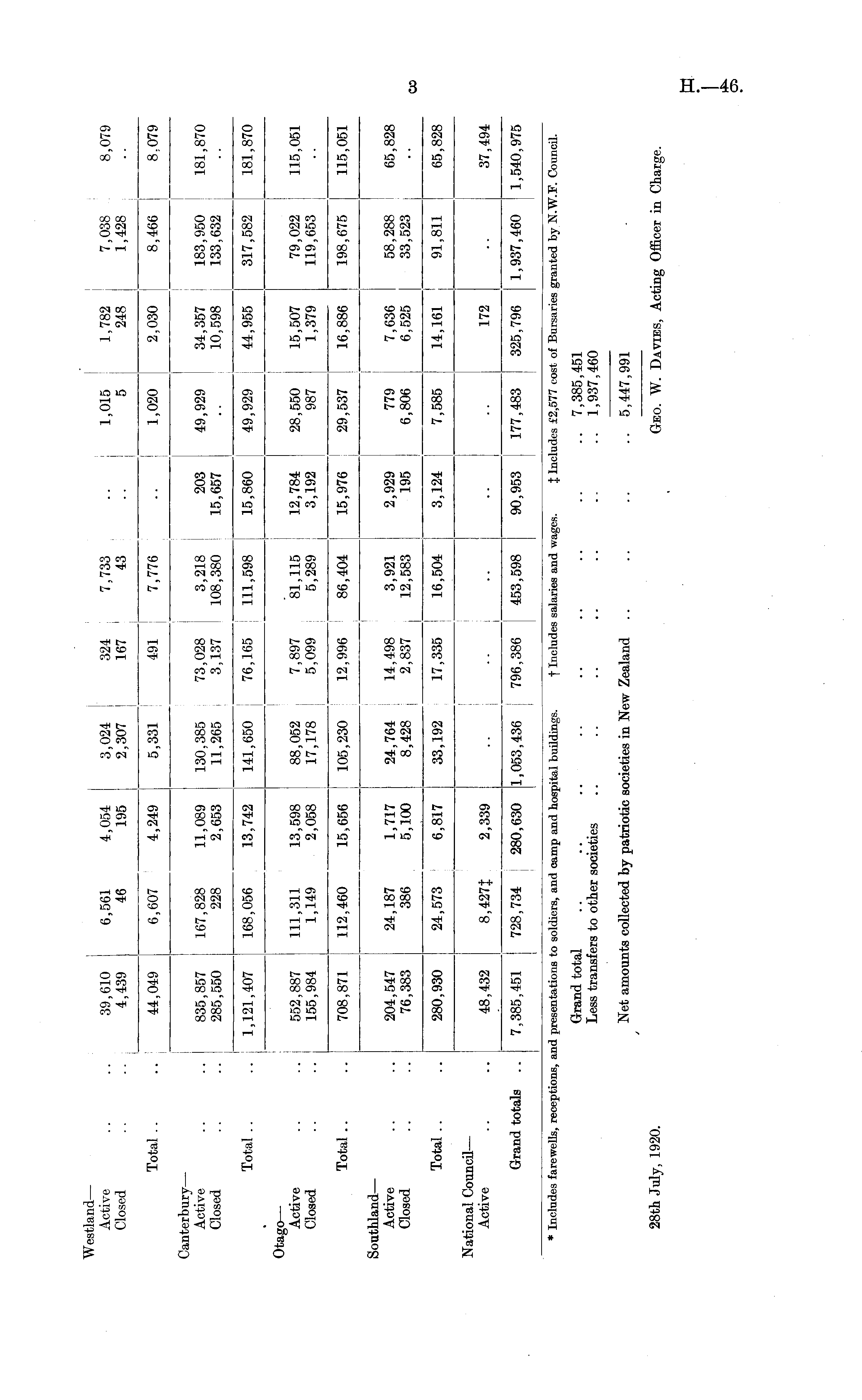 Grand total .. .. .. .. .. .. .. .. .. 7,385,451 Less transfers to other societies .. .. .. .. .. .. .. 1,937, 460 Net amounts collected by patriotic societies in New Zealand .. .. . . .. 5,447, 991 28th July, 1920. Geo. W. Davies, Acting Officer in Charge.