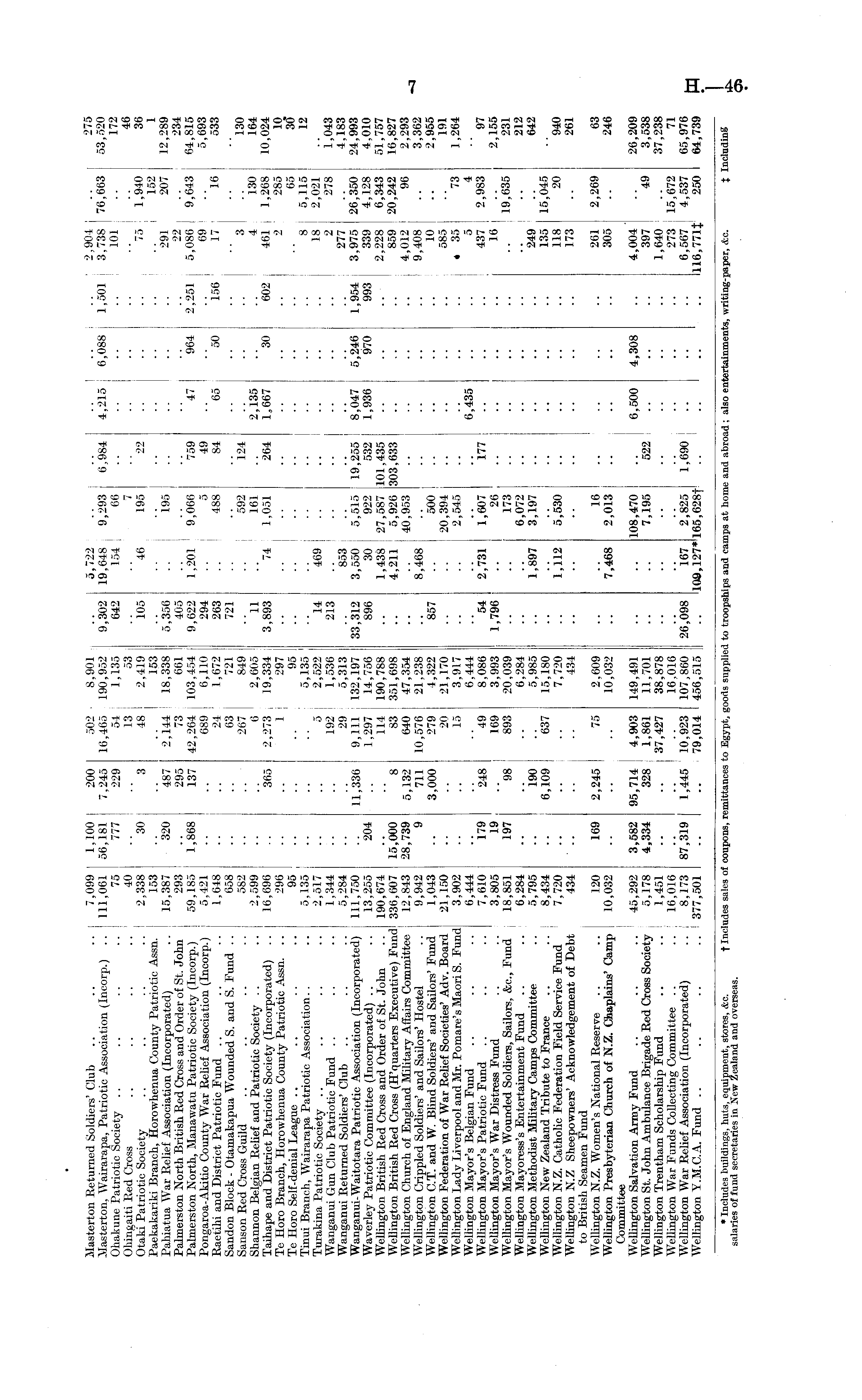 Masterton Returned Soldiers' Club .. .. .. 7,099 Masterton, Wairarapa, Patriotic Association (Incorp.) .. 111,061 Ohakune Patriotic Society .. .. .. .. 75 Ohingaiti Red Cross .. .. .. .. 40 Otaki Patriotic Society .. .. .. .. 2,338 Paekakariki Branch, Horowhenua County Patriotic Assn. 153 Pahiatua War Relief Association (Incorporated) .. 15,387 Palmerston North British Red Cross and Order of St. John 293 Palmerston North, Manawatu Patriotic Society (Incorp.) 59,185 Pongaroa-Akitio County War Rehef Association (Incorp.) 5,421 Raetihi and District Patriotic Fund .. .. .. 1,648 Sandon Block - Otamakapua Wounded S. and S. Fund .. 658 Sanson Red Cross Guild .. .. .. .. 582 Shannon Belgian Rehef and Patriotic Society .. .. 2,599 Taihape and District Patriotic Society (Incorporated) .. 16,696 Te Horo Branch, Horowhenua County Patriotic Assn. .. 296 Te Horo Self-denial League .. .. .. .. 95 Tinui Branch, Wairarapa Patriotic Association.. .. 5,135 Turakina Patriotic Society .. .. .. .. 2,517 Wanganui Gun Club Patriotic Fund . . .. .. 1,344 Wanganui Returned Soldiers' Club .. .. -. 5,284 Wanganui-Waitotara Patriotic Association (Incorporated) 111,750 Waverley Patriotic Committee (Incorporated) .. .. 13,255 Wellington British Red Cross and Order of St. John .. 190,674 Wellington British Red Cross (H'quarters Executive) Fund 336,607 Wellington Church of England Military Affairs Committee 12,843 Wellington Crippled Soldiers' and Sailors' Hostel .. 9,942 Wellington C.T. and W. Bhnd Soldiers' and Sailors' Fund 1,043 Wellington Federation of War Rehef Societies' Adv. Board 21,150 Wellington Lady Liverpool and Mr. Pomare's Maori S. Fund 3,902 Wellington Mayor's Belgian Fund .. .. .. 6,444 Wellington Mayor's Patriotic Fund .. .. .. 7,610 Wellington Mayor's War Distress Fund .. .. 3,805 Wellington Mayor's Wounded Soldiers, Sailors, &c., Fund 18,851 Wellington Mayoress's Entertainment Fund .. .. 6,284 Wellington Methodist Military Camps Committee .. 5,795 Wellington New Zealand Tribute to France .. .. 8,434 Wellington N.Z. Catholic Federation Field Service Fund 7,720 Welhngton N.Z Sheepowners' Acknowledgement of Debt 434 to British Seamen Fund Welhngton N.Z. Women's National Reserve .. .. 120 Wellington Presbyterian Church of N.Z. Chaplains' Camp 10,032 Committee Wellington Salvation Army Fund .. .. .. 45,292 Welhngton St. John Ambulance Brigade Red Cross Society 5,178 Wellington Trentham Scholarship Fund .. .. 1,451 Wellington War Funds Collecting Committee .. .. 16,016 Wellington War Rehef Association (Incorporated) .. ( 8,173 Wellington Y.M.C.A. Fund .. .. .. ..1377,501 1,100 56,181 777 30 320 1,868 204 15,000 28,739 9 200 502 i 8,901 7,245 16,465 190,952 229 54 1,135 13 53 3 48 2,419 153 487 2,144 18,338 295 73 661 137 42,264 103.4.54 689 6,110 24 1,672 63 721 267 849 6 2,605 365 2,273 j 19,334 1 297 95 5,135 5 j 2,522 192 1,536 29 5,313 11,336 9,111 132,197 1,297 14,756 114 190,788 8 83 351,698 5,132 640 47,354 711 10,576 21,238 3,000 279 4,322 20 21,170 15 3,917 6,444 248 49 8,086 169 3,993 98 893 20,039 6,284 190 .. 5,985 6,109 637 15,180 7,720 434 9,302 642 105 5,356 405 9,622 294 263 721 11 3,893 14 213 33,312 896 5,722 19,648 9,293 154 ! 66 46 | 195 '.. 195 1,201 9,066 5 488 '.'. 592 161 74 1,051 469 853 3,550 5,515 30 922 1,438 27,587 ] 4,211 5,926 I 40,953 8,468 500 20,394 2,545 2,731 1,607 26 173 6,072 1,897 3,197 1,112 5,530 2.904 6,984 4,215 6,088 1,501 3,738 76,663 101 22 '.'. '.'. '.'. 75 1,940 152 291 207 22 759 47 964 2,251 5,086 9,643 49 .. .. .. 69 84 65 50 156 17 16 'l24 " '.'. '.'. 3 2,135 .. .. 4 130 264 1,667 30 602 461 1,268 2 285 65 8 5,115 18 2,021 2 278 277 19,255 8,047 5,246 1,954 3,975 26,350 532 1,936 970 993 339 4,128 101,435 .. .. .. 2,228 6,343 303,633 .. .. .. 859 20,242 4,012 96 9,408 10 585 « 35 73 6,435 .. .. 5 4 177 .. .. 437 2,983 16 19,635 135 15,045 118 20 173 275 53,520 172 46 36 1 12,289 234 64,815 5,693 533 130 164 10,024 10 30' 12 1,043 4,183 24,993 4,010 51,757 16,827 2,293 3,362 2,955 191 1,264 857 179 19 197 54 1,796 97 2,155 231 212 642 940 261 169 2,245 75 2.609 10,032 16 7,468 2,013 108,470 7,195 167 2,825 109,127* 165,628f 261 2,269 305 6,500 4,308 .. 4,004 522 .. .. 397 49 1,640 273 15,672 1,690 .. .. .. 6,567 ! 4,537 116,771$ 250 63 246 3,582 4,334 95,714 I 4,903 149,491 328 1,861 11,701 i 37,427 38,878 16,016 1,445 10,923 107,860 79,014 456,515 26,209 3,538 37,238 71 65,976 64,739 87,319 26,098 * Includes buildings, huts, equipment, stores, &c. salaries of fund secretaries in Xew Zealand and overseas. t Includes sales of coupons, remittances to Egypt, goods supplied to troopships and camps at home and abroad ; also entertainments, writing-paper, &c. J Including
