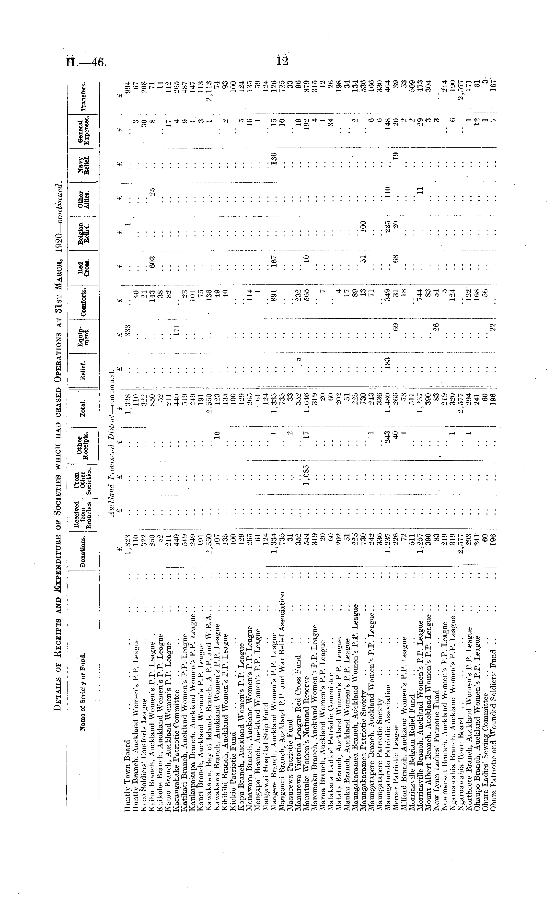 Ifame of Society or Fund. Received Donations. from Branches From Other Societies. Other Receipts. Total. ■ Relief. Equipment. Comforts. *£ Belgian Relief. Other Allies. Navy Relief. General Expenses. Transfers. Huntly Town Board .. .. .. Huntly Branch, Auckland Women's P.P. League Kaeo Soldiers' Comforts League Kaihu Branch, Auckland Women's P.P. League Kaikohe Branch, Auckland Women's P.P. League Kamo Branch, Auckland Women's P.P. League Karangahake Patriotic Committee Katikati Branch, Auckland Women's P.P. League Kaukapakapa Branch, Auckland Women's P.P. League. . Kauri Branch, Auckland Women's P.P. League Kawakawa, Bay of Islands Branch, A.P.P. and W.R.A.. . Ka.waka.wa Branch, Auckland Women's P.P. League Kihikihi Branch, Auckland Women's P.P. League Kiokio Patriotic Fund Kopu Branch, Auckland Women's P.P. League liana warn Branch, Auckland Women's P.P. League Mangapai Branch, Auckland Women's P.P. League Mangawai Hospital Ship Fund Mangere Branch, Auckland Women's P.P. League Mangonui Branch, Auckland P.P. and War Eelief Association Manurewa Patriotic Fund Manurewa Victoria League Red Cross Fund Ma nut like Women's National Reserve Maromaku Branch, Auckland Women's P.P. League Mania Branch, Auckland Women's P.P. League Matakana Ladies' Patriotic Committee Matata Branch, Auckland Women's P.P. League Mauku Branch, Auckland Women's P.P. League Maungakaramea Branch, Auckland Women's P.P. League Maungakaramea Patriotic Society Maungatapere Branch, Auckland Women's P.P. League. . Maungatapere Patriotic Society Maungaturoto Patriotic Association Mercer Patriotic League .. .. .. .: Milford Branch, Auckland Women's P.P. League Morrinsville Belgian Relief Fund Morrinsville Branch. Auckland Women's P.P. League Mount Albert Branch, Auckland Women's P.P. League .. New Lynn Ladies' Patriotic Fund Newmarket Branch. Auckland Women's P.P. League Ngaruawahia Branch, Auckland Women's P.P. League .. Ngaruawahia Town Board Northeote Branch, Auckland Women's P.P. League Ohaupo Branch, Auckland Women's P.P. League Ohura Ladies' Sewing Committee Ohura Patriotic and Wounded Soldiers' Fund I i £ 1,328 110 322 850 52 211 440 519 249 191 2,550 107 135 100 129 265 61 124 ] ,334 735 31 352 544 319 20 60 202 51 225 730 242 336 1.237 226 72 511 1,257 390 83 219 319 2,577 293 241 60 196 Auckland Provincial District —continued. £ , £ £ , £ . £ 1.328 110 322 850 i 52 211 .. 440 ;.. 519 249 ■ .. 191 2.550 16 123 135 100 129 265 124 1 1.335 735 2 33 352 ,5 1.085 17 1.646 319 20 202 51 225 730 1 243 ' 336 I 243 1,480 ' 183 40 266 1 -73 511 i 1,257 390 , .. 83 219 1 320 2,577 1 294 241 60 .. — 196 £ 333 171 69 "26 "22 "40 j 24 143 38 82 23 101 75 436 49 40 114 891 232 565 7 4 17 89 43 71 349 31 18 744 83 54 5 124 122 168 56 £ 603 167 10 51 68 £ 100 225 20 25 ho 11 £ 136 "l9 £ 3 30 8 4 9 3 | 1 5 ■ 16 15 10 19 192 4 1 34 2 6 6 148 20 2 29 3 3 6 1 12 1 7 £ 994 67 268 71 14 112 265 487 147 113 2,113 74 93 100 124 135 59 124 126 725 33 96 879 315 12 26 198 34 134 536 166 330 464 39 53 509 473 304 214 190 2,577 171 61 3 167'