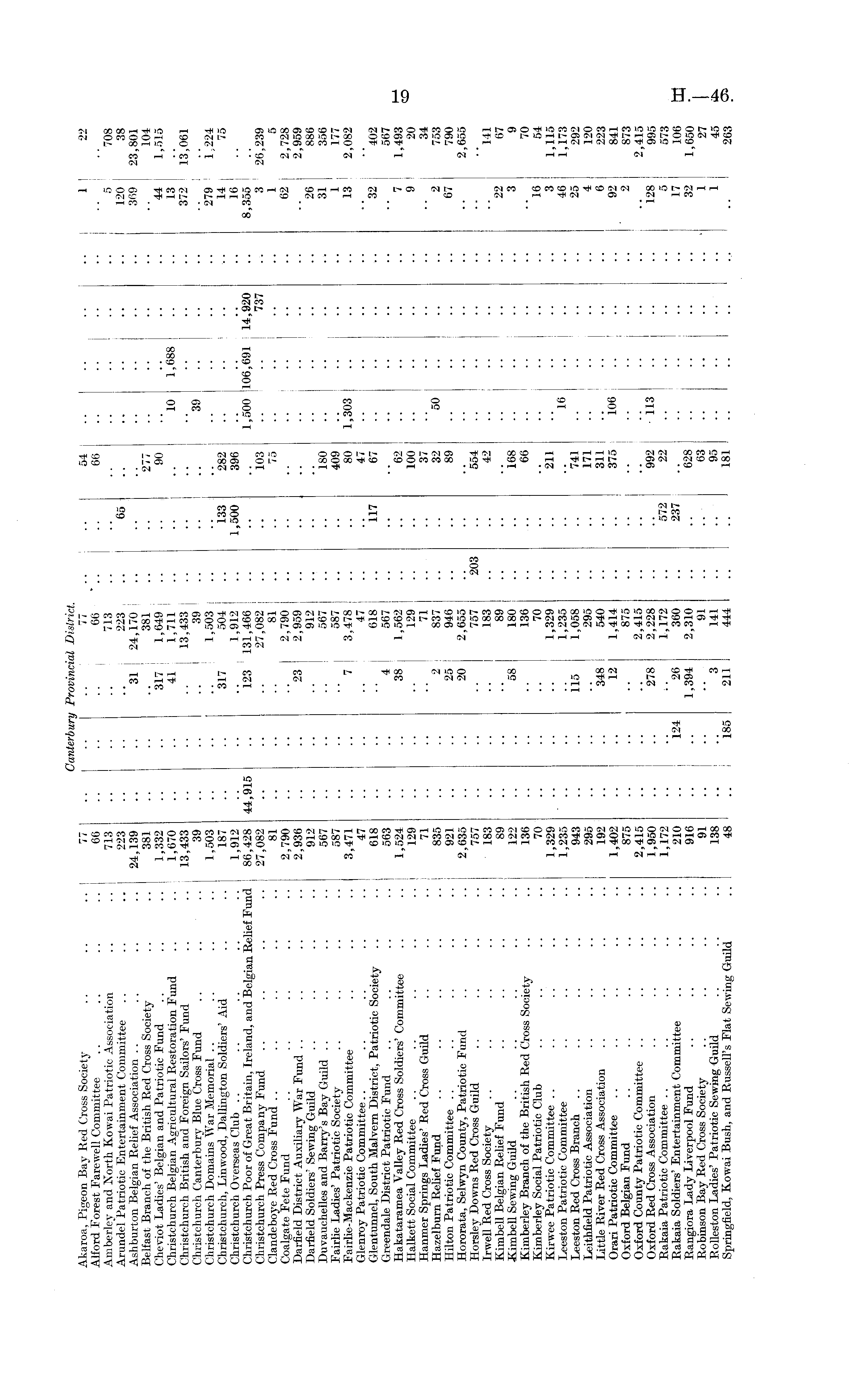 lanterbur '-'■■'! Provincial District. 77 ; 66 713 223 31 24,170 381 317 1,649 41 ■ 1,711 13,433 39 1,503 317 504 1,912 123 ' 131,466 27,082 81 2,790 23 2,959 912 567 587 7 3,478 47 618 4 567 38 1,562 129 71 2 837 25 946 20 2,655 757 183 89 58 180 136 70 1,329 1,235 115 1,058 295 348 i 540 12 1,414 875 2,415 278 2,228 1,172 26 360 1,394 2,310 91 3 141 211 444 203 Akaroa, Pigeon Bay Red Cross Society Alford Forest Farewell Committee Amberley and North Kowai Patriotic Association Arundel Patriotic Entertainment Committee Ashburton Belgian Rehef Association Belfast Branch of the British Red Cross Society Cheviot Ladies' Belgian and Patriotic Fund Christchurch Belgian Agricultural Restoration Fund Christchurch British and Foreign Sailors' Fund Christchurch Canterbury Blue Cross Fund Christchurch Domains War Memorial Christchurch, Linwood, Dallington Soldiers' Aid Christchurch Overseas Club Christchurch Poor of Great Britain, Ireland, and Belgian Relief Fund Christchurch Press Company Fund Clandeboye Red Cross Fund Coalgate Fete Fund Darfield District Auxiliary War Fund Darfield Soldiers' Sewing Guild Duvauchelles and Barry's Bay Guild Fairlie Ladies' Patriotic Society Fairlie-Mackenzie Patriotic Committee Glenroy Patriotic Committee Glentunnel, South Malvern District, Patriotic Society Greendale District Patriotic Fund Hakataramea Valley Red Cross Soldiers' Committee Halkett Social Committee Hanmer Springs Ladies' Red Cross Guild Hazelburn Relief Fund Hilton Patriotic Committee Hororata, Selwyn County, Patriotic Fund Horslev Downs Red Cross Guild Irwell Red Cross Society Kimbell Belgian Relief Fund Kimbell Sewing Guild Kimberle}' Branch of the British Red Cross Society Kimberley Social Patriotic Club Kirwee Patriotic Committee Leeston Patriotic Committee Leeston Red Cross Branch Leithfield Patriotic Association Little River Red Cross Association Orari Patriotic Committee Oxford Belgian Fund Oxford County Patriotic Committee Oxford Red Cross Association Rakaia Patriotic Committee Rakaia Soldiers' Entertainment Committee Rangiora Lady Liverpool Fund Robinson Bay Red Cross Society Rolleston Ladies' Patriotic Sewing Guild Springfield, Kowai Bush, and Russell's Flat Sewing Guild 77 66 713 223 24,139 381 1,332 1,670 13,433 39 1.503 187 1,912 86,428 27,082 81 2,790 2,936 912 567 587 3,471 47 618 563 1,524 129 71 835 921 2,635 757 183 89 122 136 70 1,329 1,235 943 295 192 1,402 875 2,415 1,950 1,172 210 916 91 138 48 44,915 ■ "65 133 1,500 117 54 66 277 90 *282 396 103 75 180 409 80 47 67 62 100 37 32 89 '■ ■■ 10 "39 "" 1,500 1,303 : .. 1,688 .. .. .. . .. 106,691 14,920 737 .. i 1 I 22 5 708 120 38 369 23,801 104 44 1,515 13 372 13,061 279 I 1.224 14 75 16 8,355 3 26,239 1 5 62 2,728 2,959 26 886 31 356 1 177 13 2,082 32 402 567 7 1,493 9 20 34 2 753 67 790 2,655 "SO 554 42 1 141 22 67 3 9 *68 66 .. .. ■■ 211 741 171 311 375 "l6 106 113 .. .. 70 16 54 3 1,115 46 1,173 25 292 4 120 6 223 92 841 2 873 2,415 128 995 5 573 17 106 32 1,650 1 27 1 45 263 124 572 237 992 22 .. 628 63 95 181 " .. 185 :