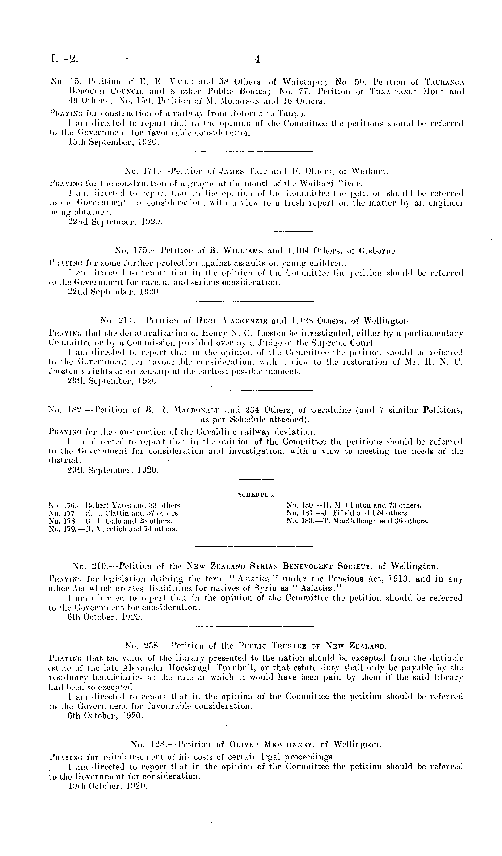 No. 214. —Petition of lluuir Mackenzie and 1,128 Others, of Wellington. Praying that the denaturalization of Henry N. C. Joosten be investigated, either by a parliamentary Committee or by a Commission presided over by a Judge of the Supreme Court. I am directed to report that in the opinion of the Committee the petition should be referred to the Government for favourable consideration, with a view to the restoration of Mr. H. N. C. Joosten's rights of citizenship at the earliest possible moment. 29th September, 1920,