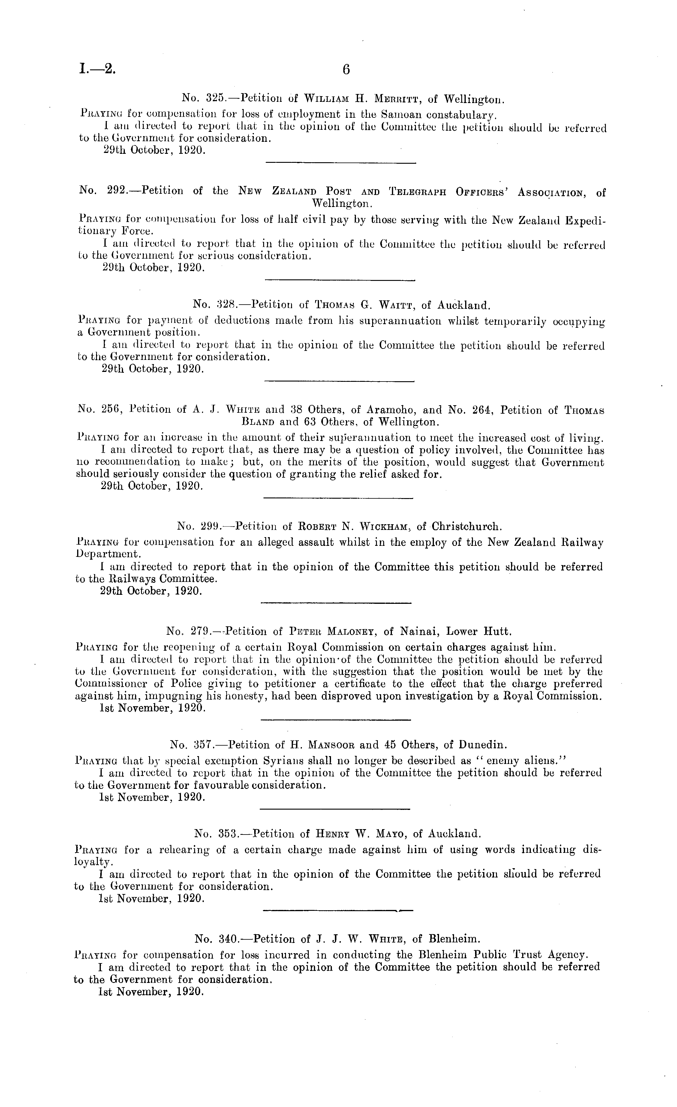 No. 325. —Petition of William H. Merritt, of Wellington. Praying for compensation for loss of employment in the Samoan constabulary. 1 am directed to report that in the opinion of the Committee the petition should be referred to the Government for consideration. 29th October, 1920.