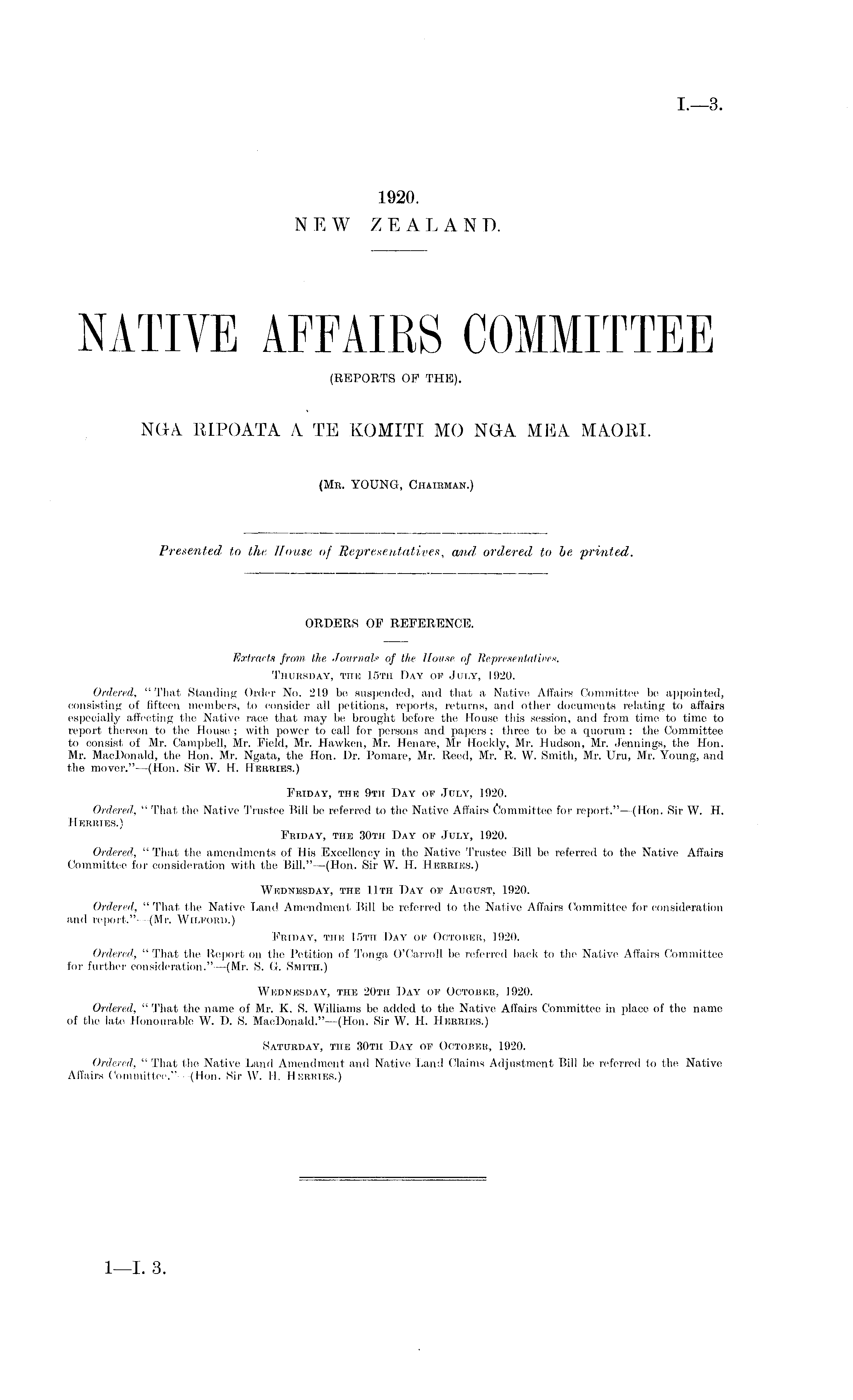 ORDERS OF REFERENCE. Extracts from the ■Journal.'' of the House of Representatives. Thursday, the 15th Day oi? July, 1920. Ordered, "That Standing Order No. 219 be suspended, and that a Native Affairs Committee be appointed, consisting of fifteen members, to consider all petitions, reports, returns, and other documents relating to affairs especially affecting the Native race that may be brought before the House this session, and from time to time to report thereon to the House ; with power to call for persons and papers ; three to be a quorum : the Committee to consist of Mr. Campbell, Mr. Field, Mr. Hawken, Mr. Henare, Mr Hockly, Mr. Hudson, Mr. Jennings, the Hon. Mr. Mac Donald, the Hon. Mr. Ngata, the Hon. Dr. Pomare, Mr. Reed, Mr. R. W. Smith, Mr. Uru, Mr. Young, and the mover." —(Hon. Sir W. H. Hermes.) Friday, the 9th Day of July, 1920. Ordered, " That the Native Trustee Bill be referred to the Native Affairs Committee for report." —(Hon. Sir W. H. Herrt.es.) Friday, the 30th Day of July, 1920. Ordered, " That the amendments of His Excellency in the Native Trustee Bill be referred to the Native Affairs Committee for consideration with the Bill."—(Hon. Sir W. H. Hurries.) Wednesday, the Uth Day of August, 1920. Ordered, " That the Native Land Amendment Bill be referred to the Native Affairs Committee for consideration and report."—(Mr. Wilforii.) Friday, the 15th Day of October, 1920. Ordered, " That the Report on the Petition of Tonga O'Carroll be referred back to the Native Affairs Committee for further consideration." —(Mr. S. G. Smith.) Wednesday, the 20th Day of October, 1920. Ordered, " That the name of Mr. K. S. Williams be added to the Native Affairs Committee in place of the name of the late Honourable W. D. S. MacDonald."—(Hon. Sir W. H. Hermes.) Saturday, the 30th Day of October, 1920. Ordered, "That the Native Land Amendment and Native Land Claims Adjustment Bill be referred to the Native Affairs Committee," —(Hon. Sir W. 11. Heermes.)